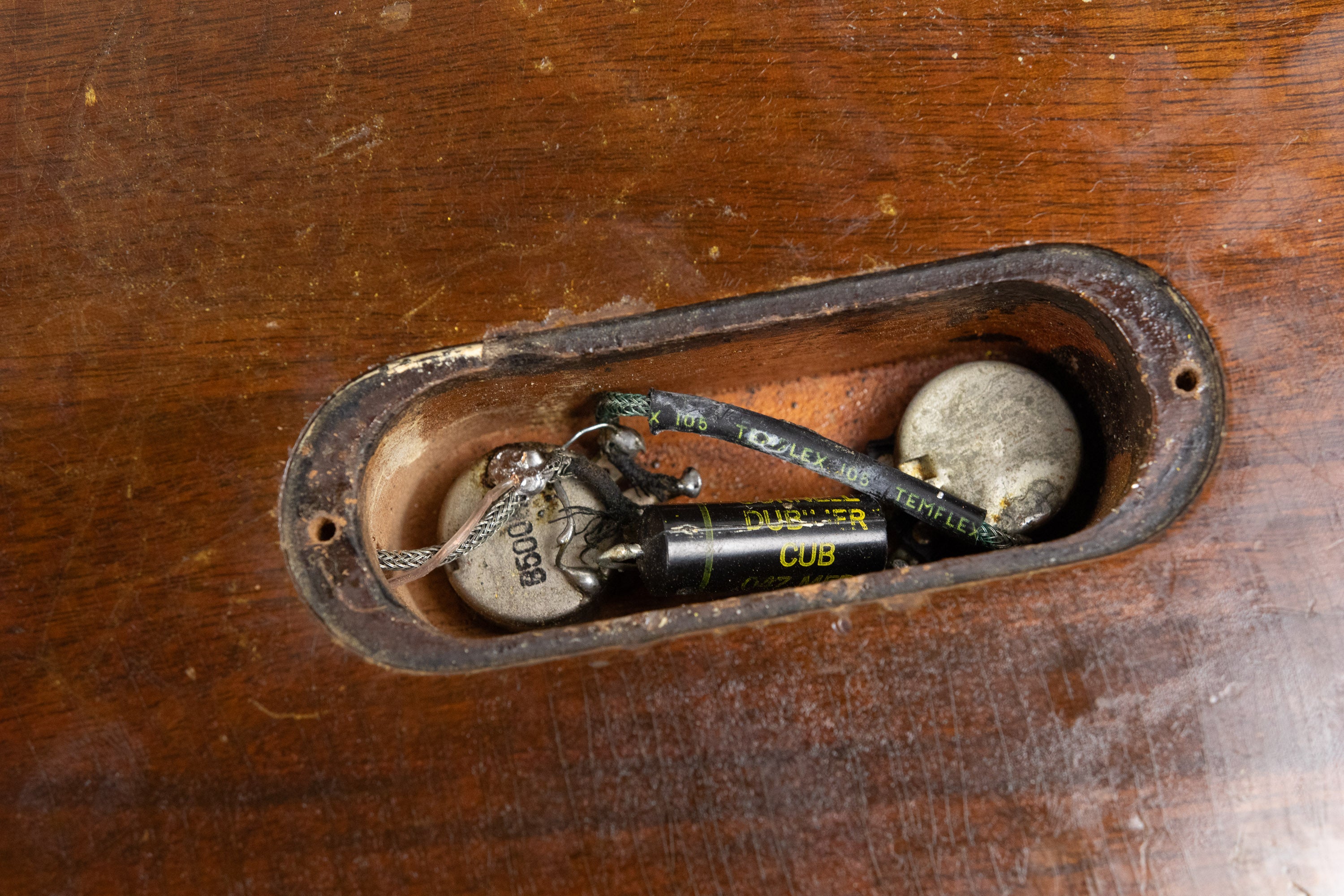 Electronics are centred around a single P-90 pickup, controlled by straightforward volume and tone controls. All components have been changed over the years: the volume pot and capacitor, knobs, tuners, wraparound bridge and studs (now chrome) and a rewound P90 pickup. The headstock bears the original Gibson logo and an unusual/non-original Les Paul decal on the headstock in place of the original silkscreen.