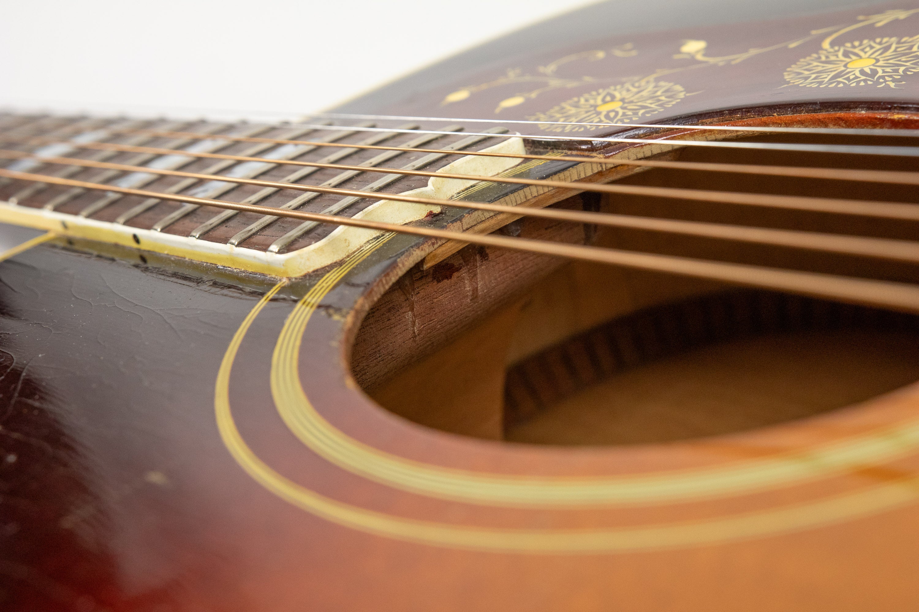 The guitar retains its closed moustache rosewood bridge, now fitted with a replaced rosewood insert and a new compensated saddle. Inside the soundhole is a correct orange “Union Made” Gibson label with model and serial number. There is some cosmetic untidiness beneath the label.