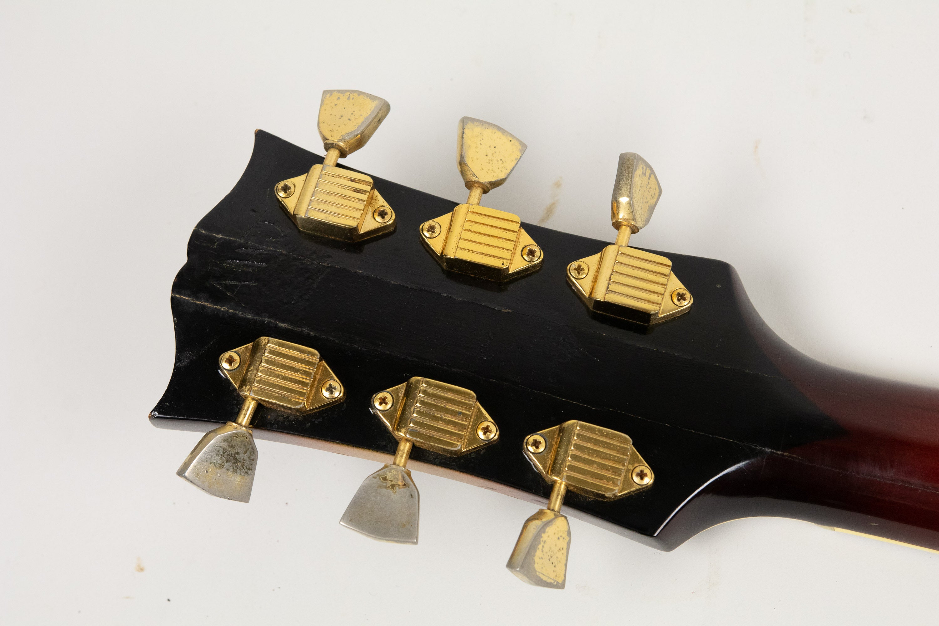 This example has a factory-applied stinger to the rear of the headstock. There is, however, some localised finish disturbance in this area where a previous owner attempted to carve their initials (“AHJ”) into the back of the headstock. Inside the body, additional initials (“AJ”) have been marked with a pen, adding a piece of personal history to the instrument.