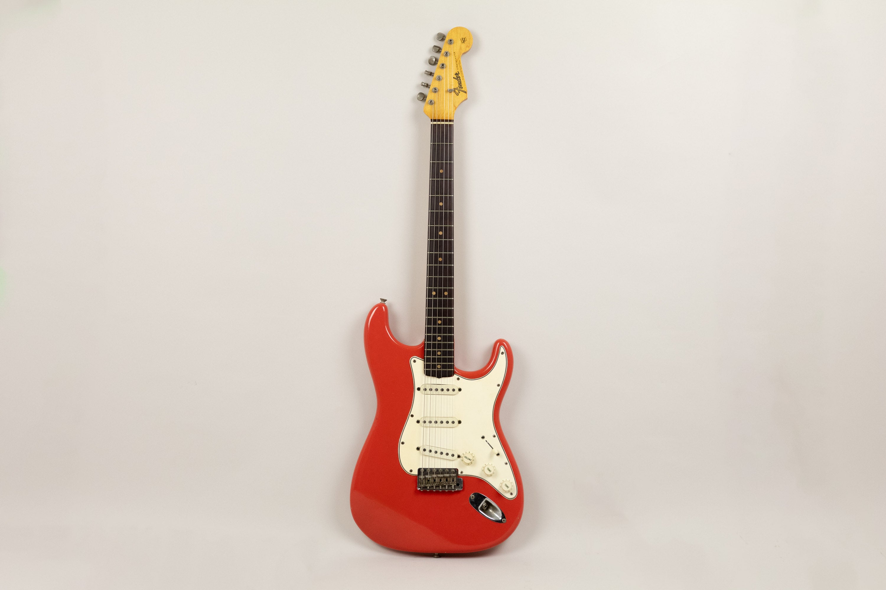 A particularly special and exceptionally clean transition model, this 1964/65 Fender Stratocaster in it's original Fiesta Red finish is a superb custom colour example from one of the most desirable periods of Fender production. Finished in its original Fiesta Red over a white undercoat on a yellow-dyed alder body, it has all the hallmarks collectors hope to see, and on inspection this one presents remarkably well throughout. With its transition logo, small headstock, rosewood fingerboard with clay dots, white three-ply guard and L-series neck plate, it captures a narrow crossover period as CBS gradually introduced changes to the model.