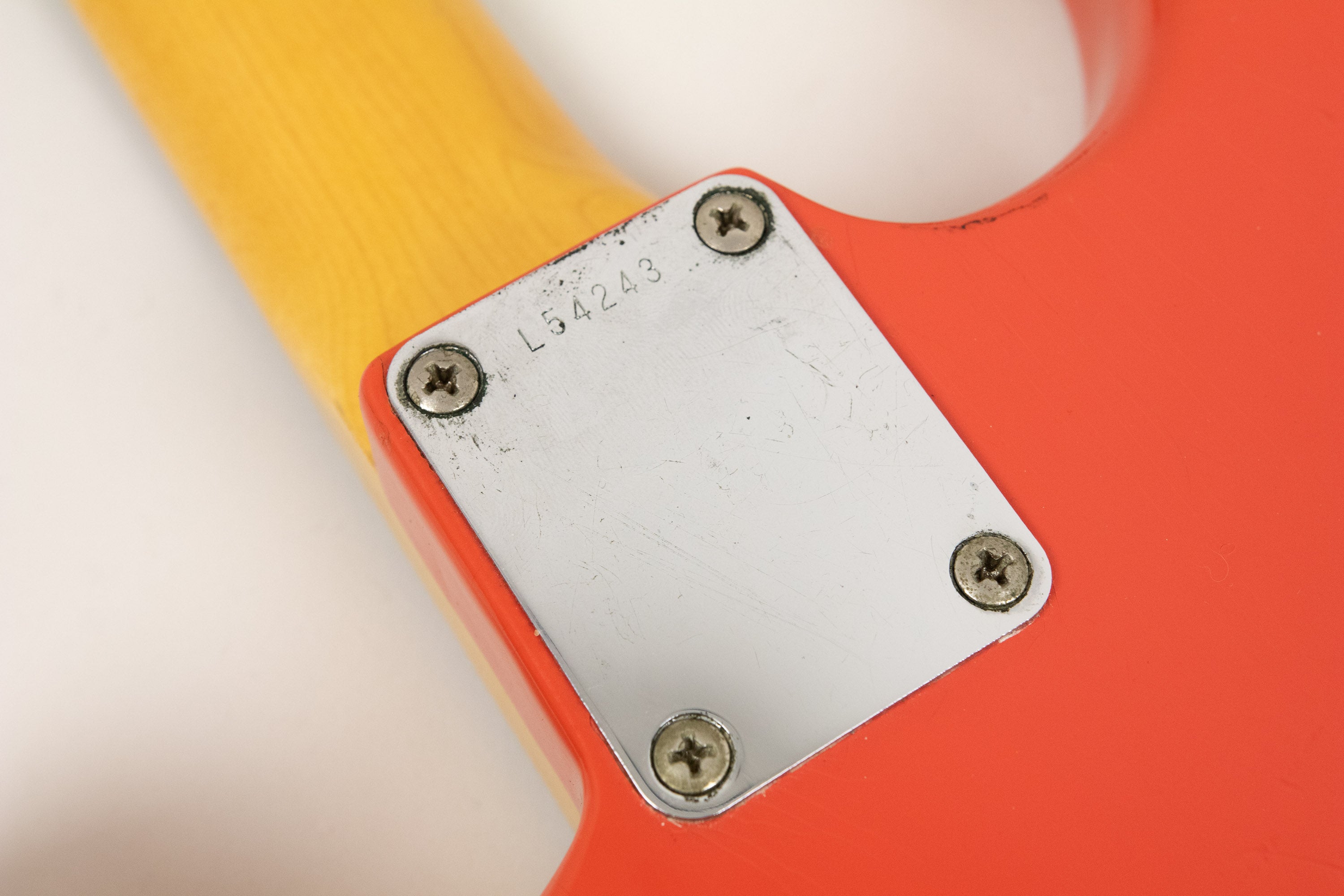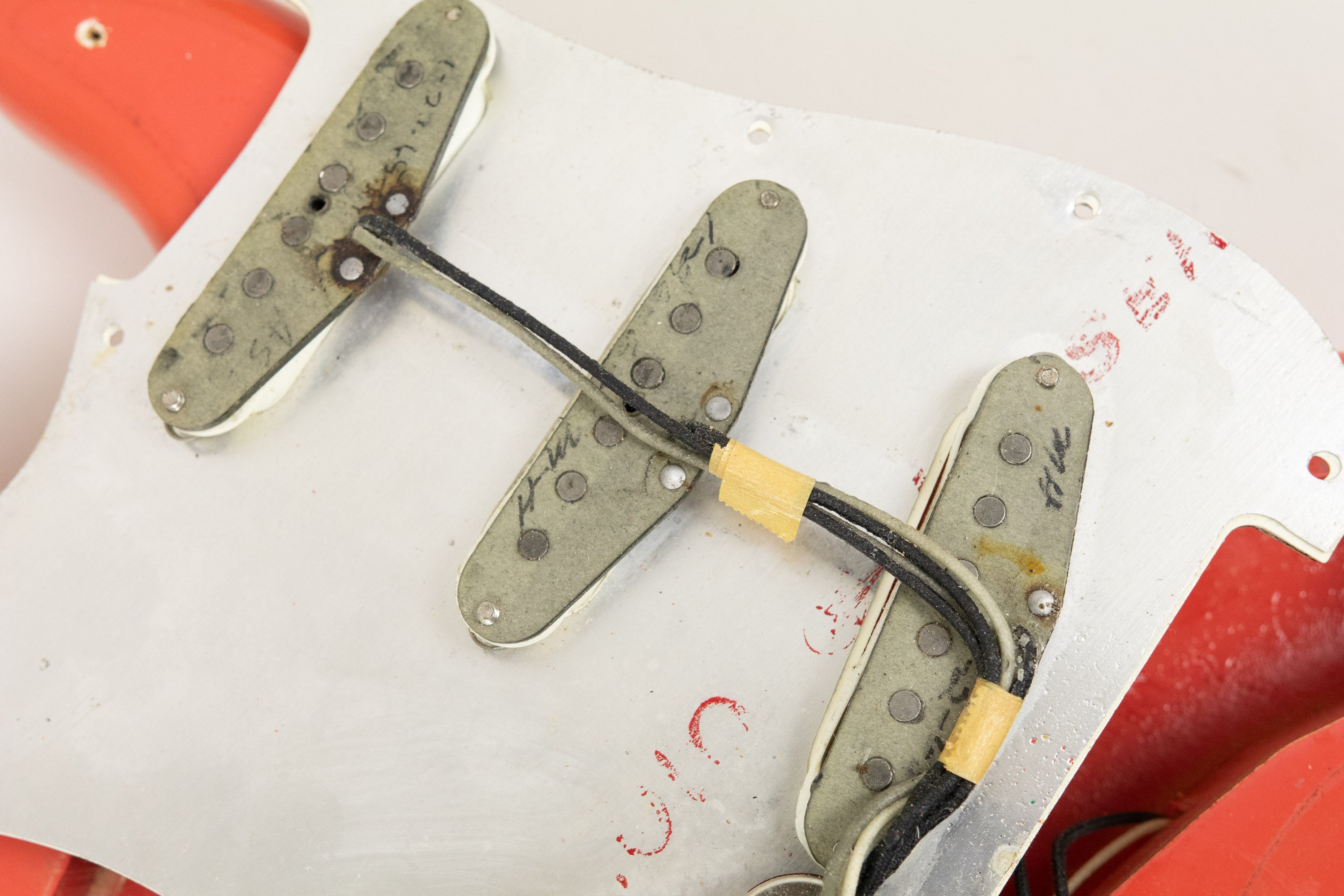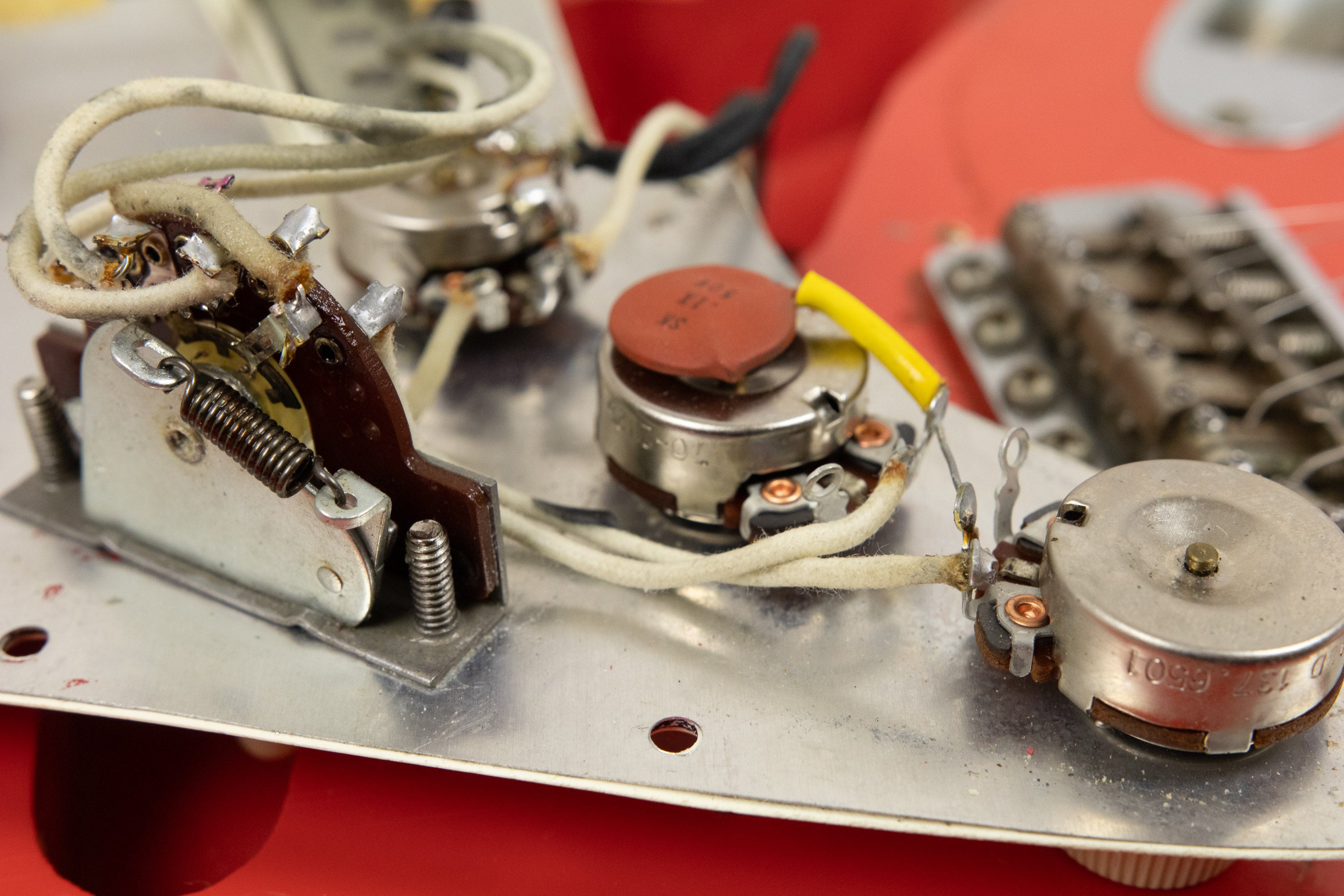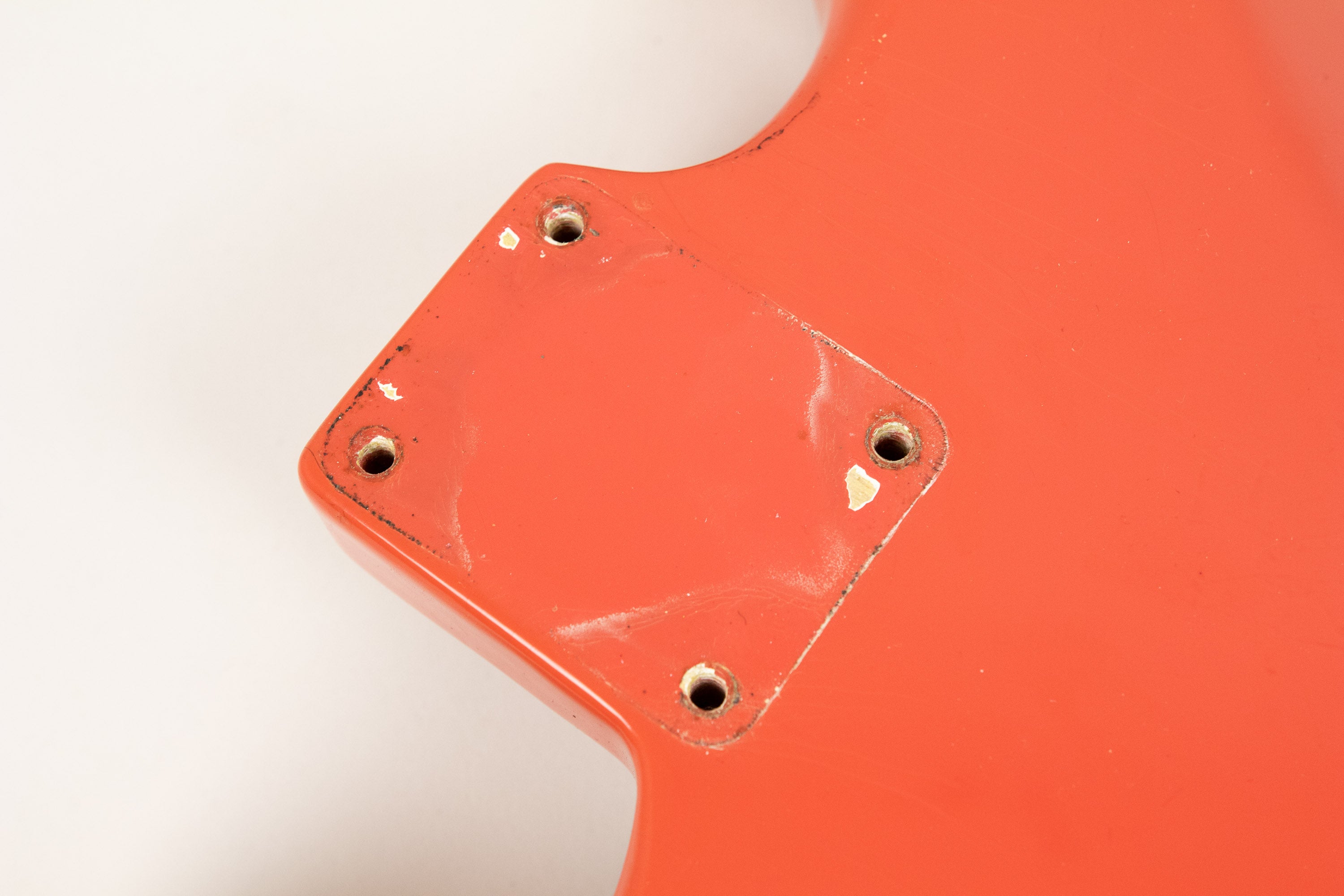 Constructionally and cosmetically, everything here points the right way. The body shows the correct white undercoat beneath the Fiesta Red topcoat, with the yellow-dyed alder body visible in the pocket as expected. The neck pocket looks excellent, the three nail holes are present and correct, and the routing details are all very reassuring, right down to the fuzz in the worm route. There is masking tape remnants in the neck pocket too revealing the white undercoat as is often seen, and the overall impression under the guard is of a guitar that has escaped the sort of invasive work so many others of this age have suffered. Even the neck bolts are notably tight, suggesting it has not been repeatedly apart over the years.