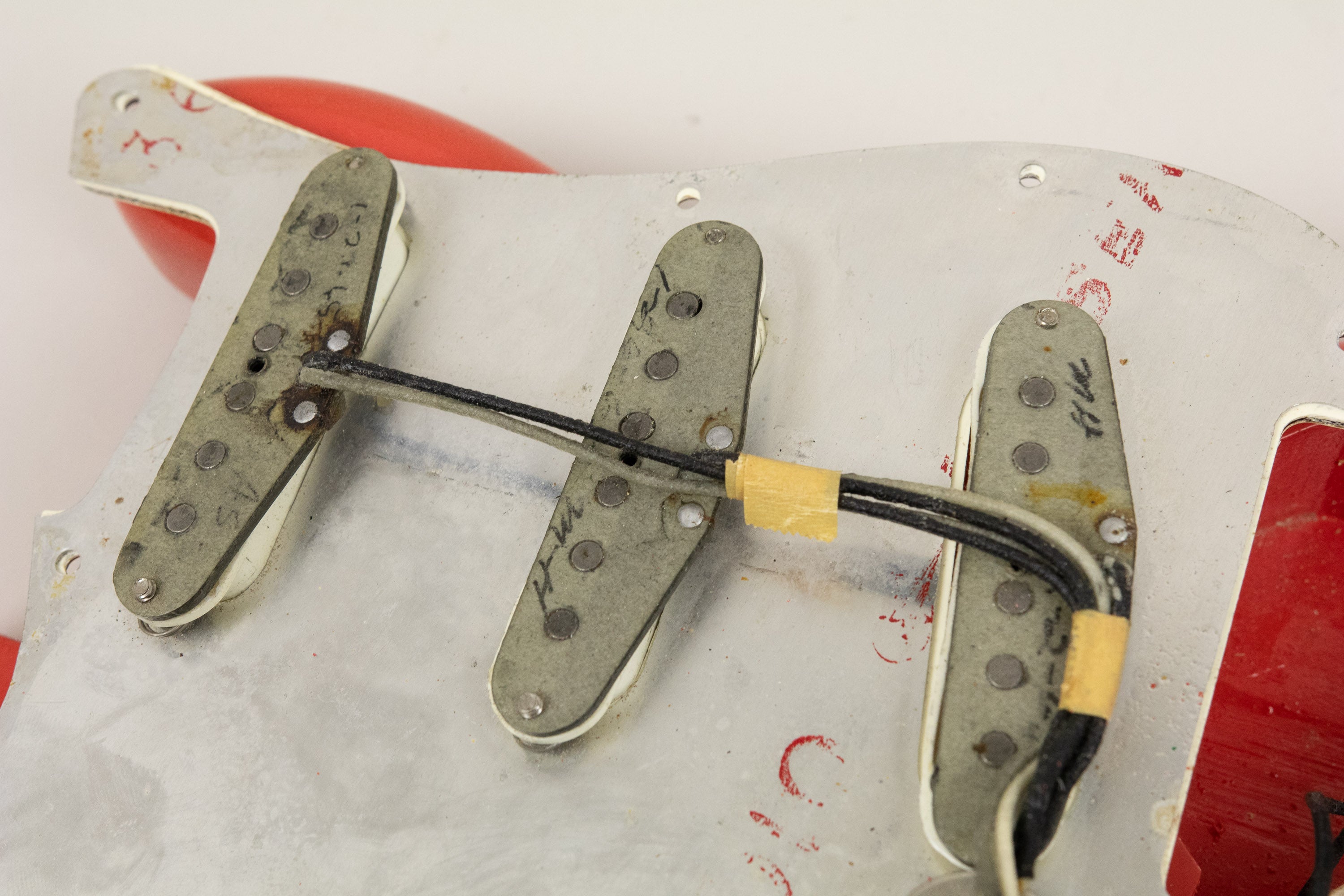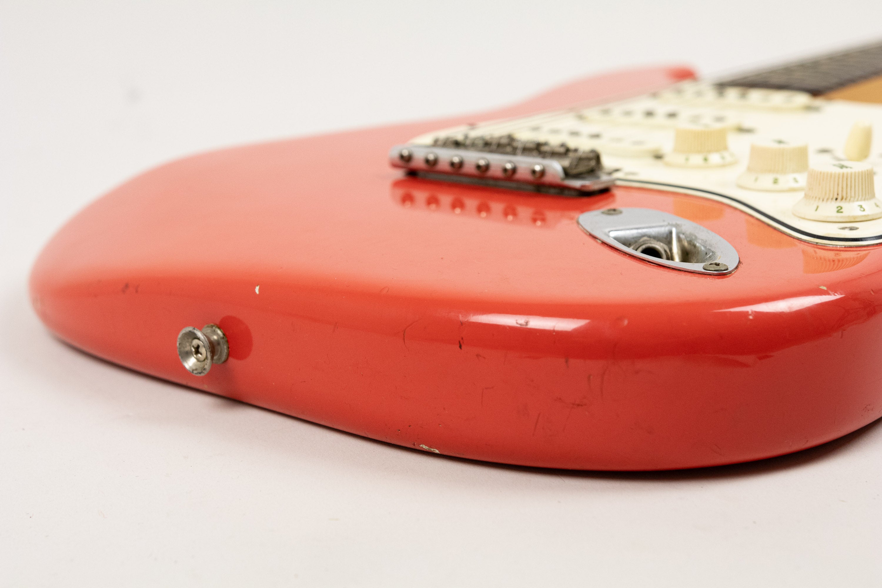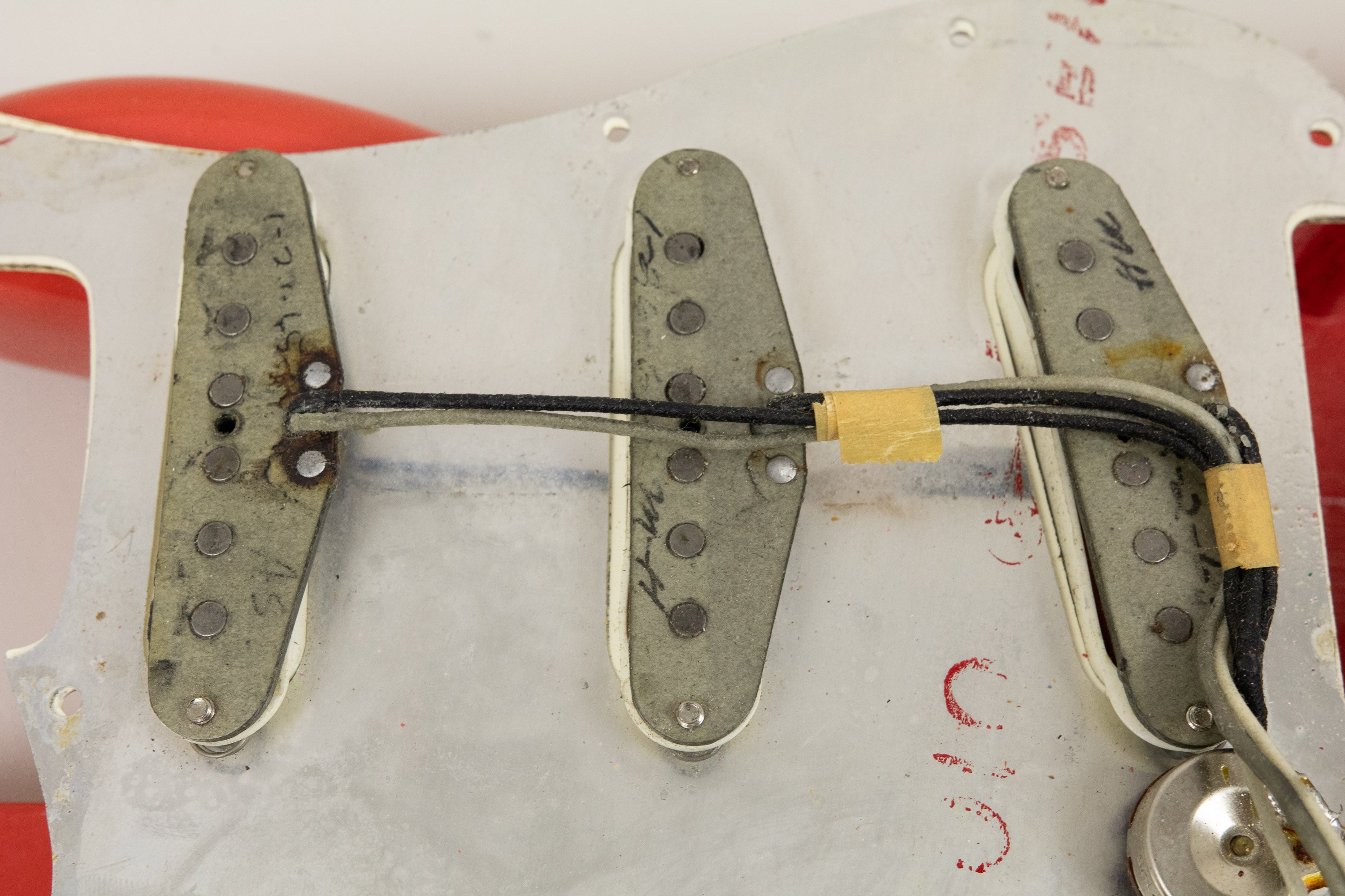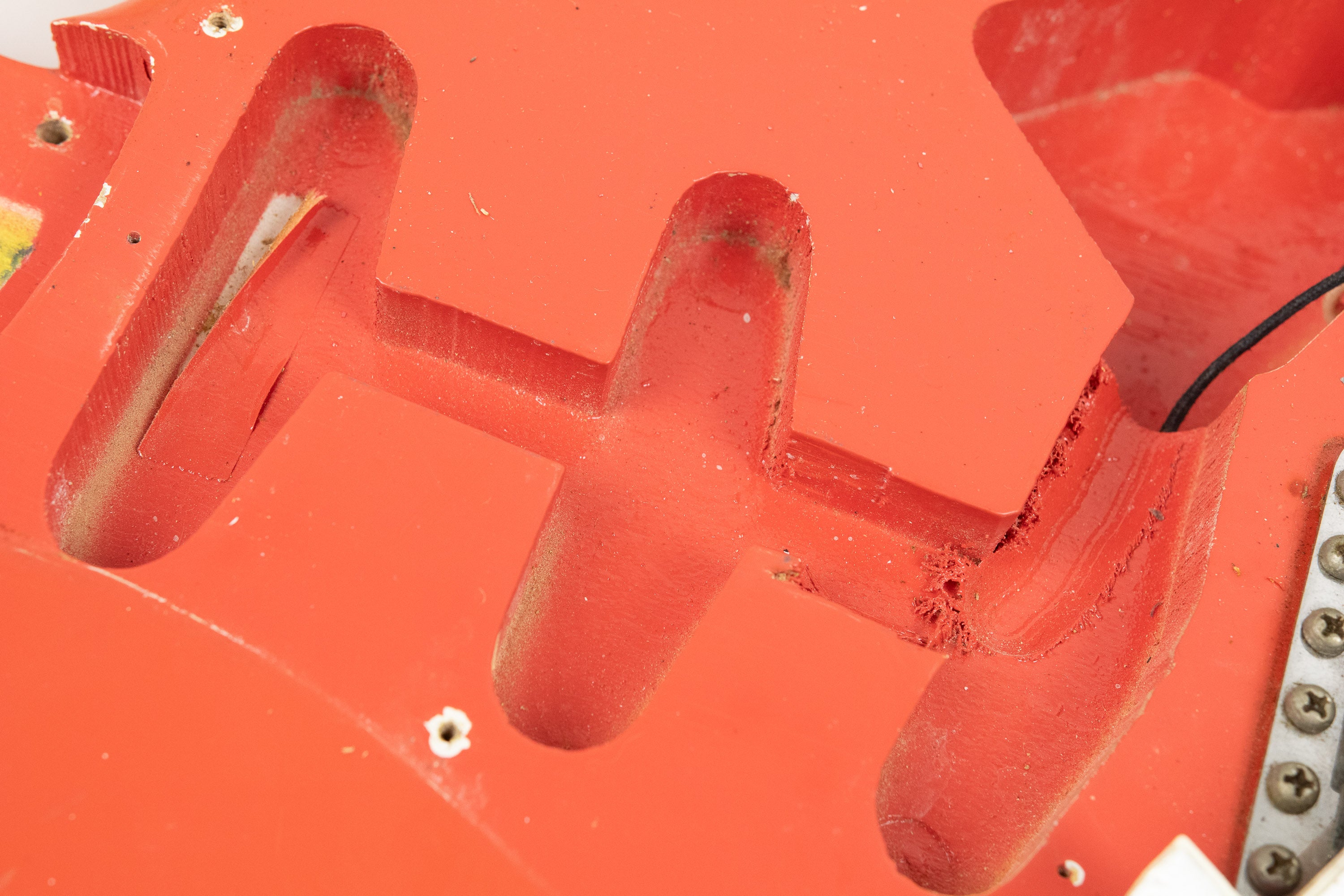 Constructionally and cosmetically, everything here points the right way. The body shows the correct white undercoat beneath the Fiesta Red topcoat, with the yellow-dyed alder body visible in the pocket as expected. The neck pocket looks excellent, the three nail holes are present and correct, and the routing details are all very reassuring, right down to the fuzz in the worm route. There is masking tape remnants in the neck pocket too revealing the white undercoat as is often seen, and the overall impression under the guard is of a guitar that has escaped the sort of invasive work so many others of this age have suffered. Even the neck bolts are notably tight, suggesting it has not been repeatedly apart over the years.