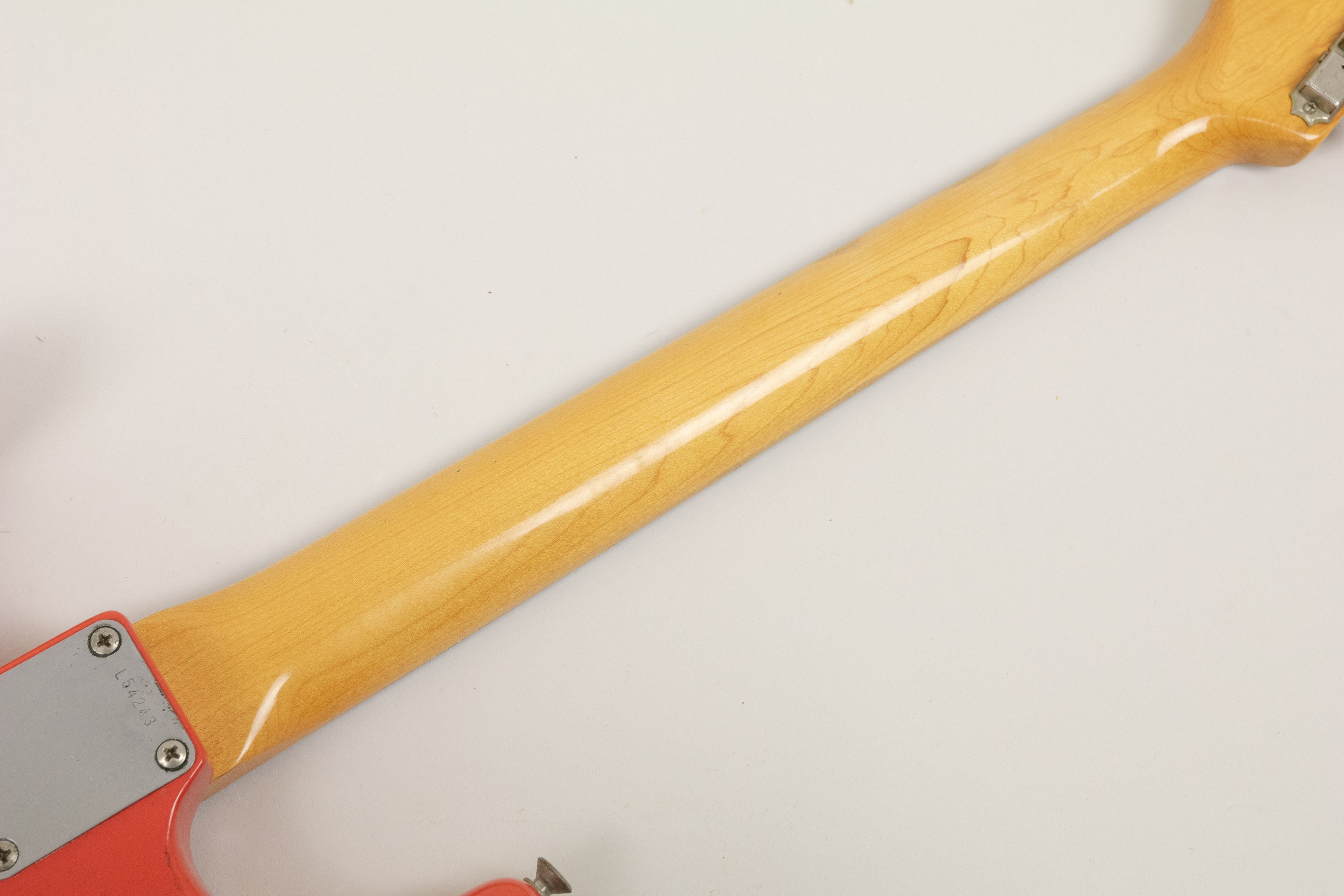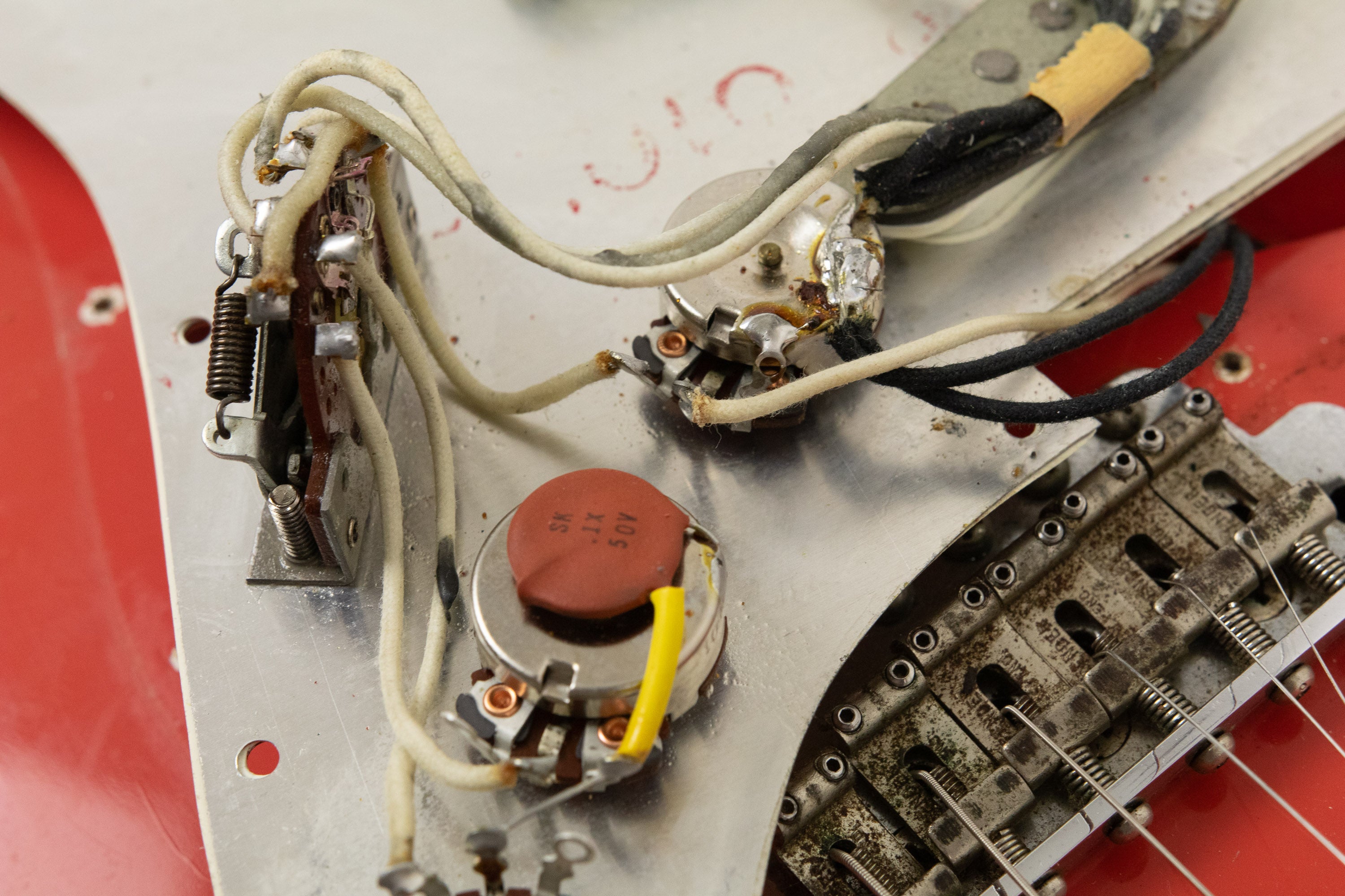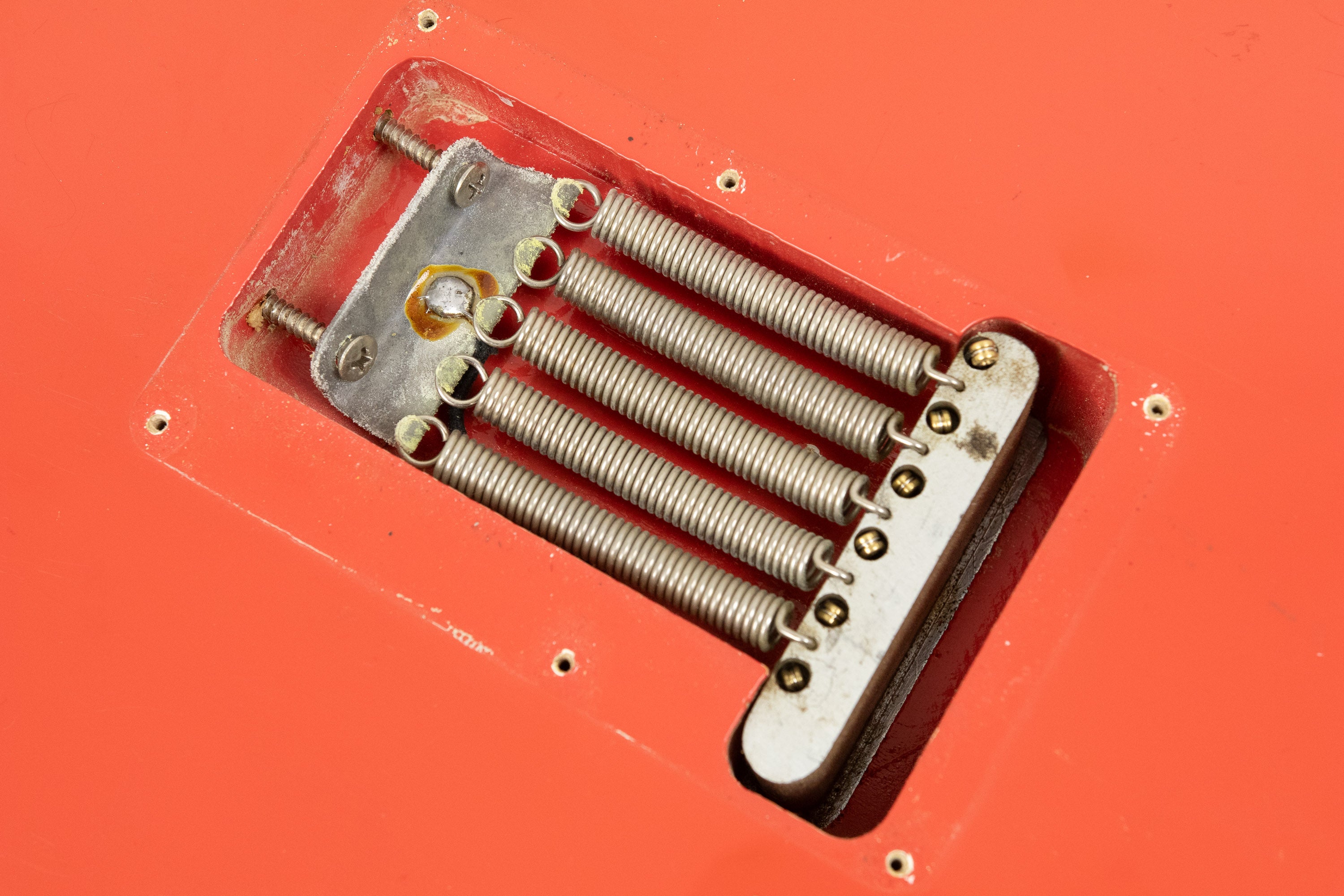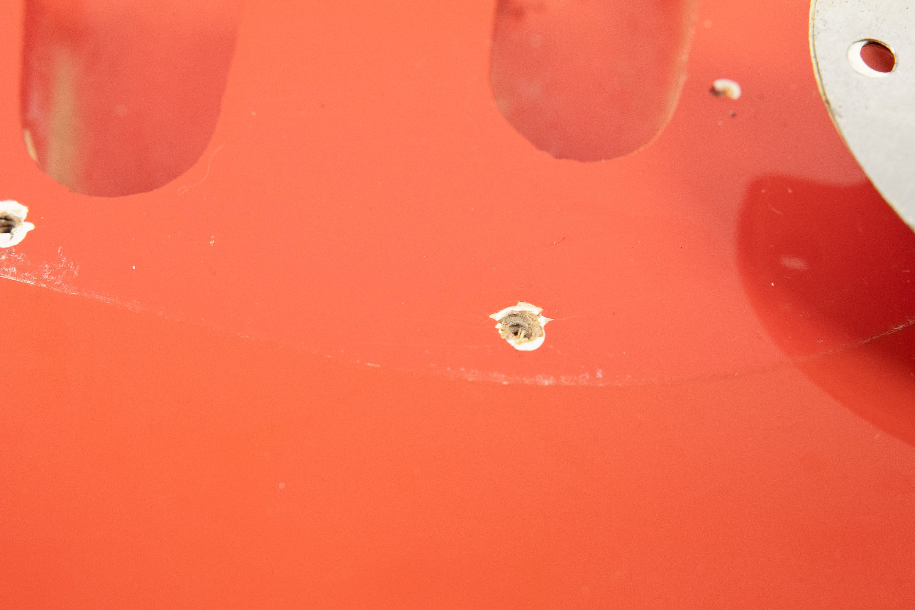 Constructionally and cosmetically, everything here points the right way. The body shows the correct white undercoat beneath the Fiesta Red topcoat, with the yellow-dyed alder body visible in the pocket as expected. The neck pocket looks excellent, the three nail holes are present and correct, and the routing details are all very reassuring, right down to the fuzz in the worm route. There is masking tape remnants in the neck pocket too revealing the white undercoat as is often seen, and the overall impression under the guard is of a guitar that has escaped the sort of invasive work so many others of this age have suffered. Even the neck bolts are notably tight, suggesting it has not been repeatedly apart over the years.