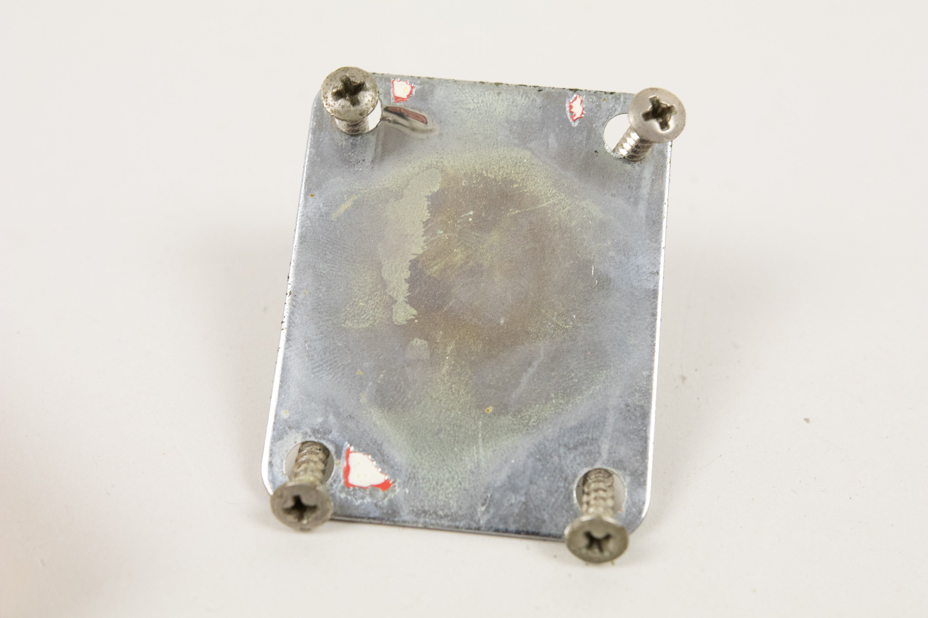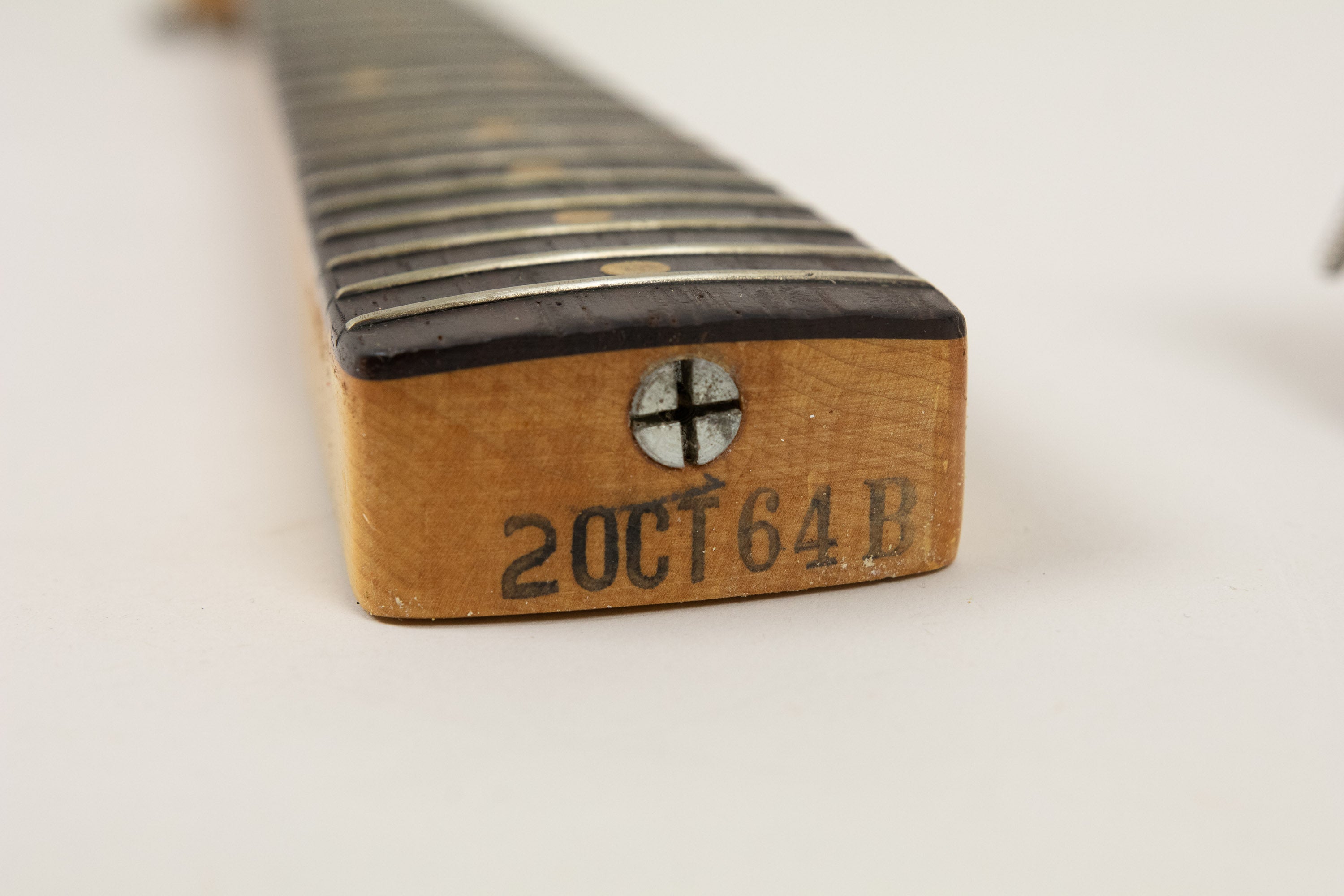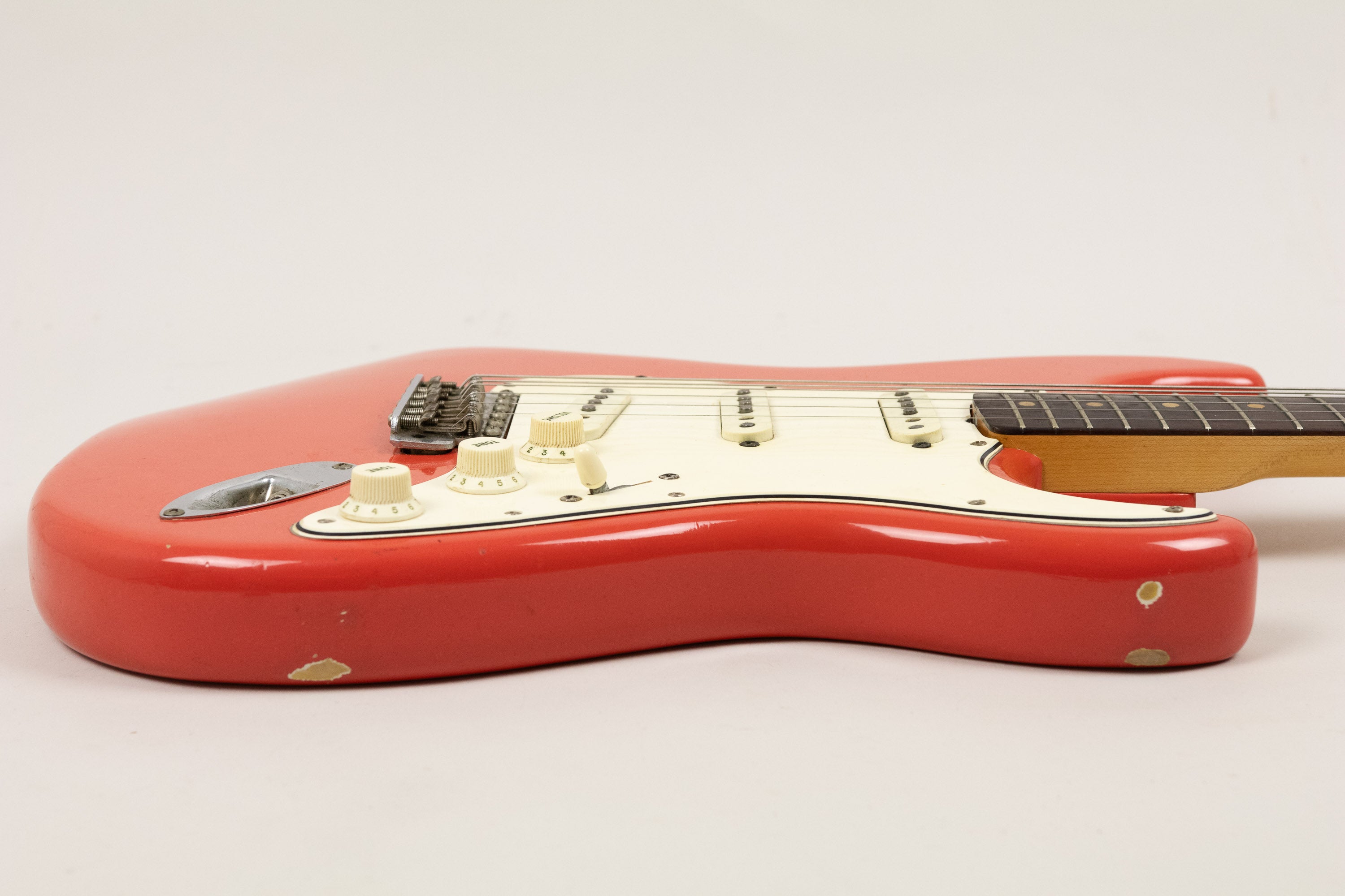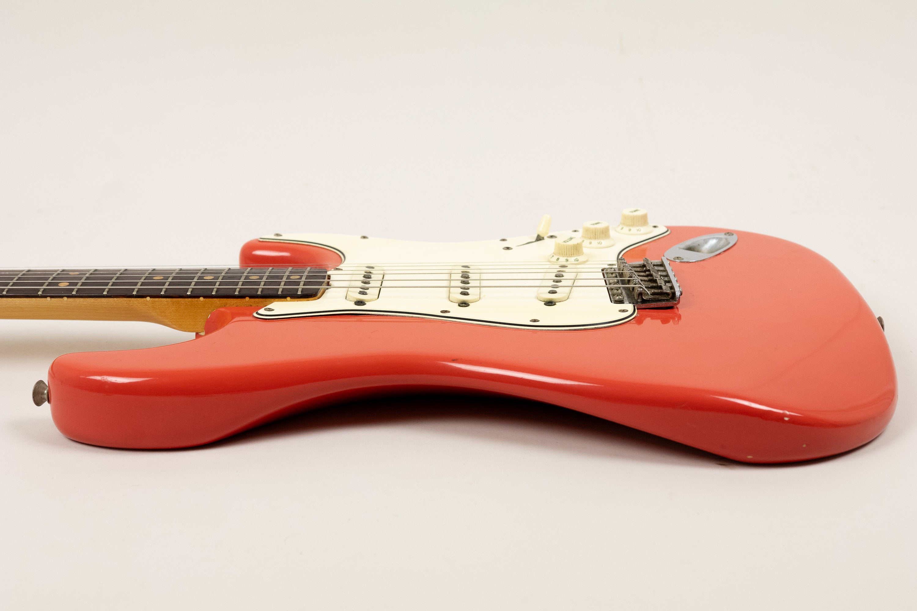 Constructionally and cosmetically, everything here points the right way. The body shows the correct white undercoat beneath the Fiesta Red topcoat, with the yellow-dyed alder body visible in the pocket as expected. The neck pocket looks excellent, the three nail holes are present and correct, and the routing details are all very reassuring, right down to the fuzz in the worm route. There is masking tape remnants in the neck pocket too revealing the white undercoat as is often seen, and the overall impression under the guard is of a guitar that has escaped the sort of invasive work so many others of this age have suffered. Even the neck bolts are notably tight, suggesting it has not been repeatedly apart over the years.