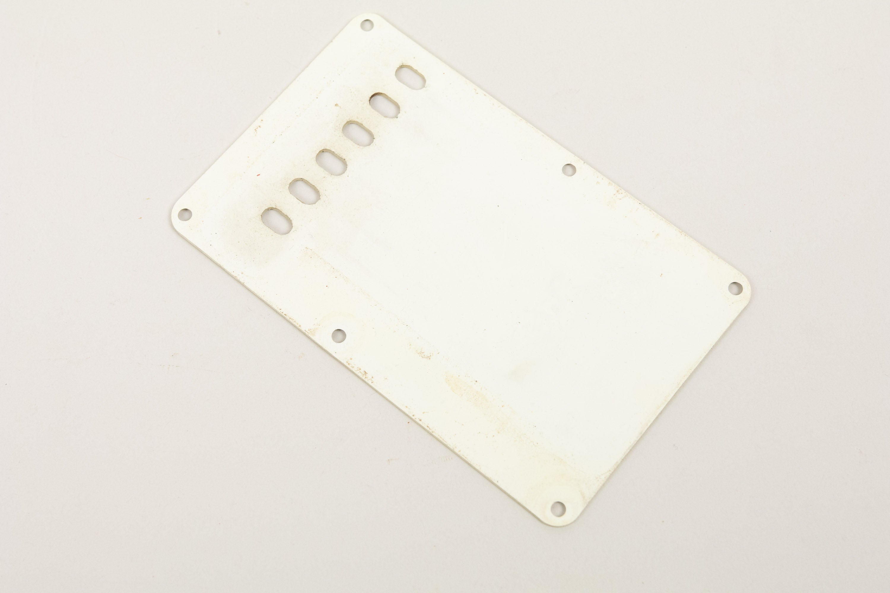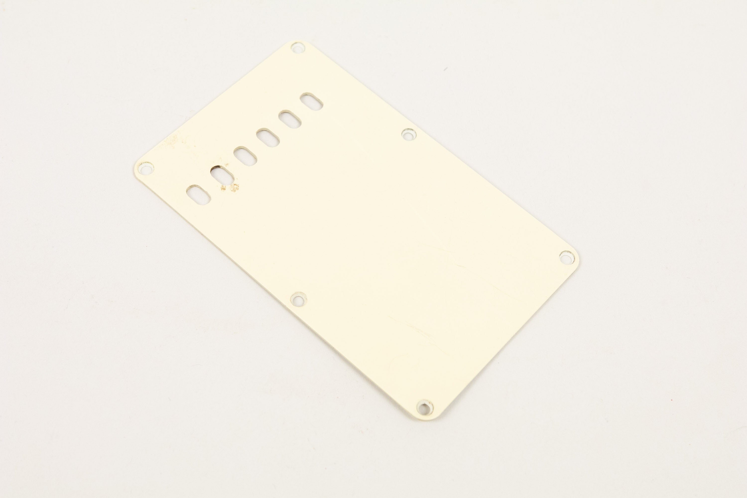 Hardware and plastics all appear correct. It retains the right single-line Kluson tuners, original tremolo block, correct backplate with all five springs intact, white pickup covers, knobs, and the correct white three-ply pickguard.