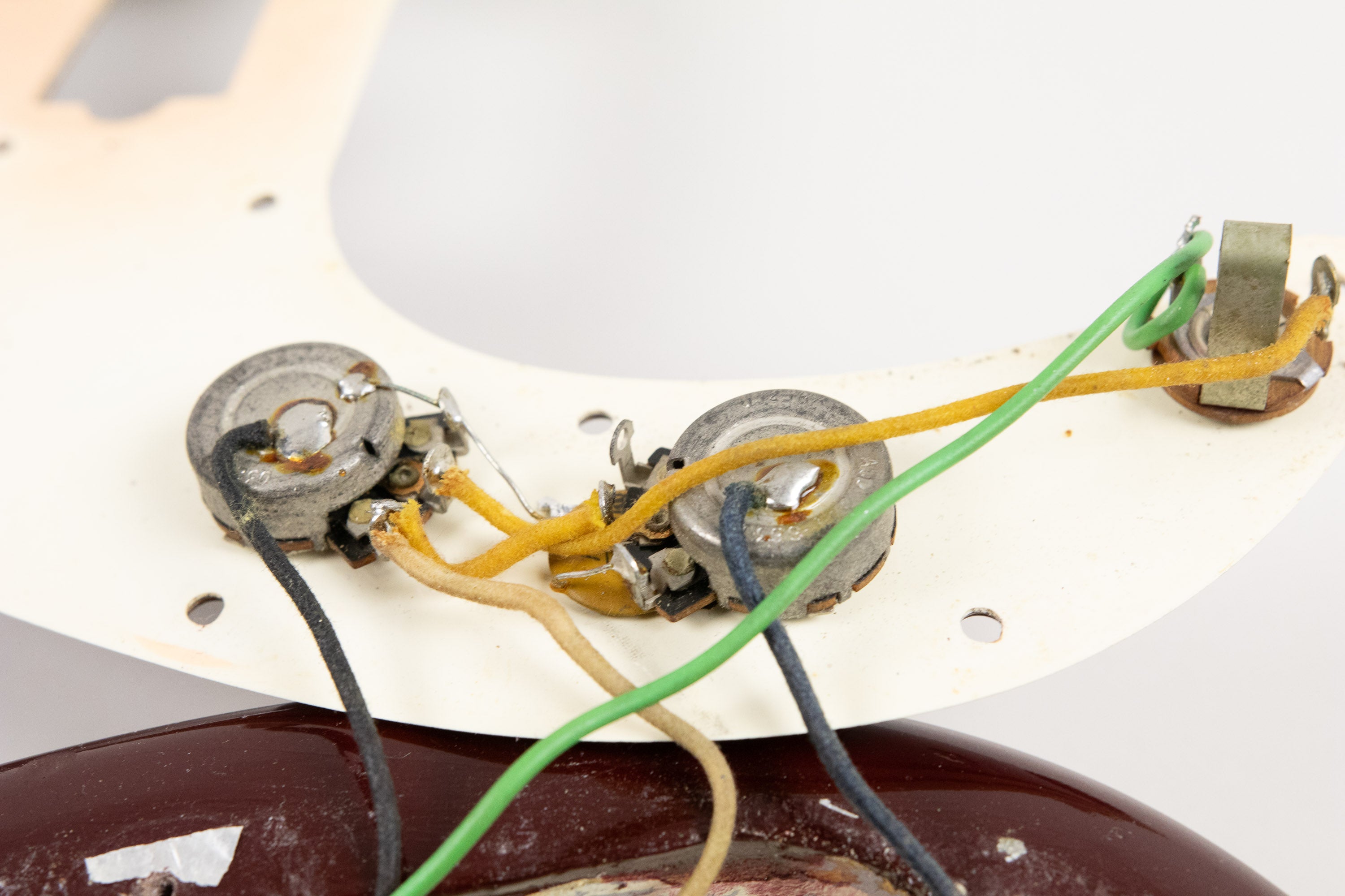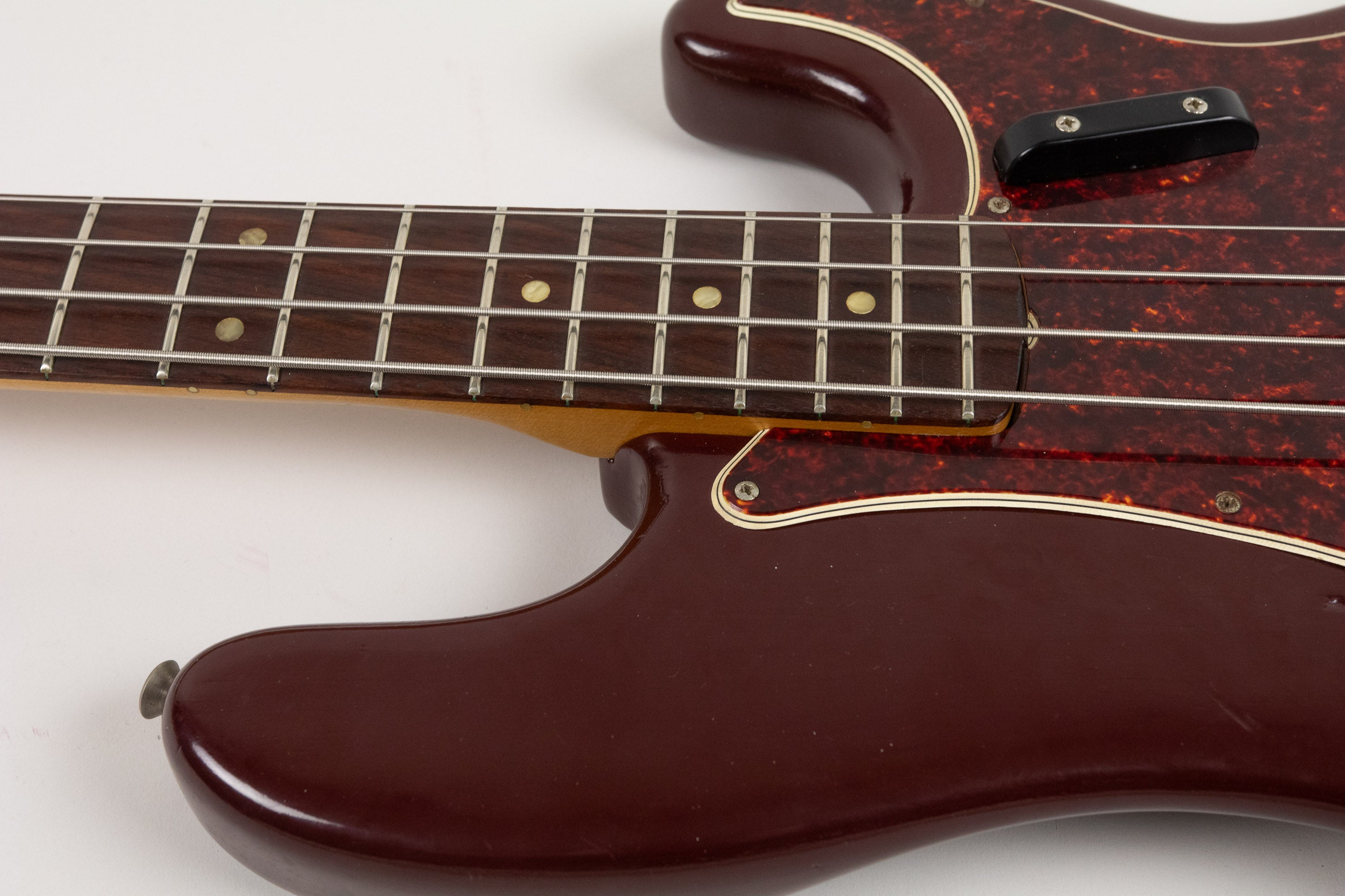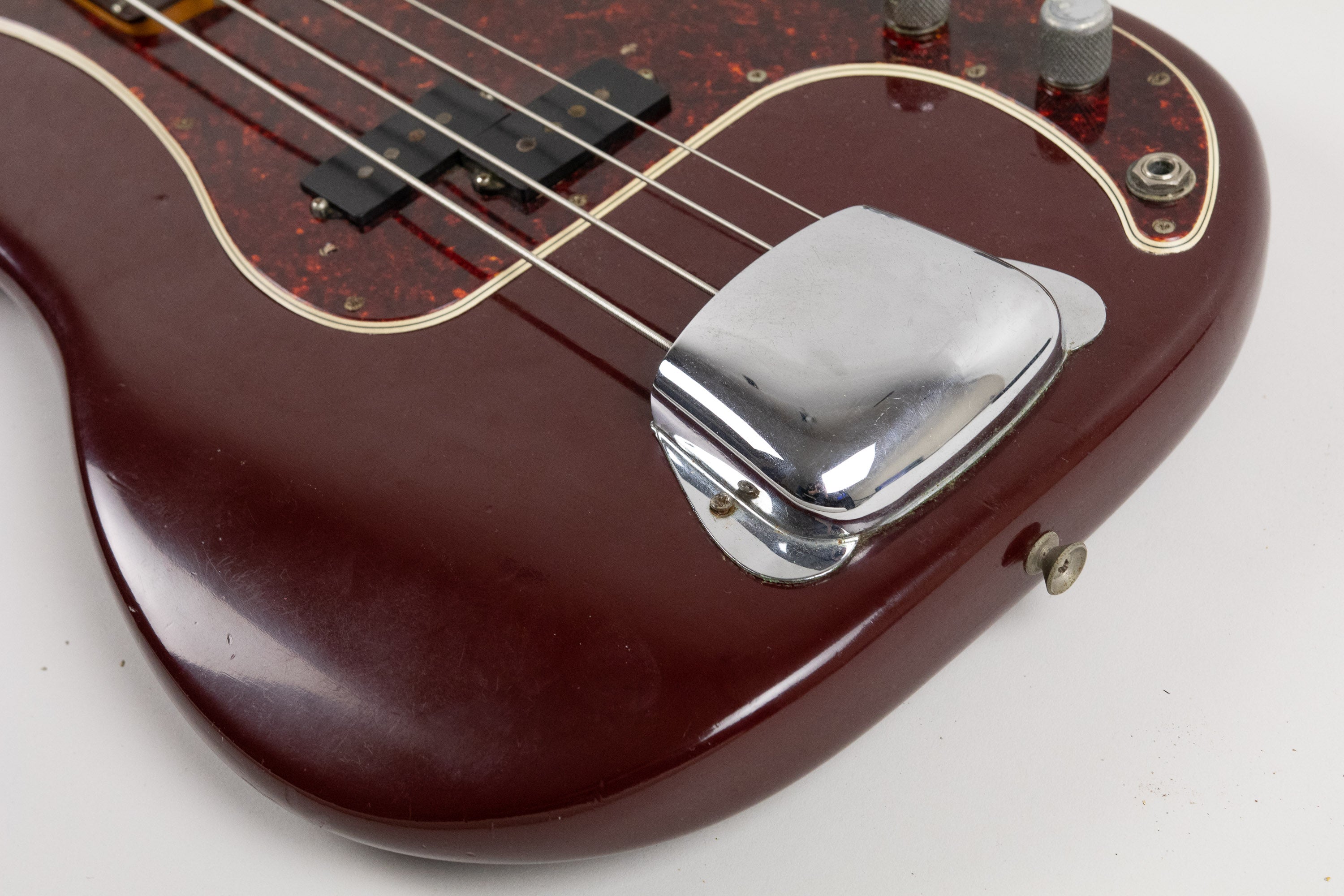 The refinish itself is neatly done and we think the dark burgundy looks great against the tortoise (non-original) pickguard. There are traces of white paint in the pickup cavity and neck pocket indicating it was white in a previous life.