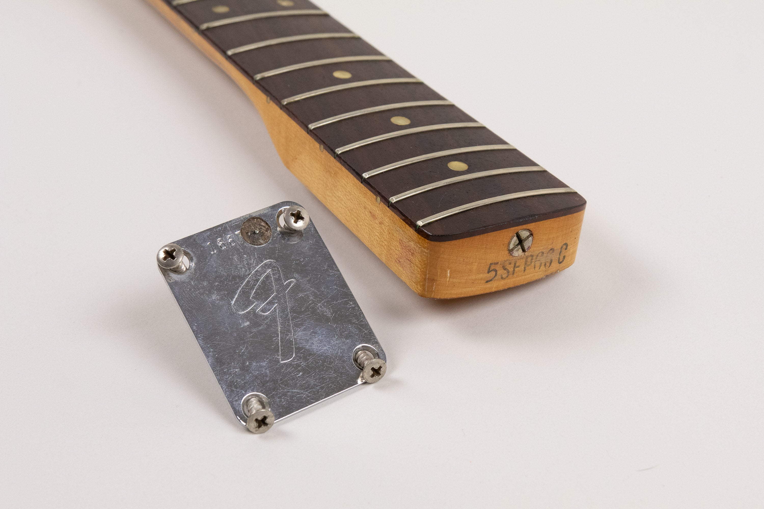 The rosewood fingerboard features pearl dot inlays and appears to retain its original frets that have decent life left. The neck is stamped Sept ’66, with a comfortable medium C profile that feels immediately familiar in the hands.