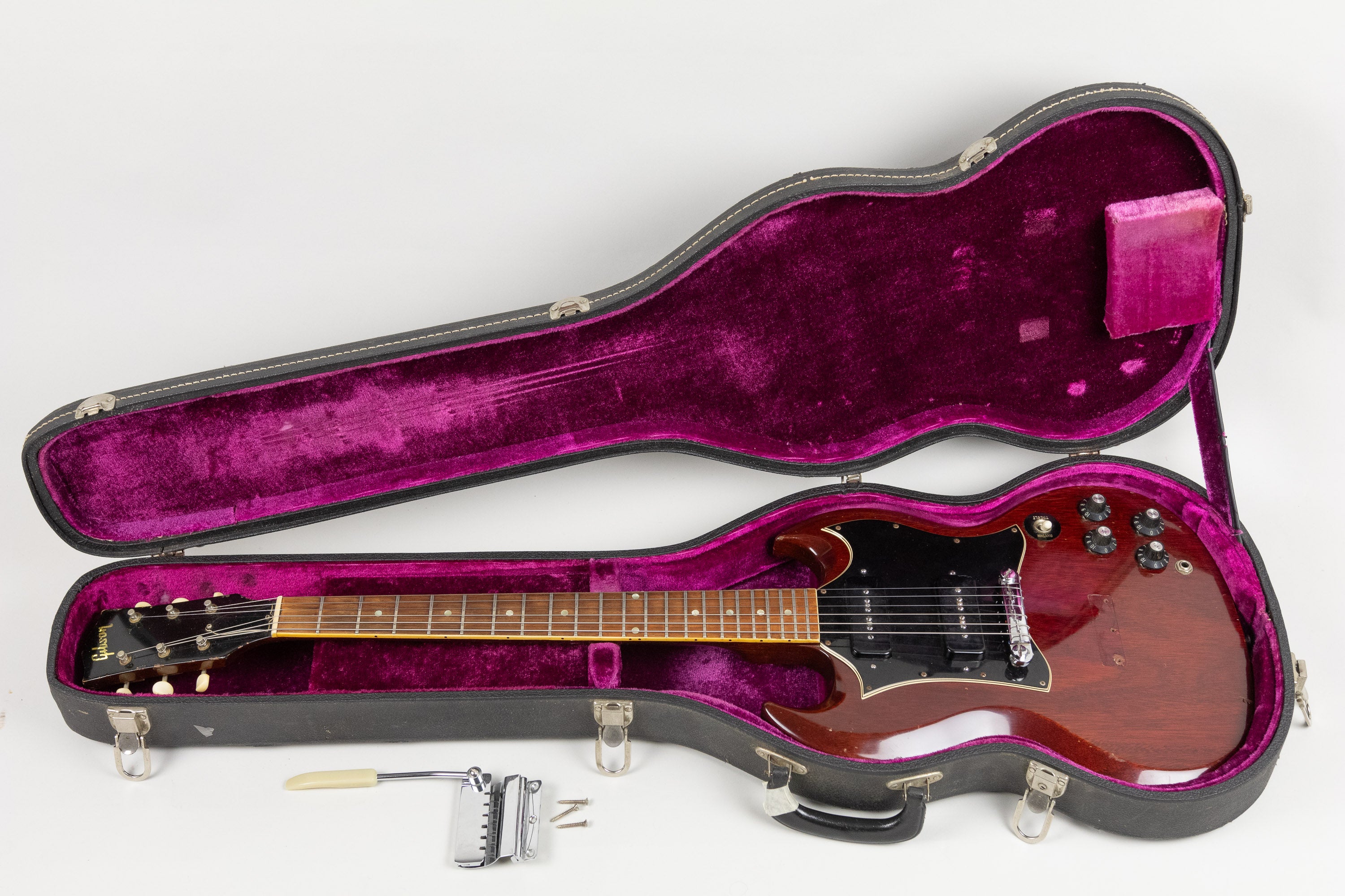 The CTS pots appear correct with a legible 1376902 code dating to the second week of 1969. The Vibrola has been removed, a common and often welcome change from a player’s perspective, but importantly it is included with the guitar, keeping future options open. Reproduction Kluson Deluxe strip tuners are fitted, with earlier tuner holes visible beneath, but hardware is otherwise correct, including the lightning-bolt wraparound tailpiece and chrome studs. Plastics are correct to the period, including the batwing guard, witch hat knobs.