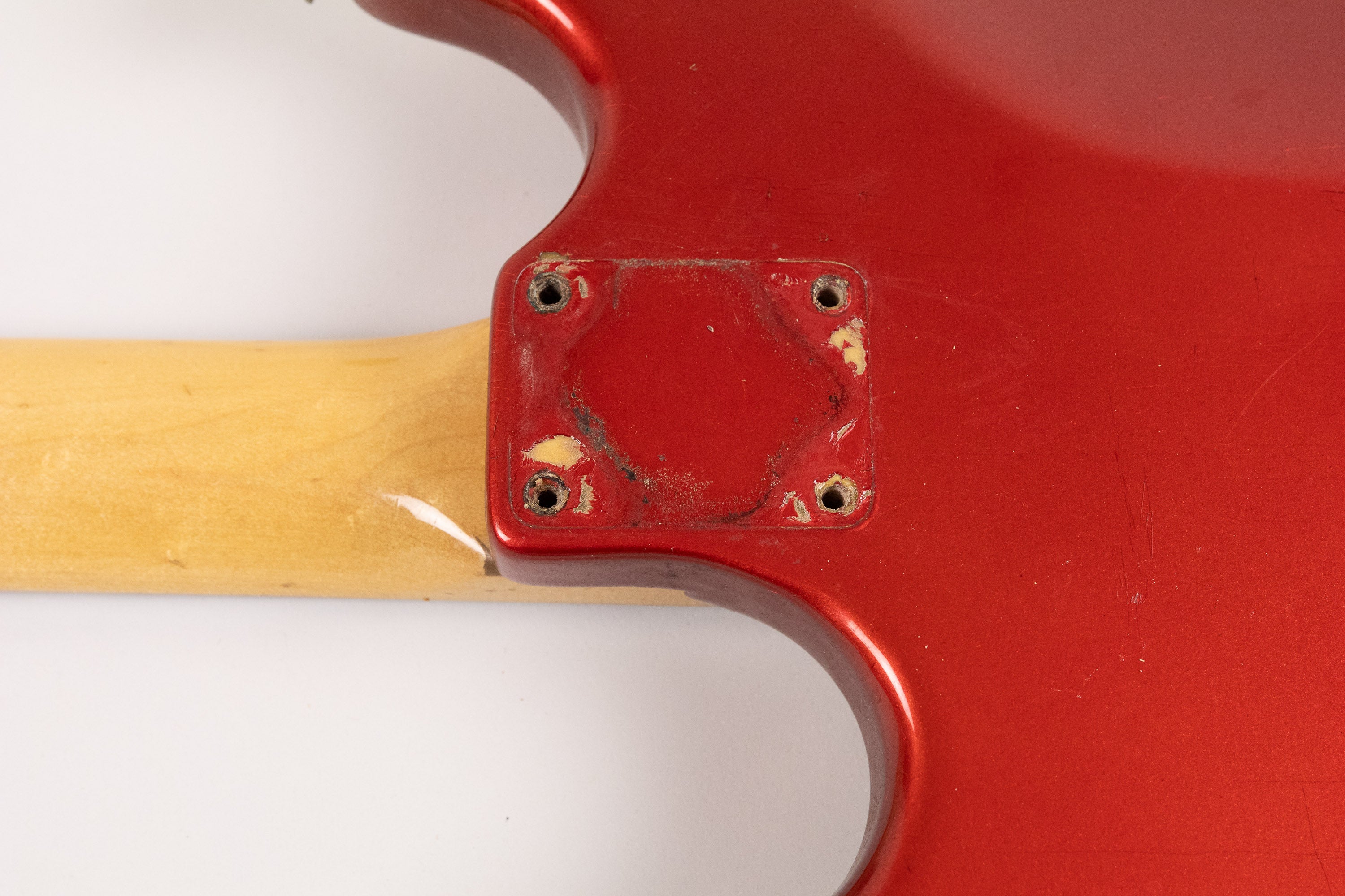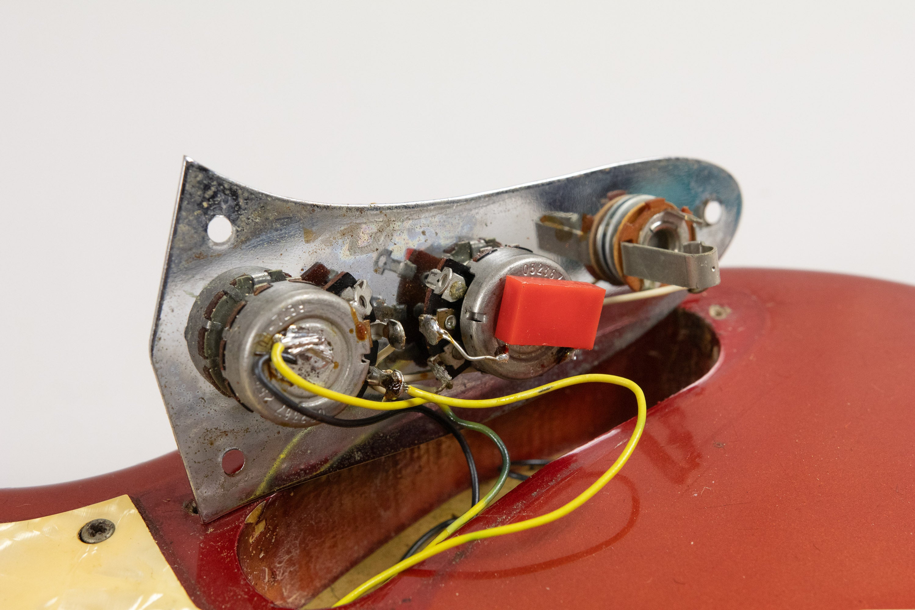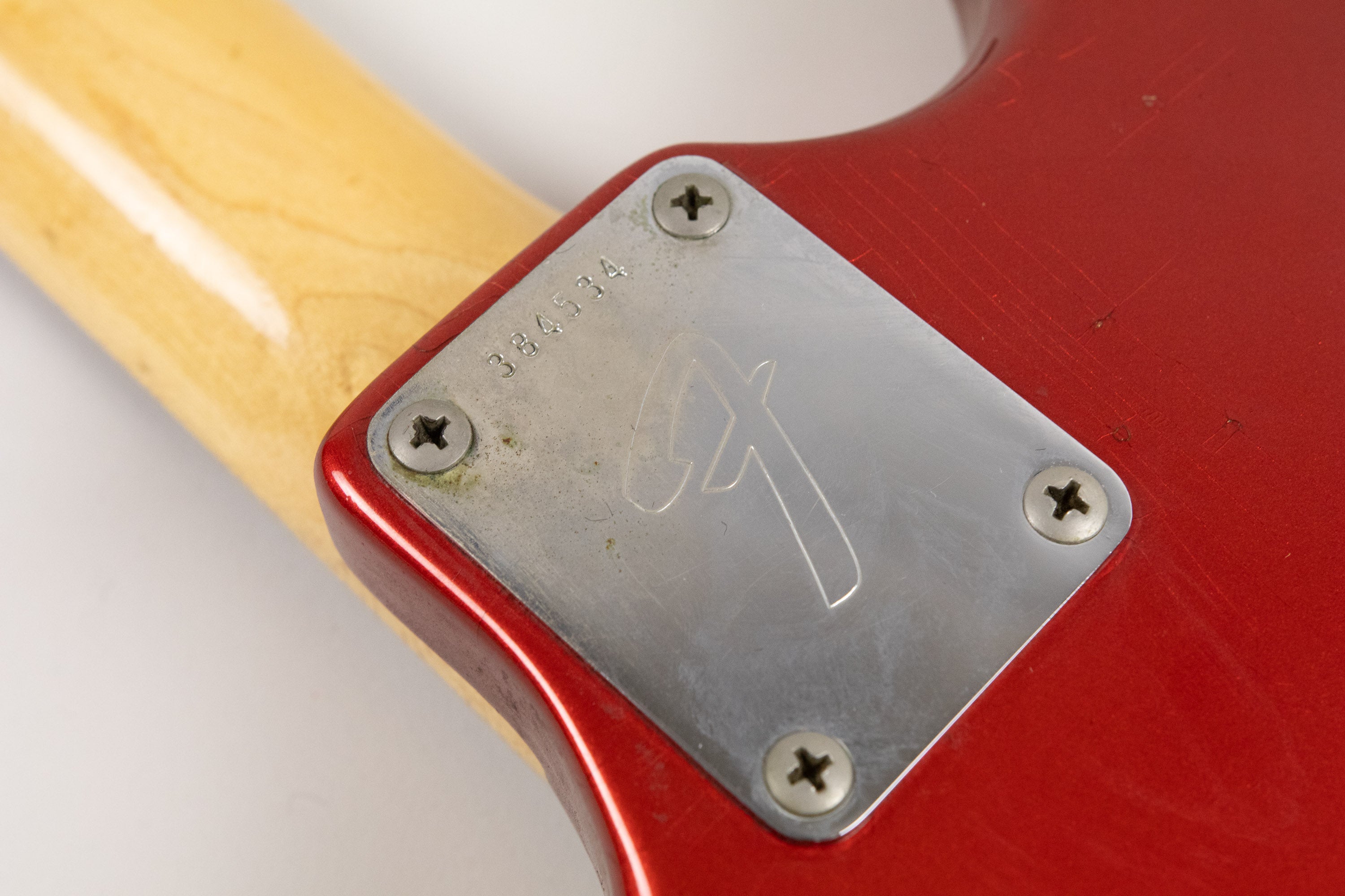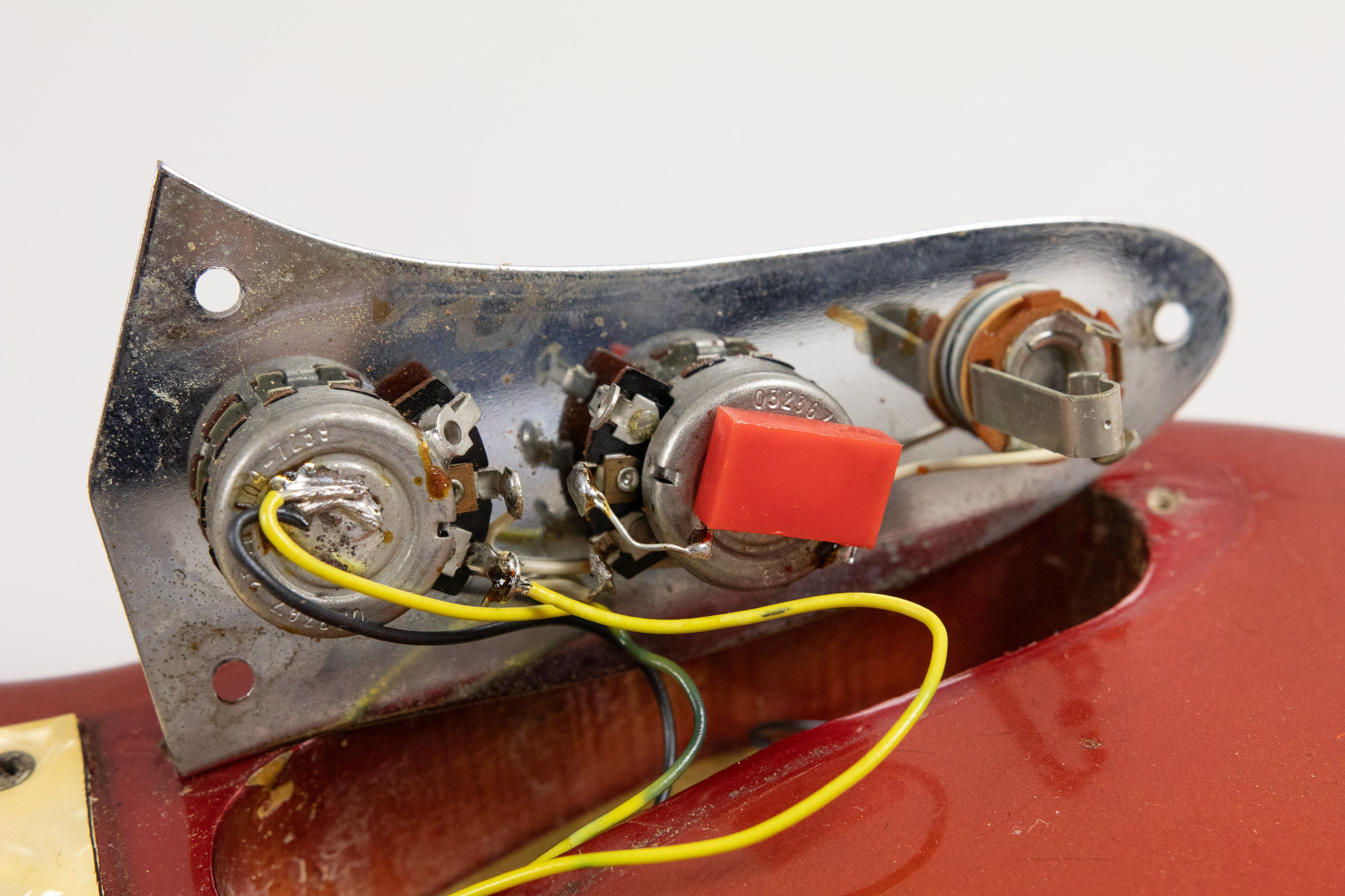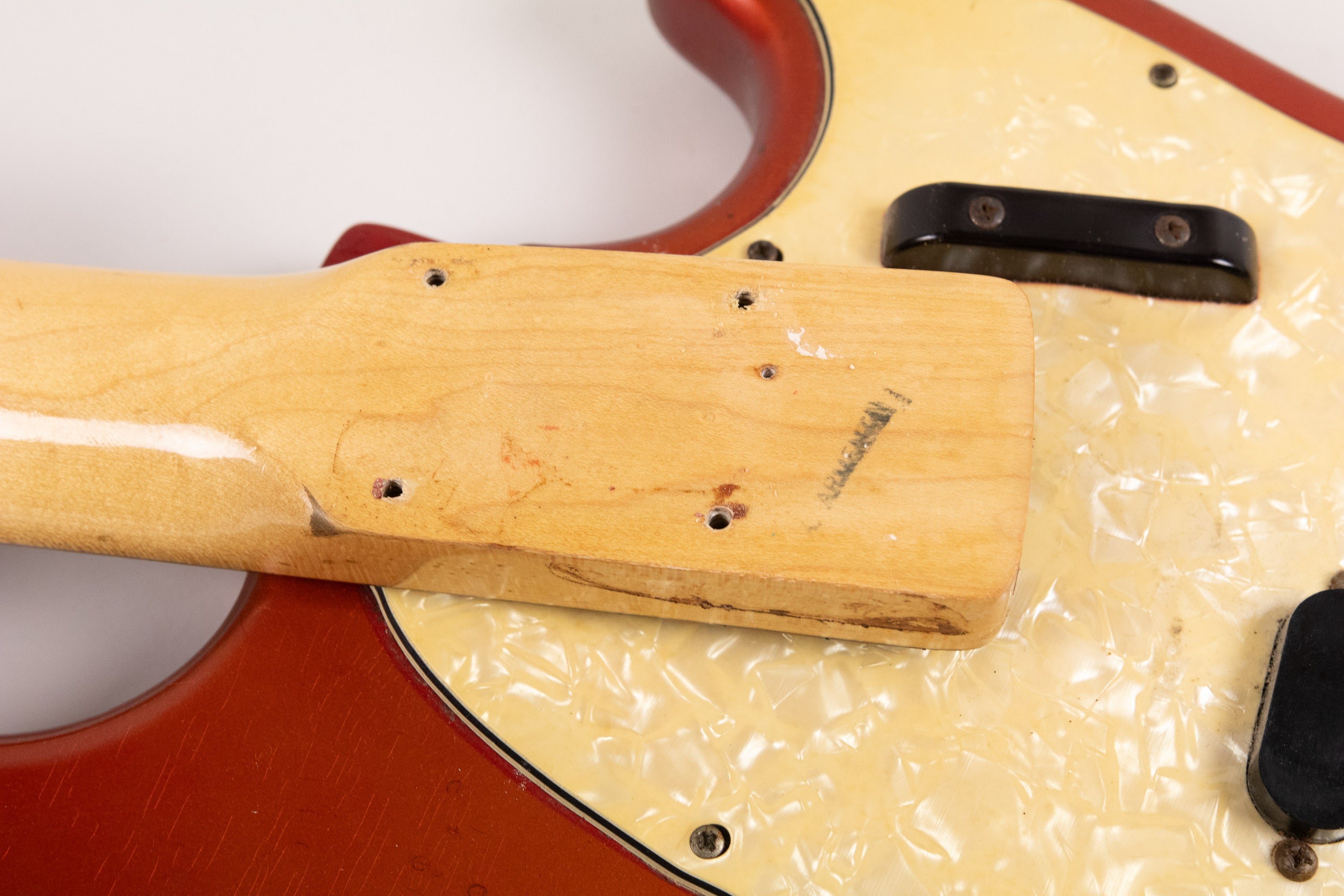 This example dates from 1973, with an AUG72 neck stamp, week 29 of 1973 pots. It retains its original Competition Red finish, which has aged and faded beautifully over the years, developing a stunning patina and character. The nitrocellulose headstock face has mellowed nicely too.