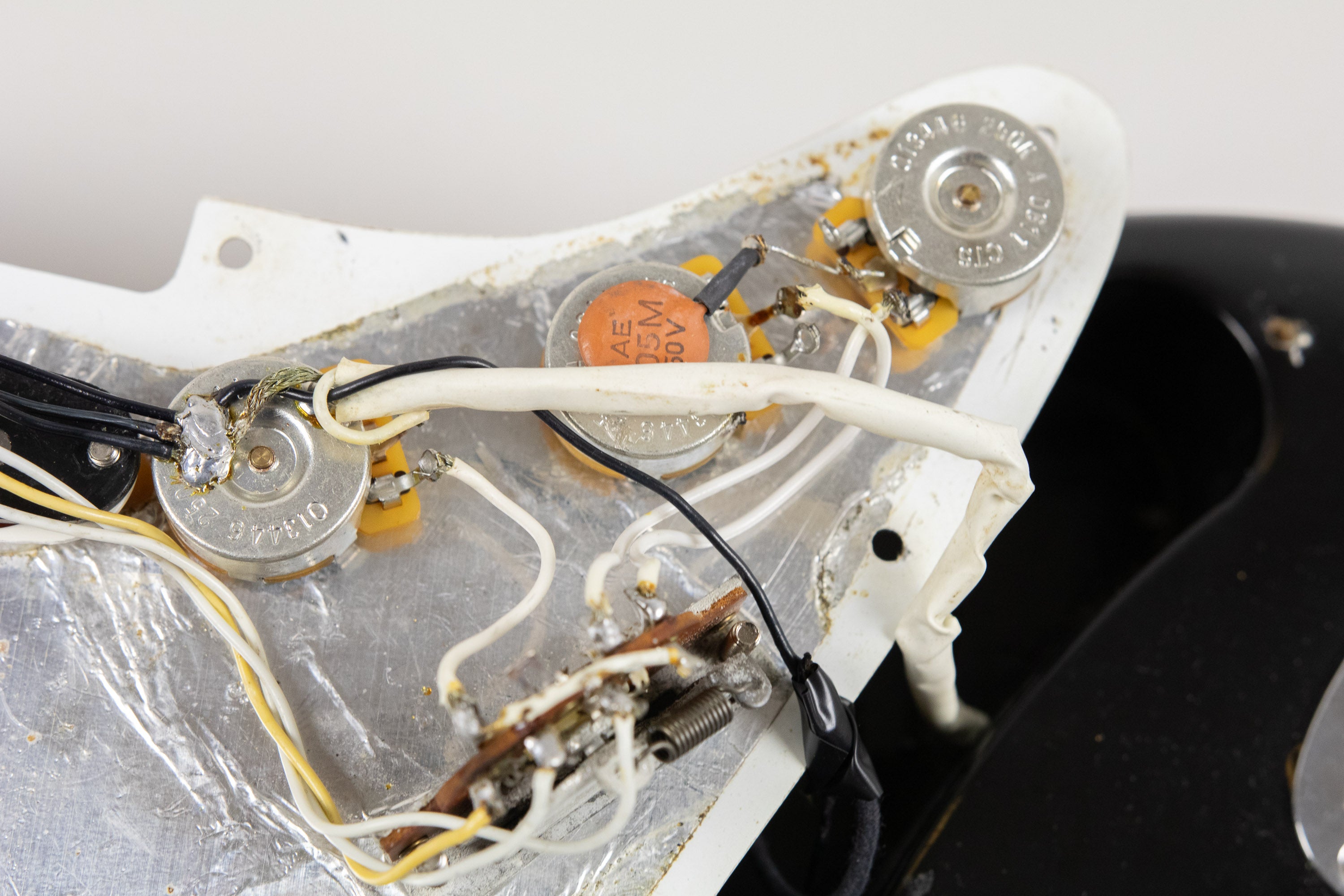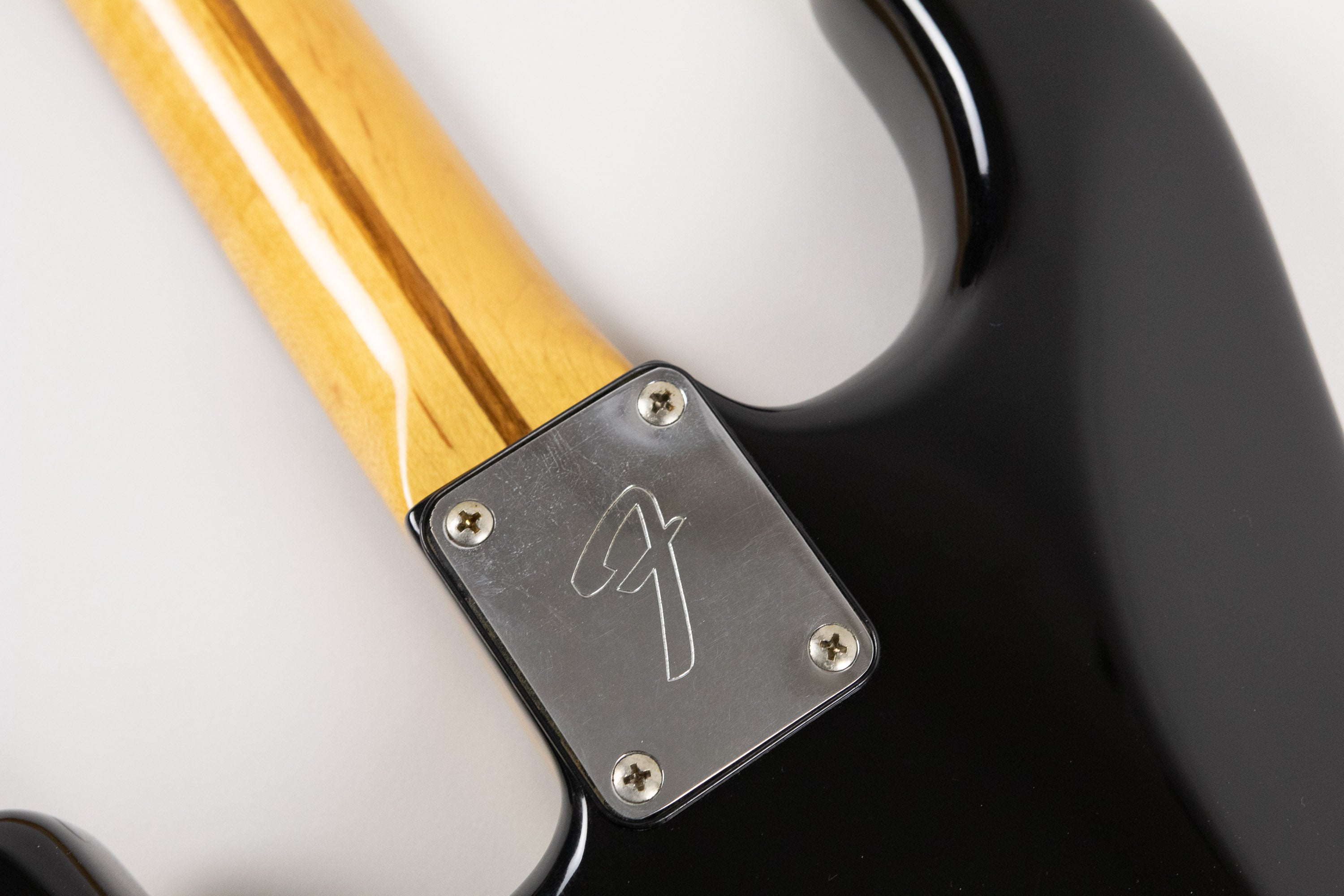 The Maple neck features the Black/Gold Fender logo of the period, tuners are the correct F stamp versions, the neck is dated 1982 with 4-bolt neck construction. Pickups are the correct moulded plastic bobbin type of the period, with PVC wiring throughout. The black finish gives it a properly sharp, no-nonsense look, and the overall condition is excellent!