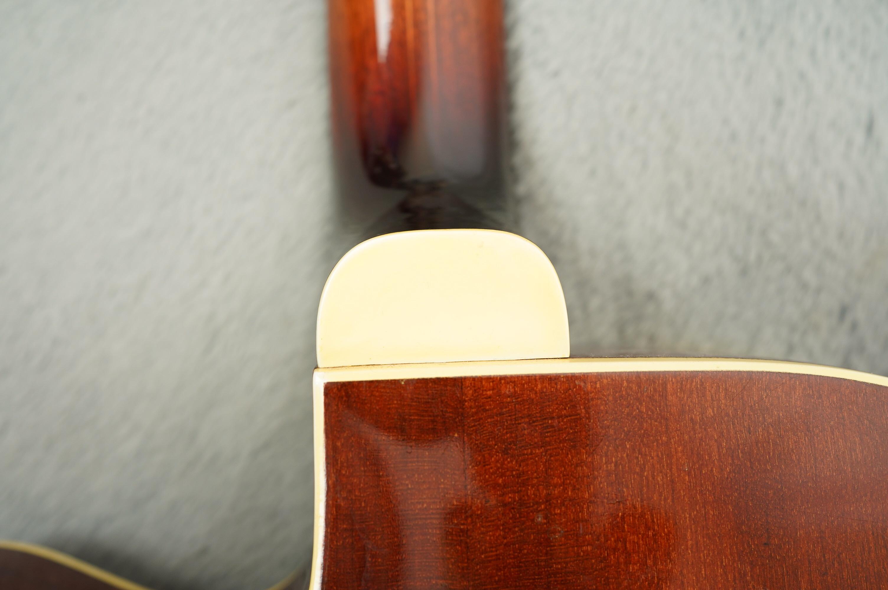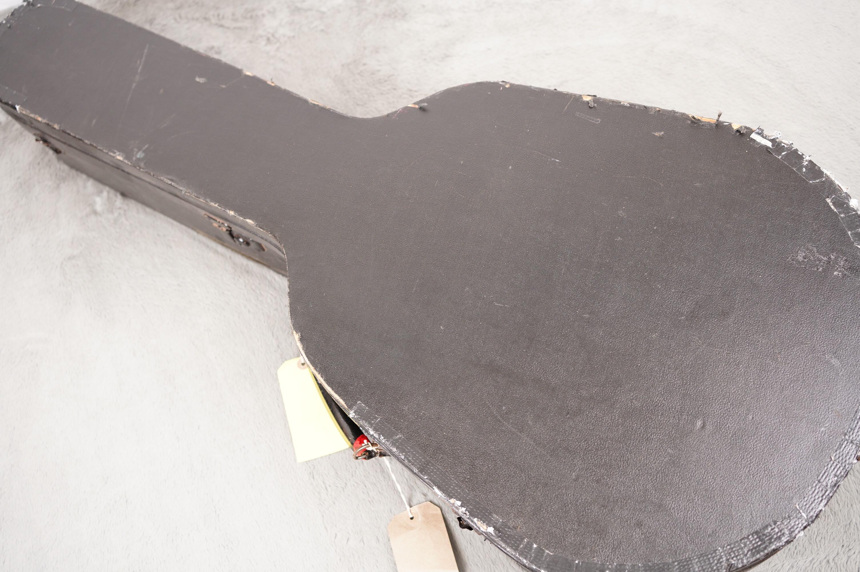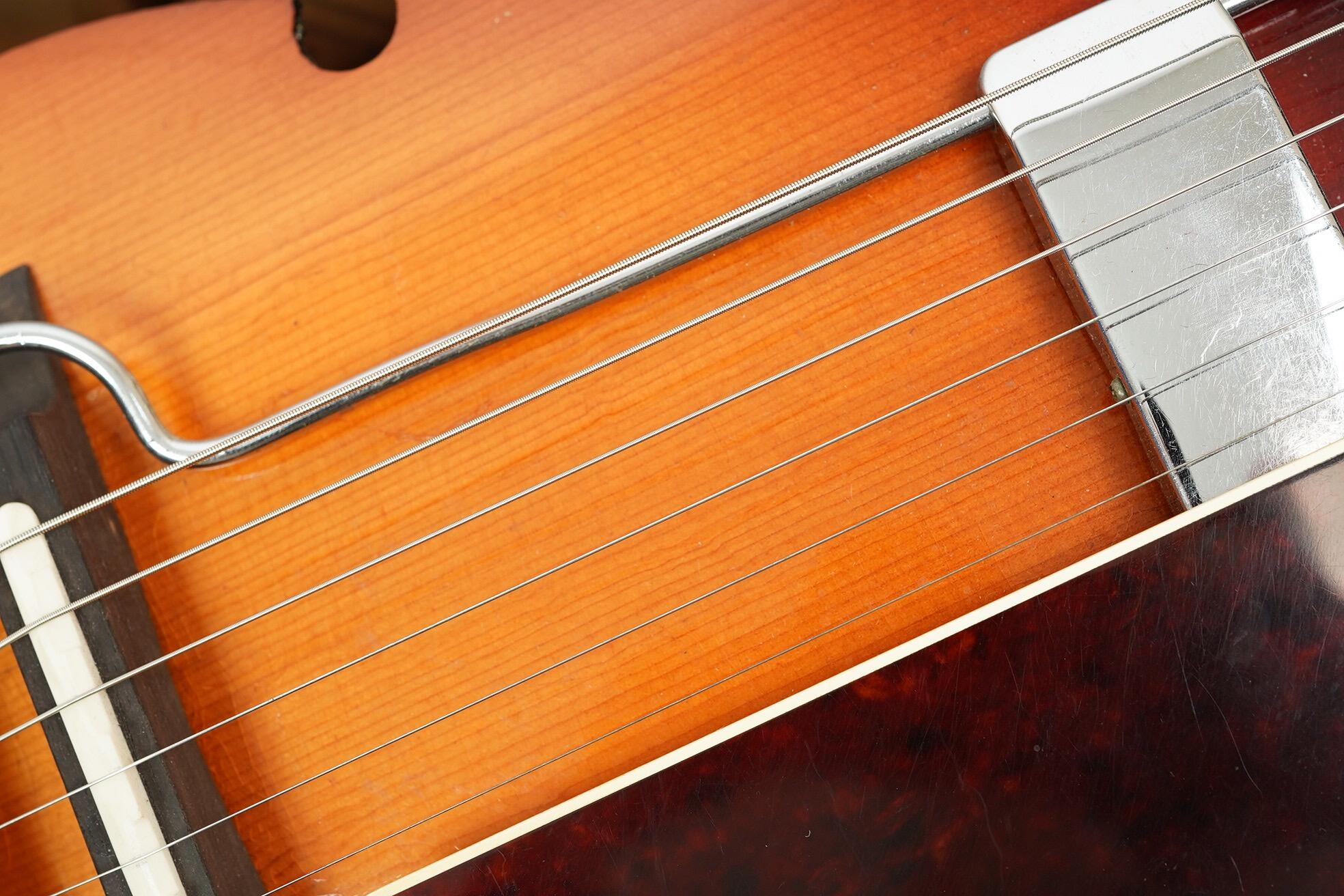The Model 335 has a comfortable, compact body, 16.5” across the lower bout with a depth of 3”. It features a solid, hand carved Spruce top, Maple back and sides with a laminate Mahogany neck with adjustable truss rod. Dark Rosewood fingerboard with large pearl position inlays. Appointments include a bound top and back with unbound fingerboard and headstock. The headstock features a pearl Levin Logo and Star motif paired with the enamel painted Trussrod cover.  The pickguard is single bound tortoiseshell. The Bridge is a recent replacement. This instrument left the factory as a purely acoustic instrument but has been subsequently fitted with a removable pickup that mounts in the same vein as the Dearmond Rhythm Chief type pickup but is possibly a Fuma made part. Still featuring its original open geared tuners, the guitar plays wonderfully thanks to a new nut and a re-fret. The original Sunburst finish looks great with only minor wear. There are a few small areas of touch up evident under Blacklight and a small, well executed repair to the lower bout.  The guitar playas great, the neck has a comfortable mid-to-slim C profile with a 43.41mm wide nut.