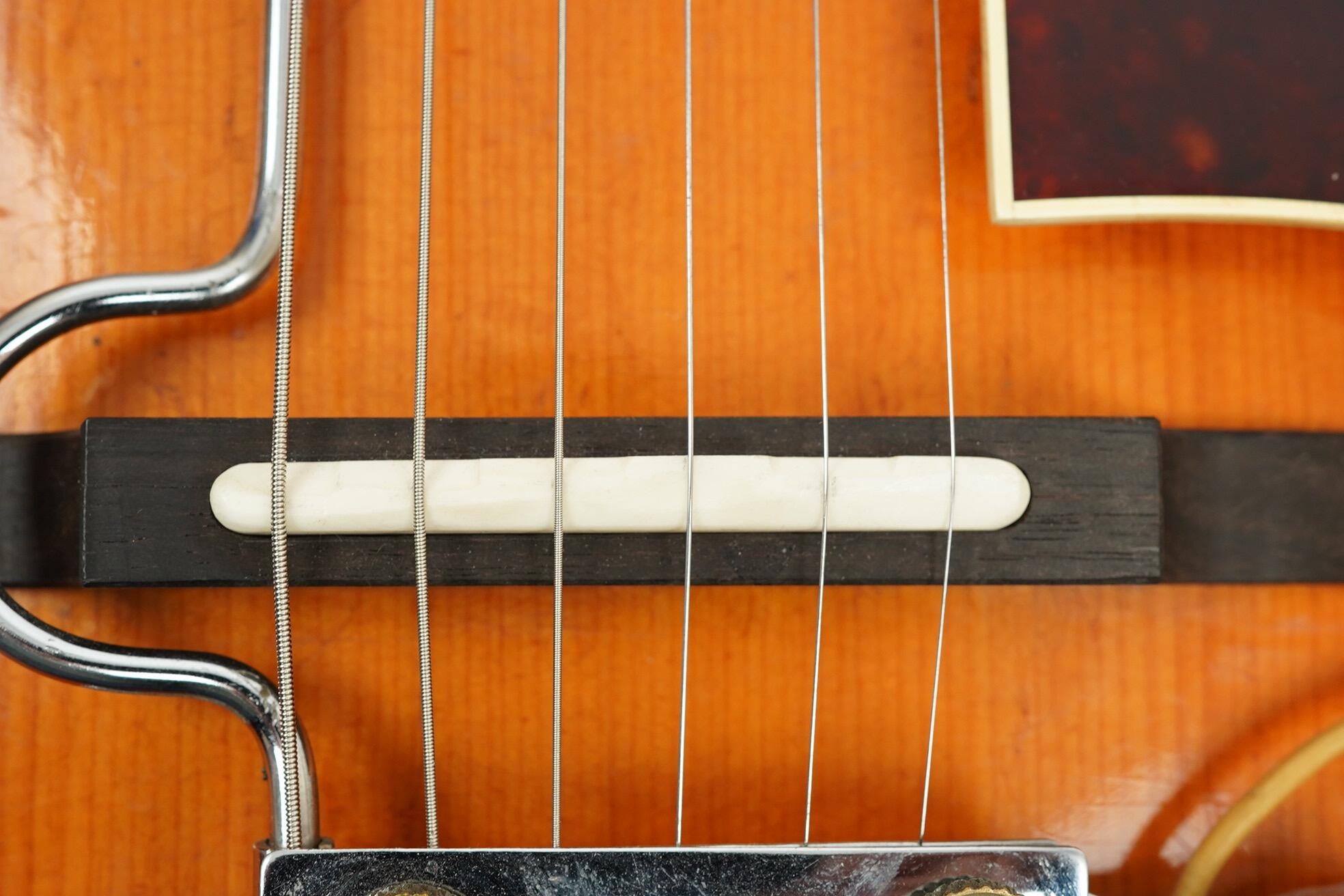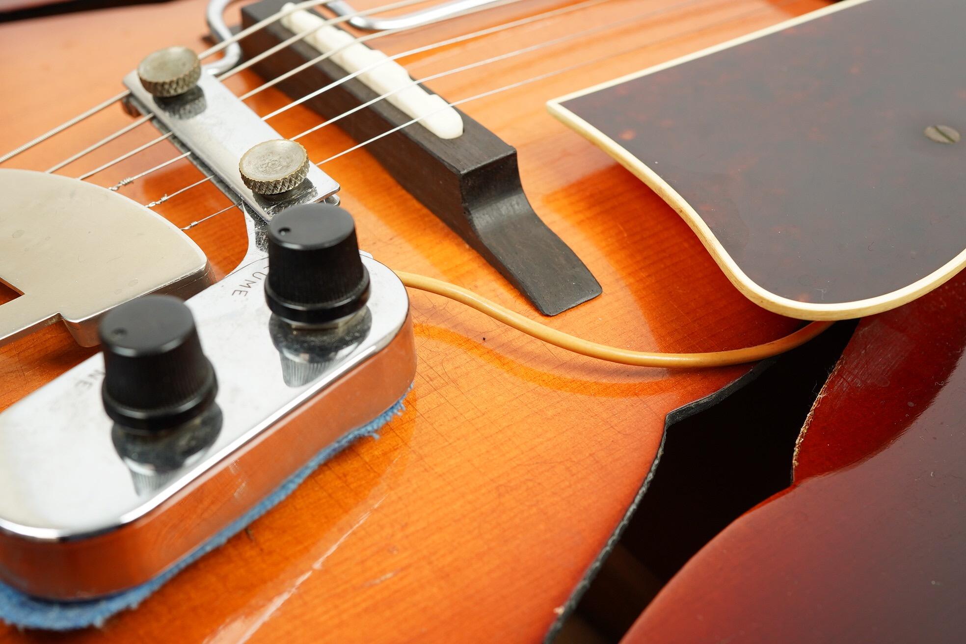 This is a charming Levin 335 Archtop guitar, made in Sweden in 1964. The Levin company of Sweden was founded by luthier Herman Karlsson Levin in 1900, and the first guitar and mandolin factory was set up in Gothenburg, Sweden. Prior to establishing the factory, Levin had a shop in Manhattan. Levin was purchased in the early 1970s by the Martin Guitar company. The last Levin guitars were made in 1977. The Model 335 was introduced in 1957, produced throughout the 60’s, and was a very popular model in the UK and in Europe. The 335 was offered as a fully acoustic instrument or as the single Pickup M1 and the twin Pickup M2.