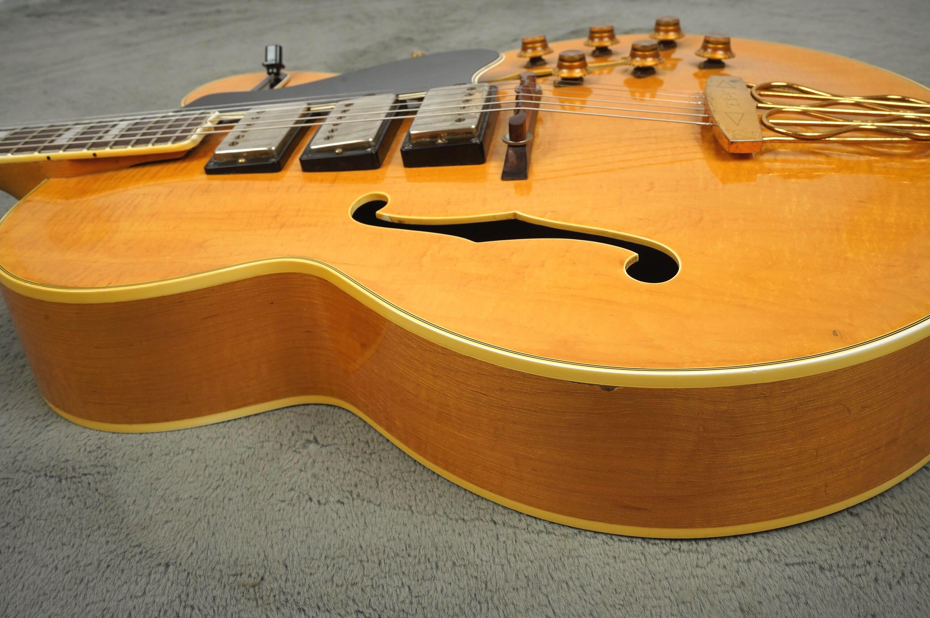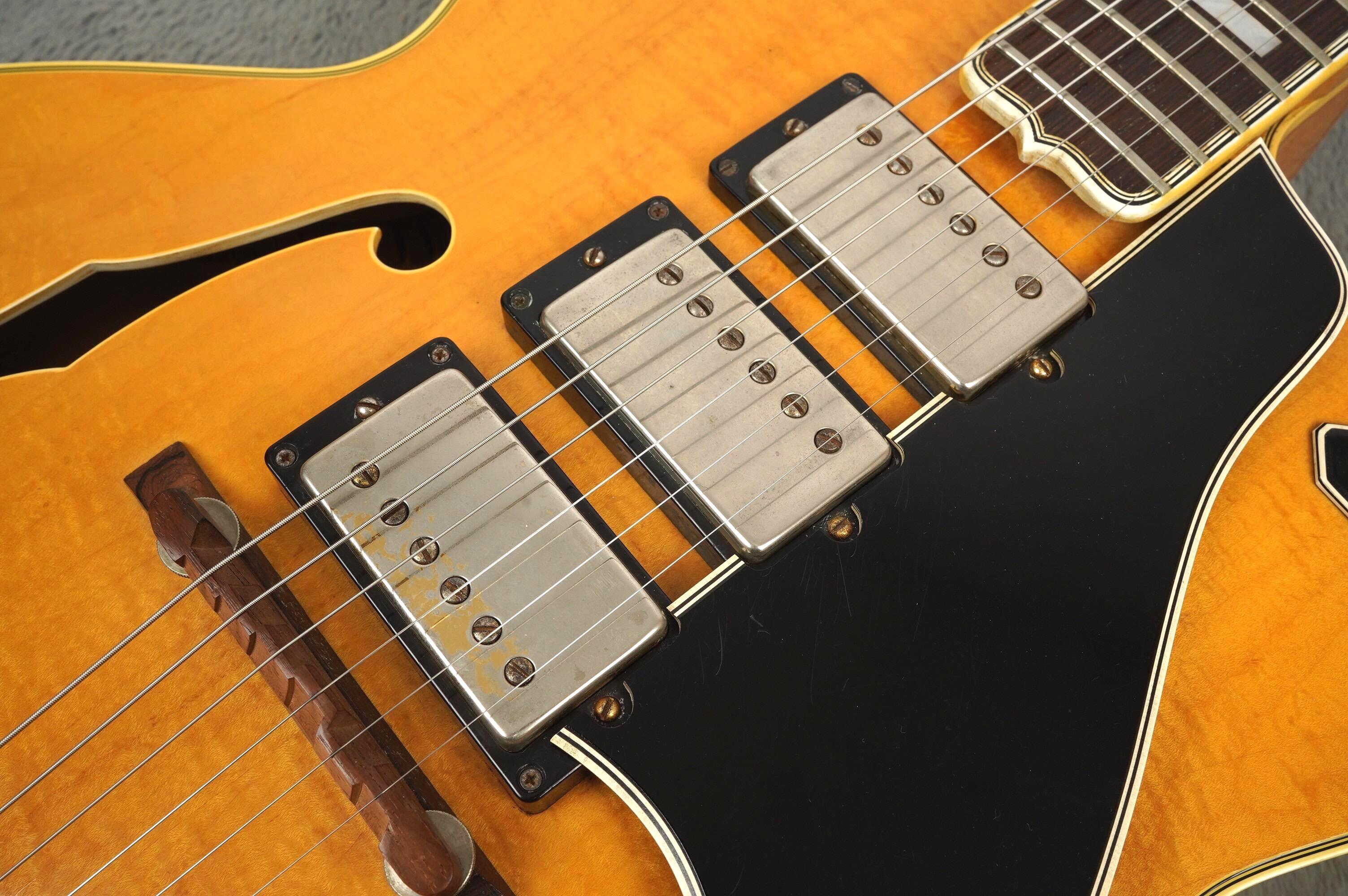 Beautiful, natural/blonde finish Gibson ES-5 Switchmaster in excellent condition, featuring 3 original, long magnet PAF pickups that sound sublime! This is a stunning guitar, 1 of only 33 made in 1959. This one is with a beautifully flamed curly Maple top. The flame is feathery in appearance and very consistent throughout. With the honeyed natural finish, gold hardware and high end appointments this is a very special instrument, befitting its high status in the Gibson lineup behind only the Super 400 and L-5.
