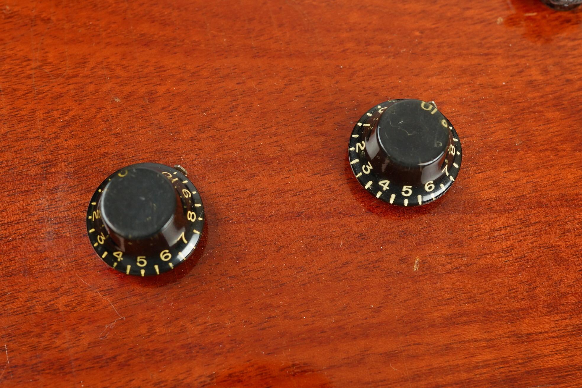 The neck has the highly desirable ’59 profile - a rounded, full carve that feels superb in the hand - topped with a rosewood fingerboard with 22 frets, simple dot inlays and a 1,11/16" nut width. The neck feels great to play, a big part of why models from '59 are held in such high regard. The neck has had some overspray in the past and there have been Grover style tuners previously installed with holes visible beneath the current period correct Klusons.