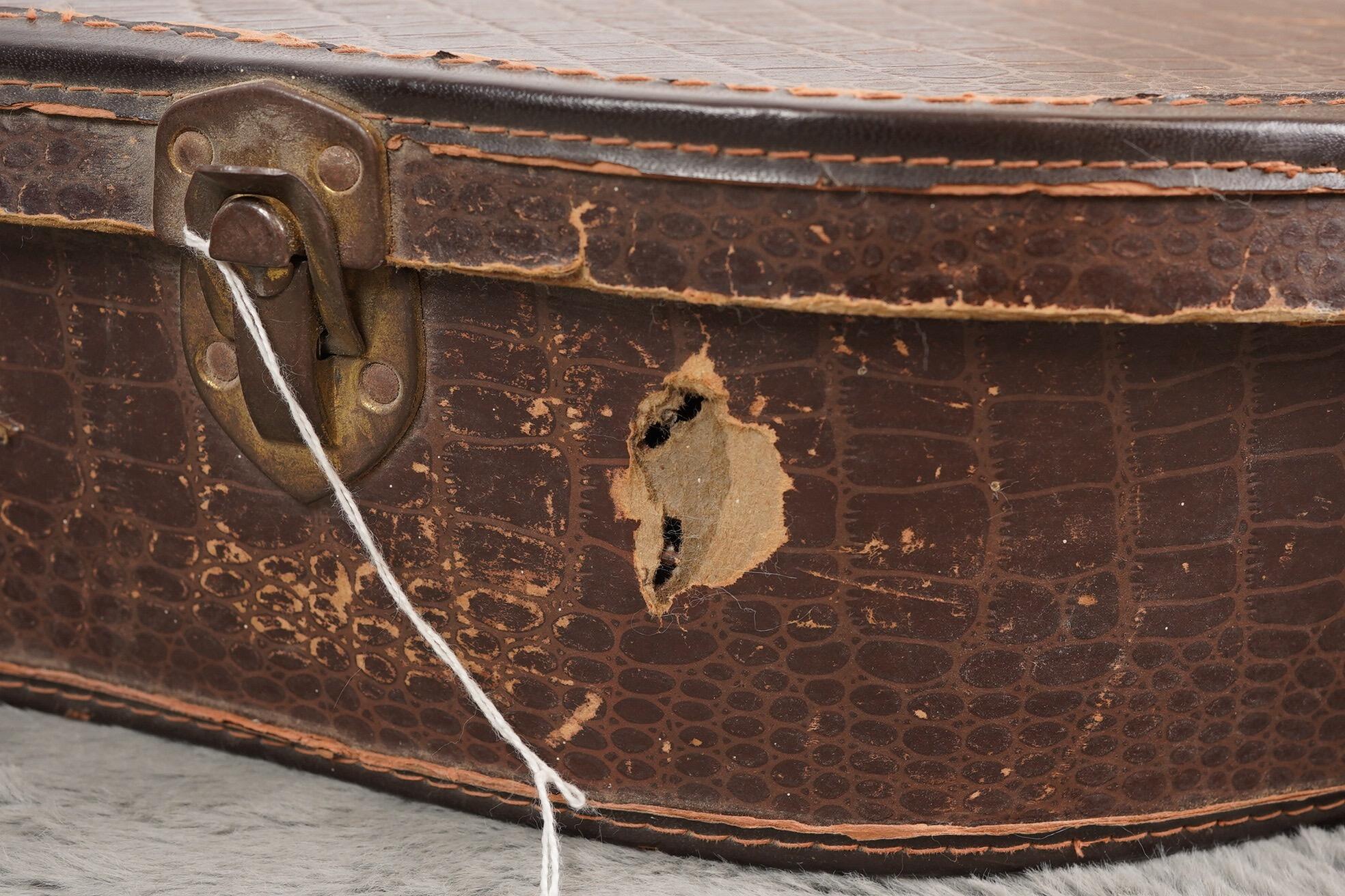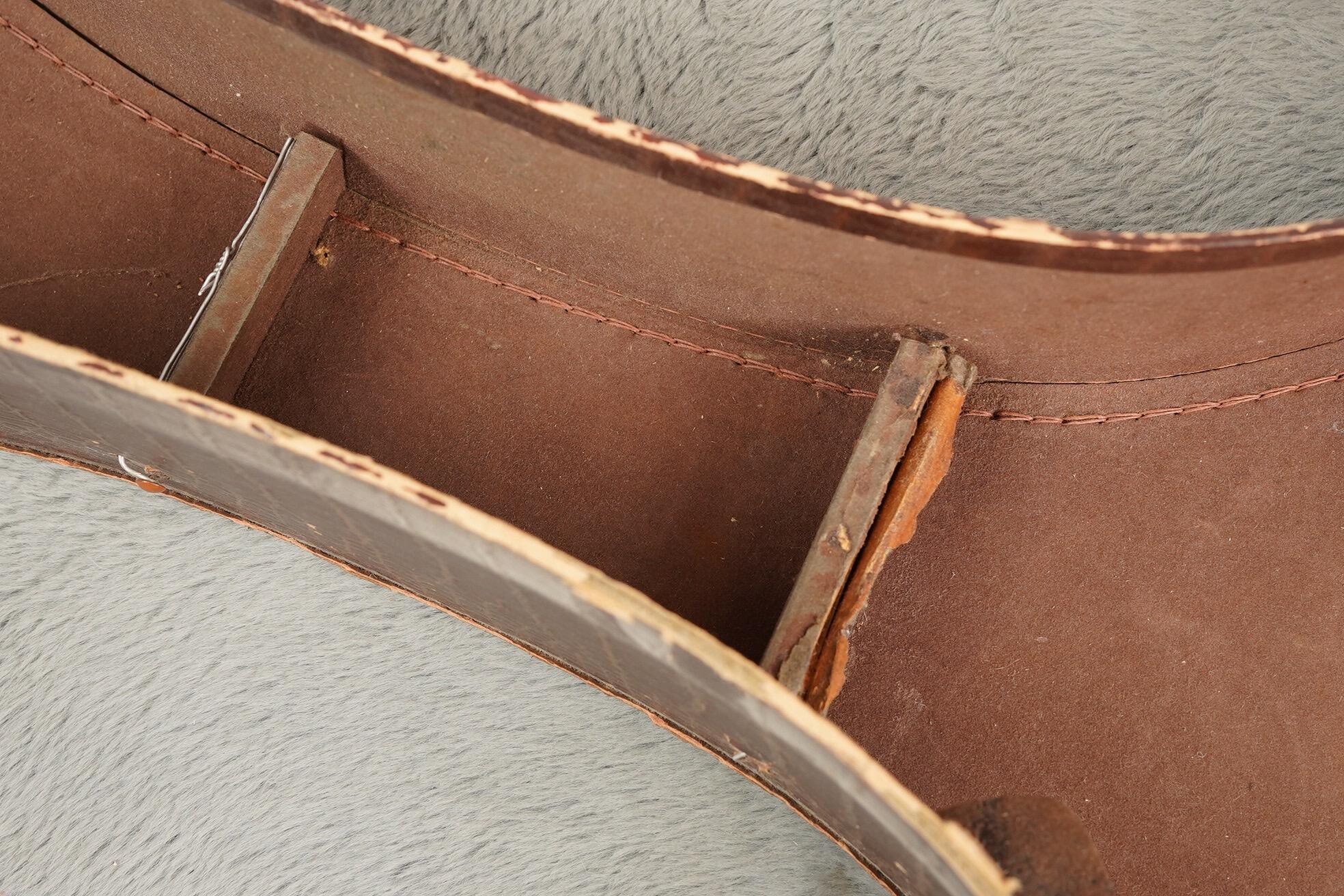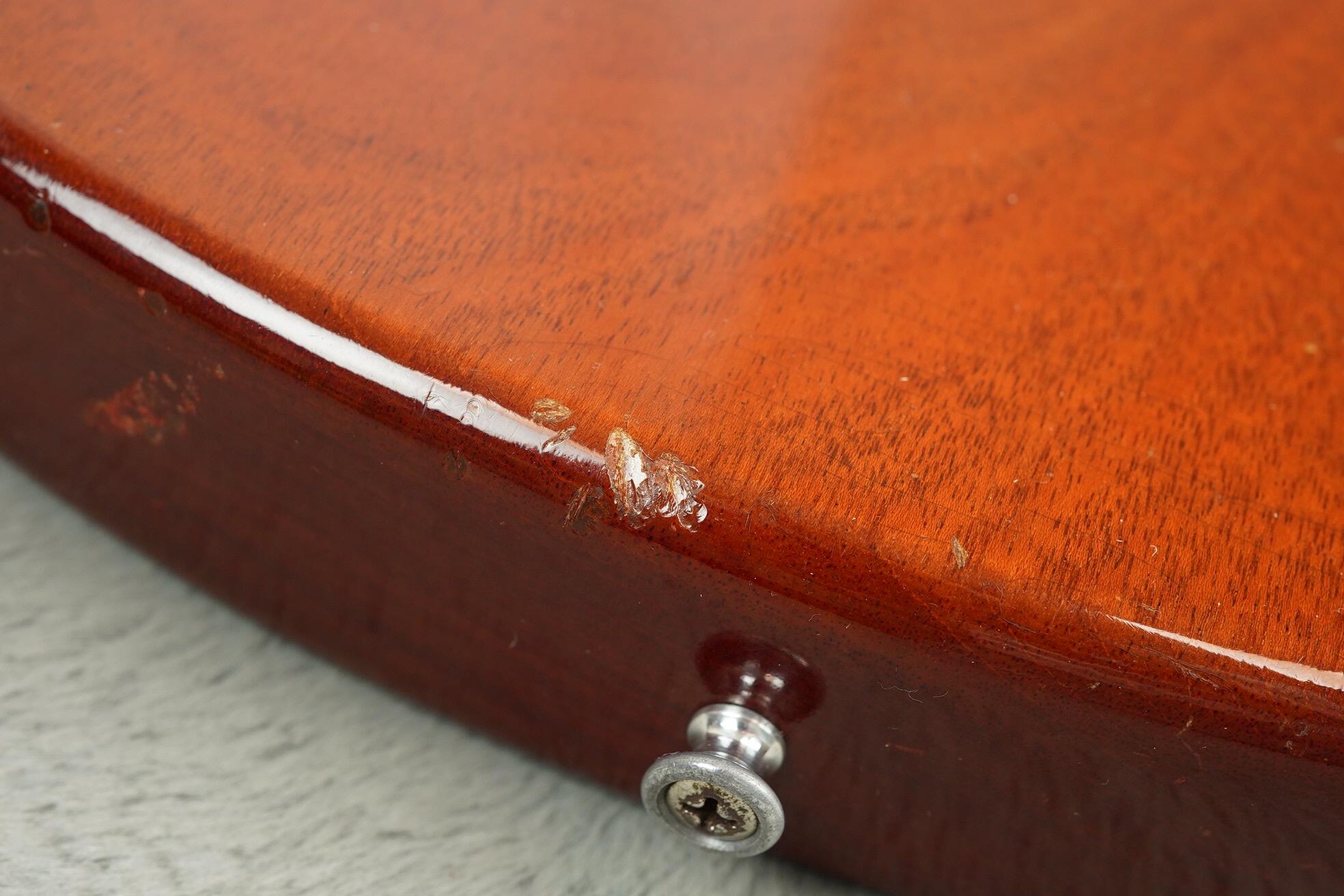 The nickel-plated wraparound bridge shows tarnishing and wear as do the posts, the tortoiseshell guard remains original and intact and there are two small filled holes on the top of the body. Otherwise there are no breaks or repairs.