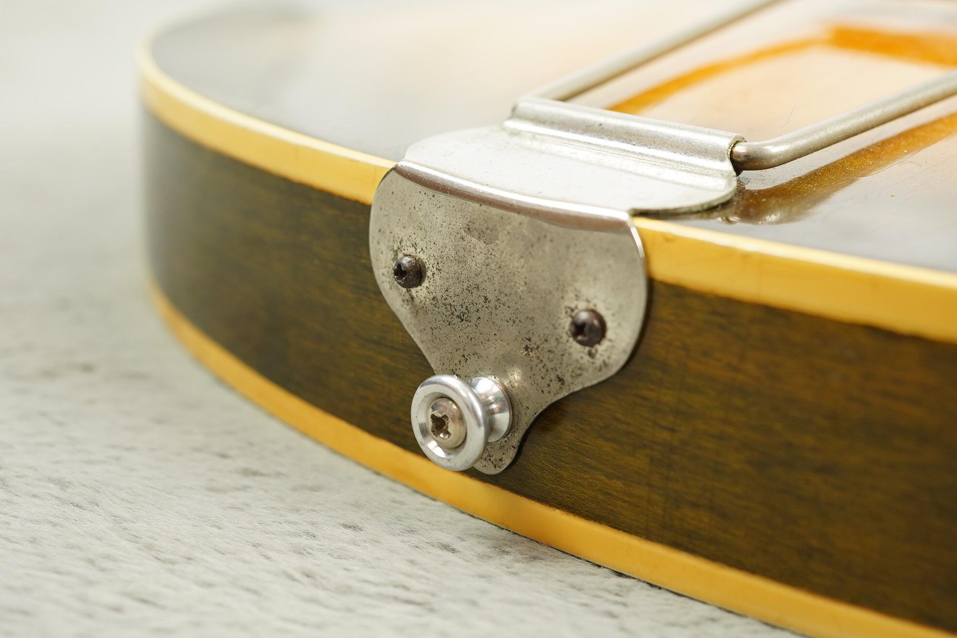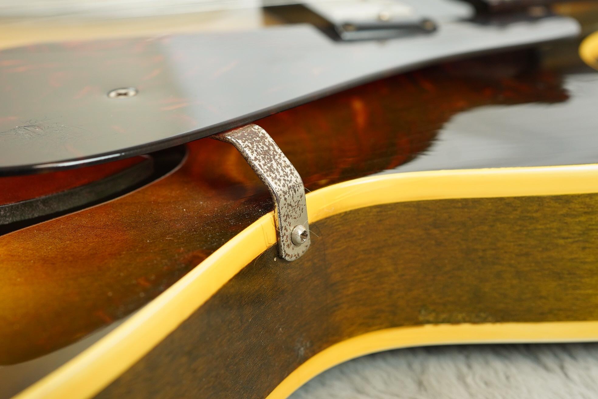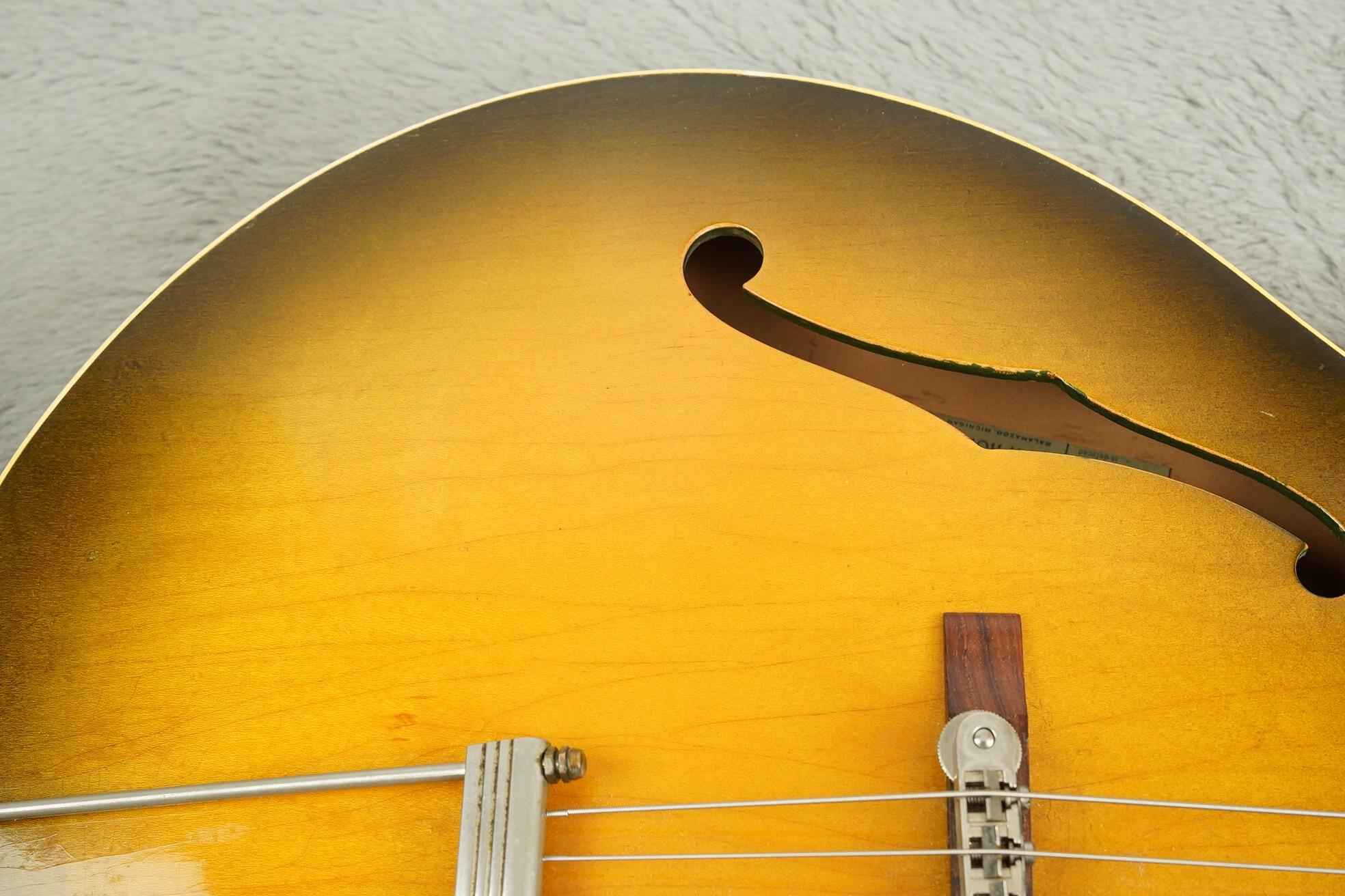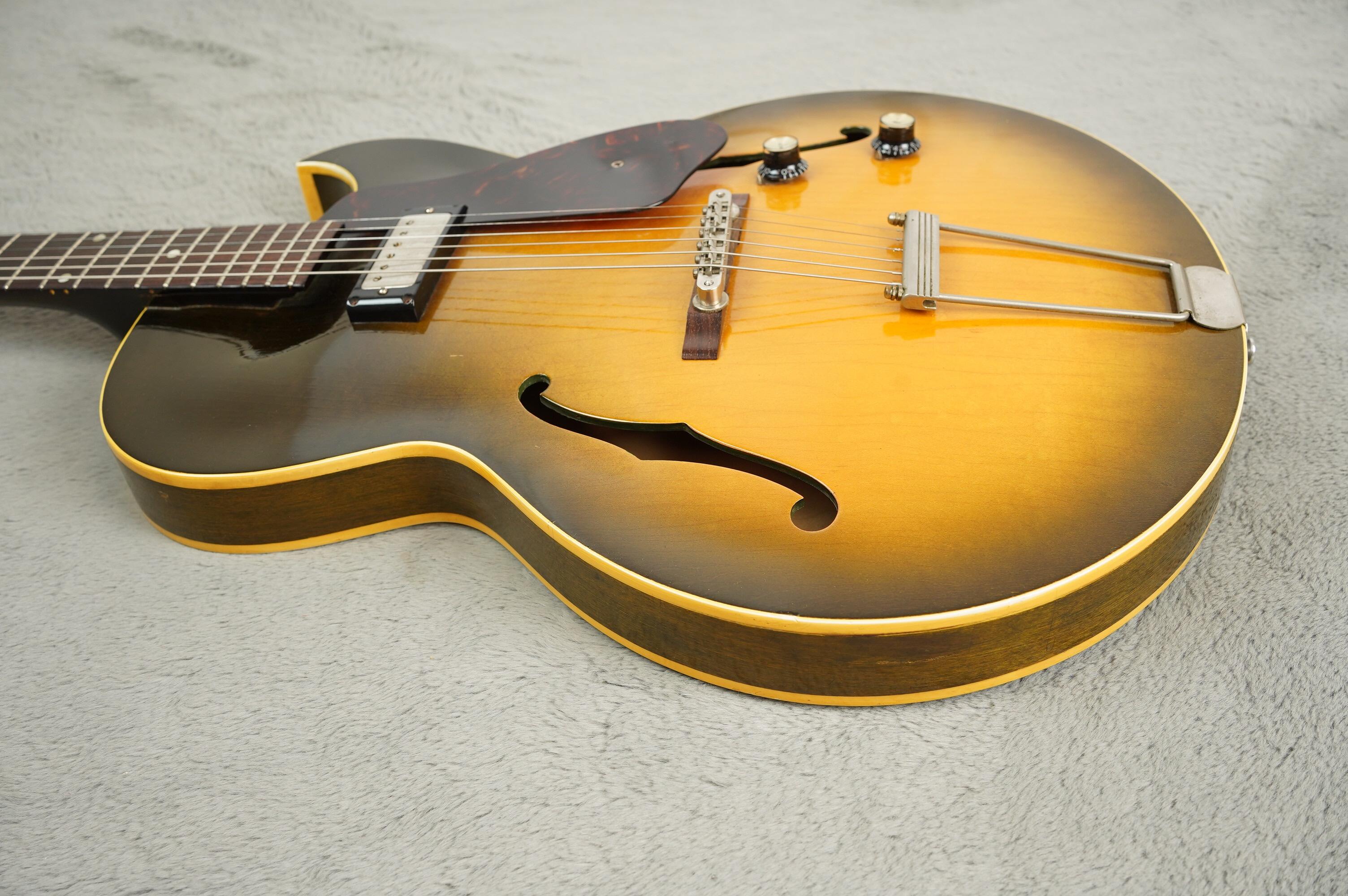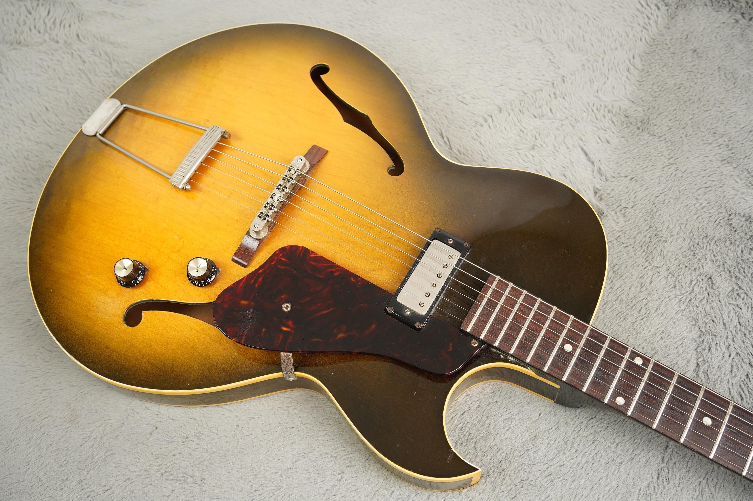 The single PAF mini-humbucker delivers a beautiful, articulate tone – brighter and tighter than a full-size humbucker but with more harmonic depth and warmth than a single coil. It’s a brilliant match for this fully hollow, laminated maple body – chiming cleans, warm jazz tones, or vintage rock ‘n roll growl, it’s a tonally rich and versatile pickup. The wired ABR-1 bridge and original nickel trapeze tailpiece complete the setup, with reflector knobs in place and a set of reproduction Kluson tuners installed. There's a stable crack along the treble side tuner line, and as you can see from the pics an additional truss rod cover screw hole has been added at some point.