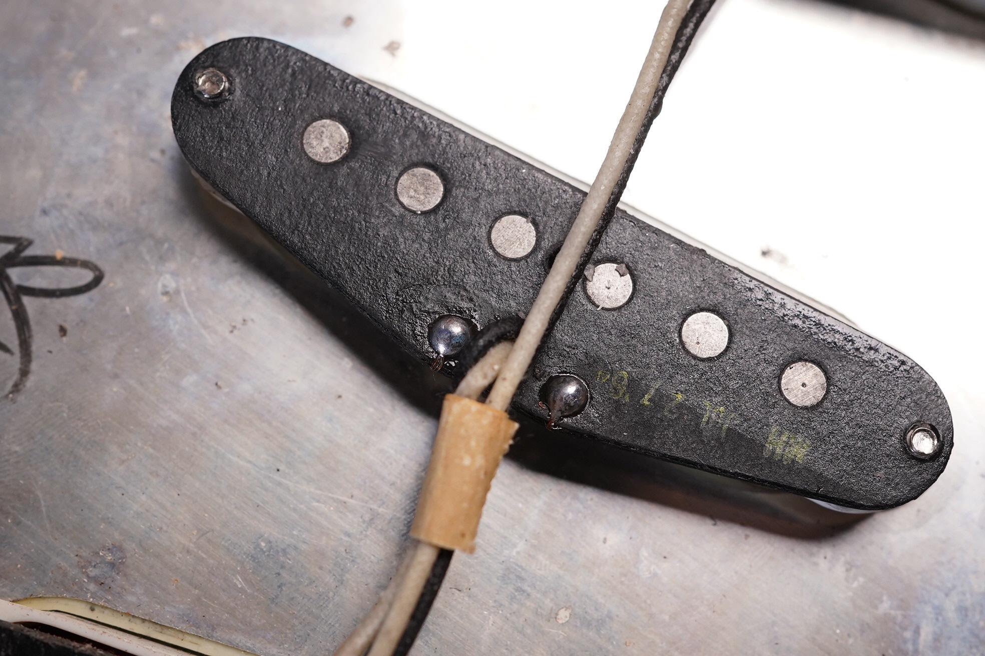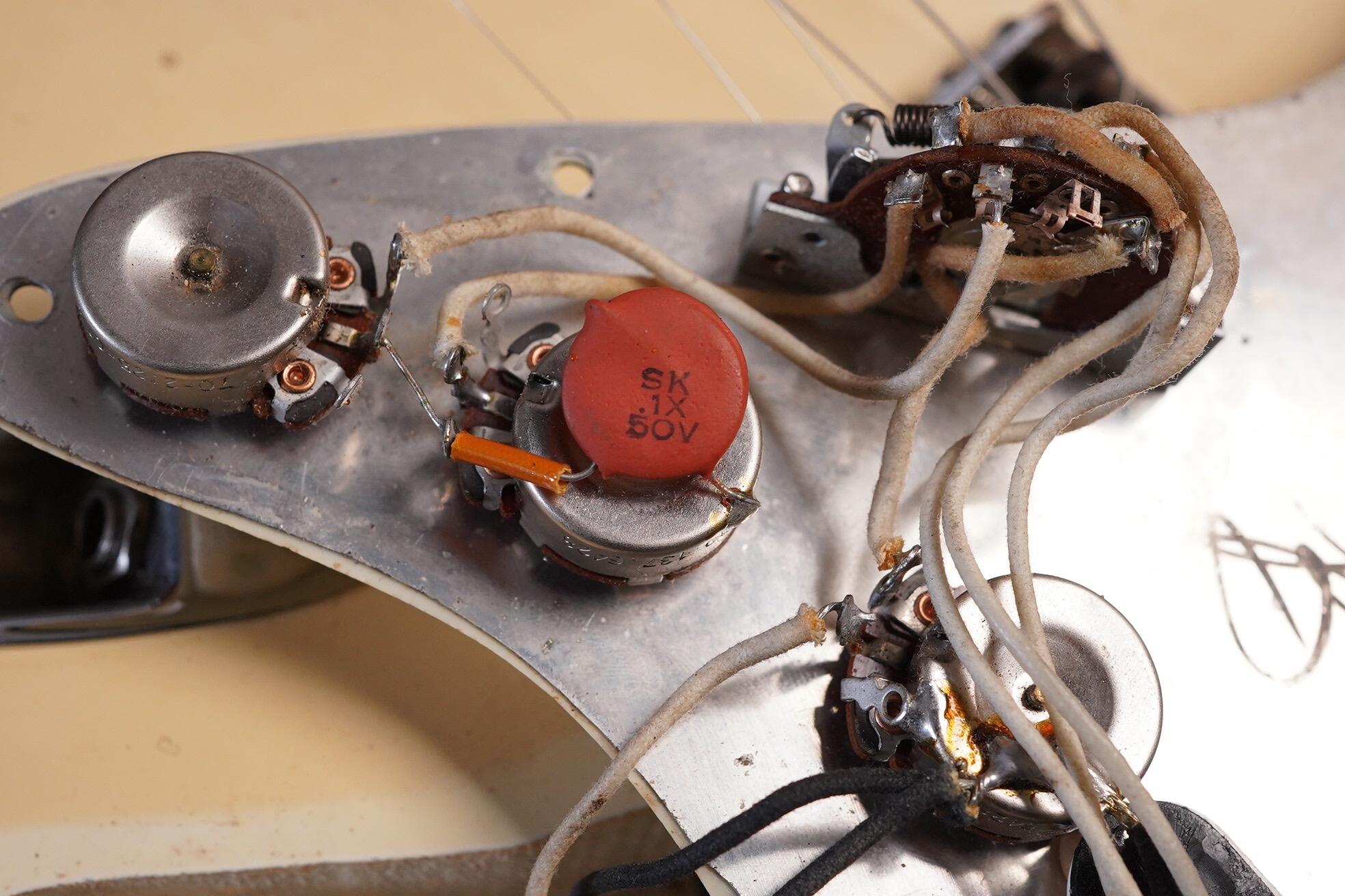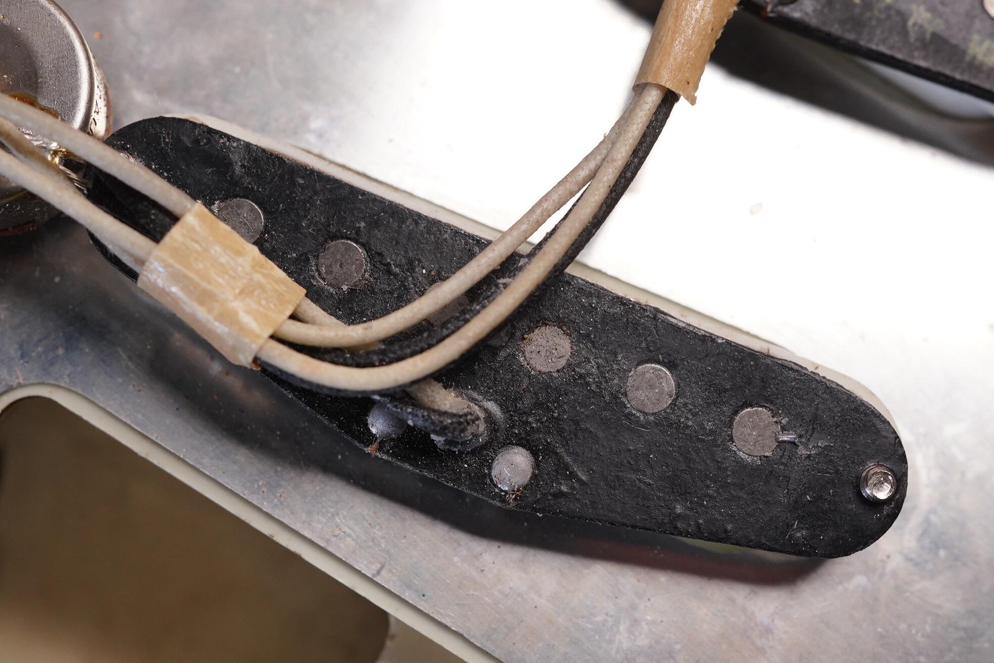 Electrically all is as you’d expect and most solder joints are undisturbed. The middle pickup has been repaired by Monty’s as it arrived to use with a fault. The other pickups are untouched.