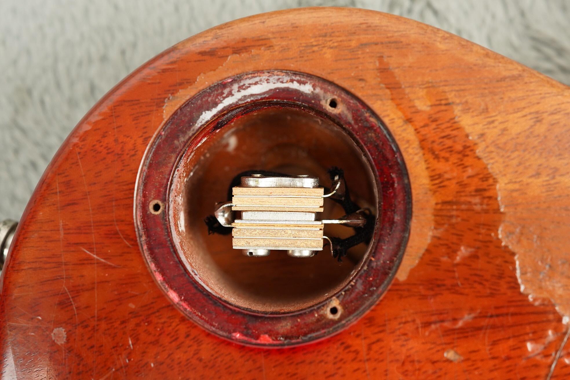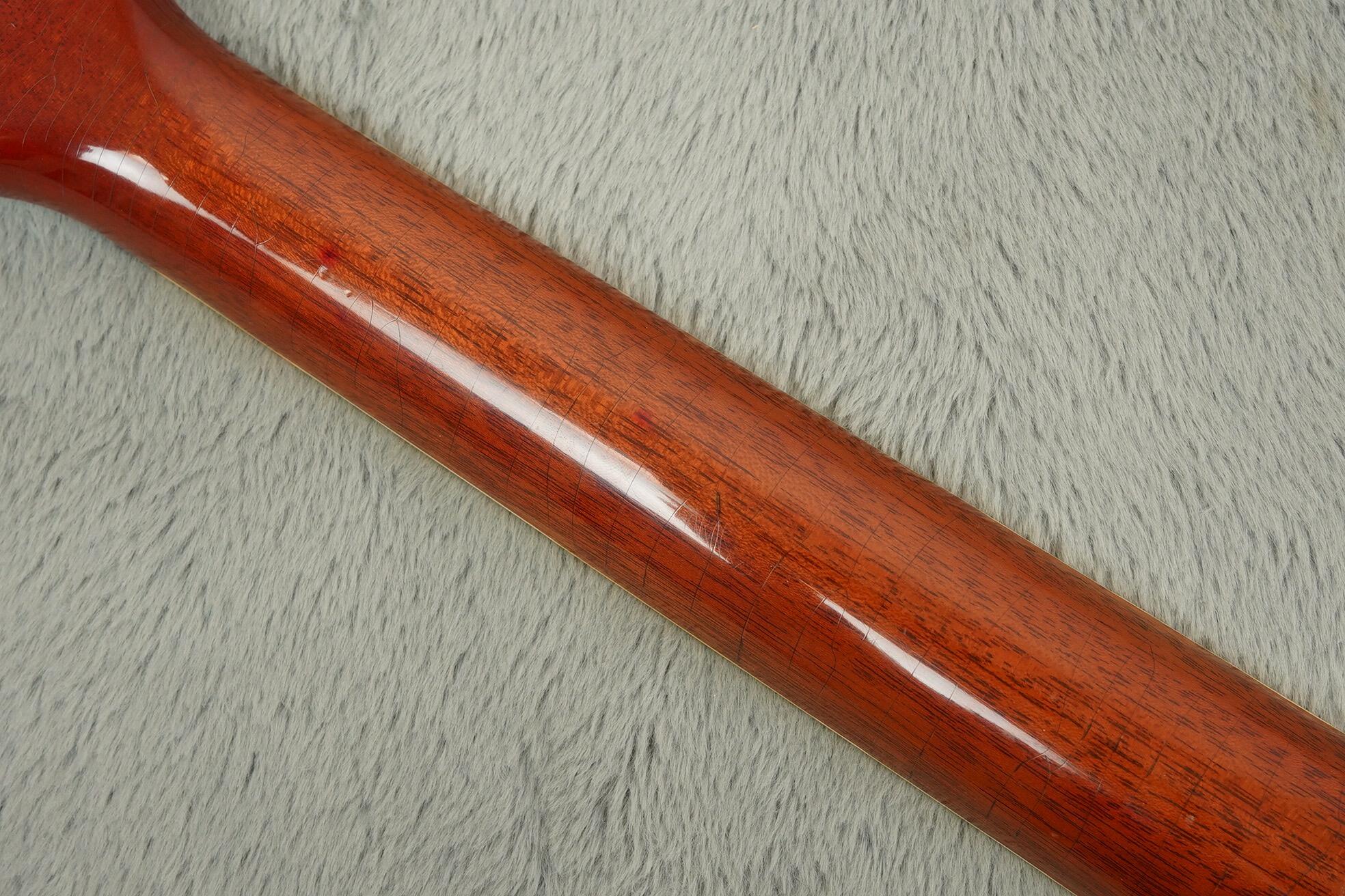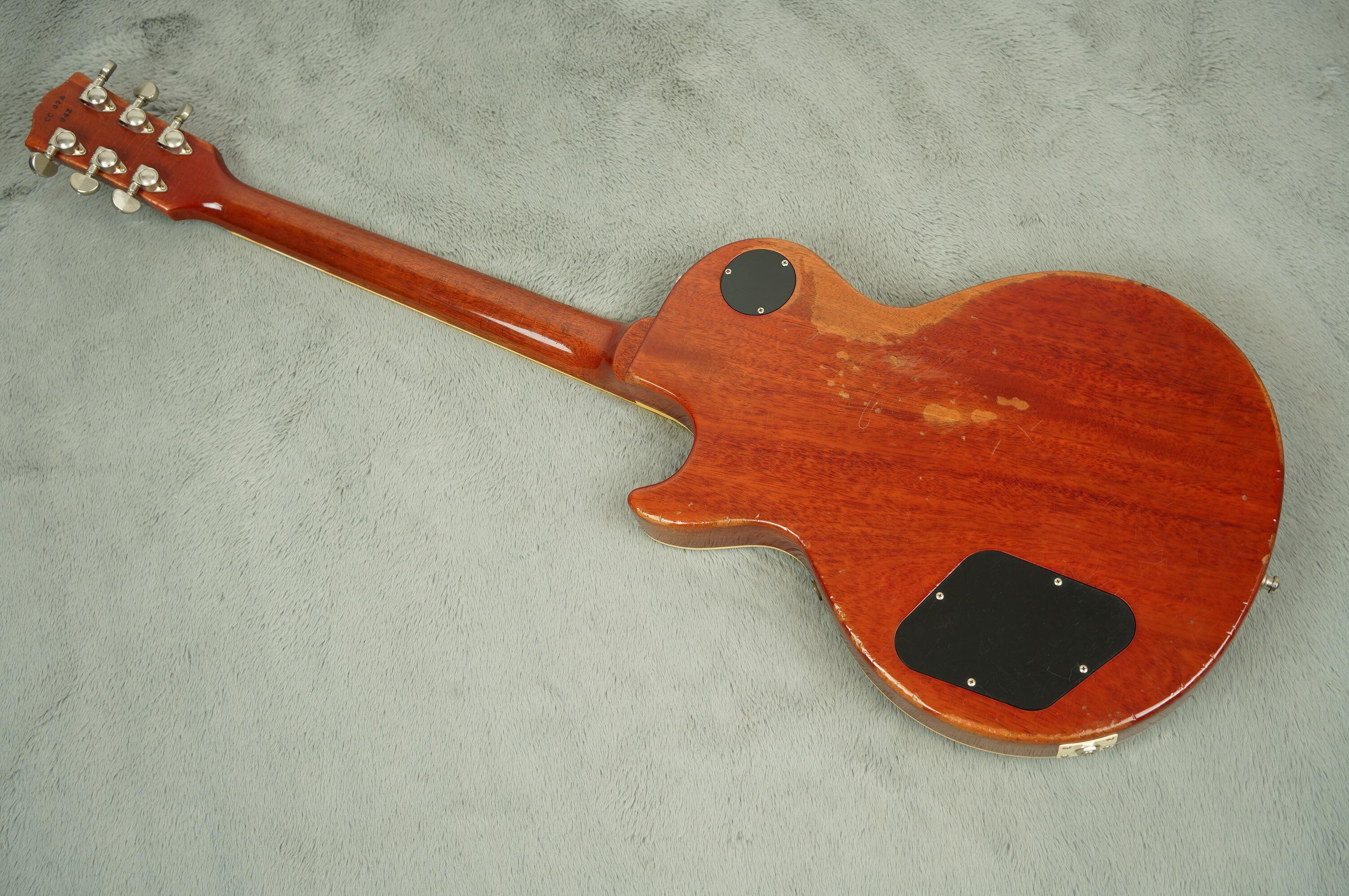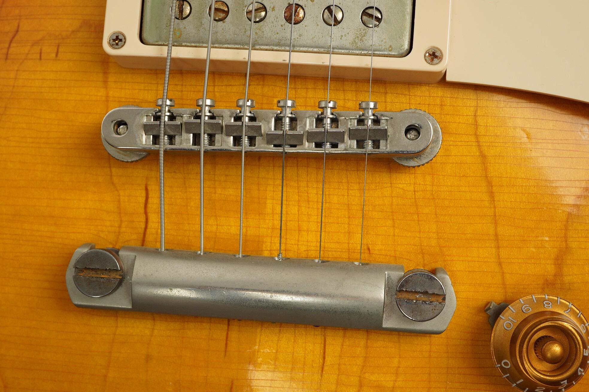 This guitar has a really nice deep ruby/brown sunburst with a beautiful grained Maple top. Like the original, it's not the flamiest you'll see, but it has a wonderful looking grain and mineral streaks that give us loads of character. The colour on this example is nicely faded with the perimeter holding on to some darker red-ish brown finish that frames the top nicely. As is so often the case with the Collectors Choice range, Gibson have replicated the original so well, with some excellent attention to details. The Murphy ageing is excellent, detailing the fine lacquer checking and wear present on the original. The yellowed binding and aged Nickel hardware finishes off what is a fantastic looking Les Paul.