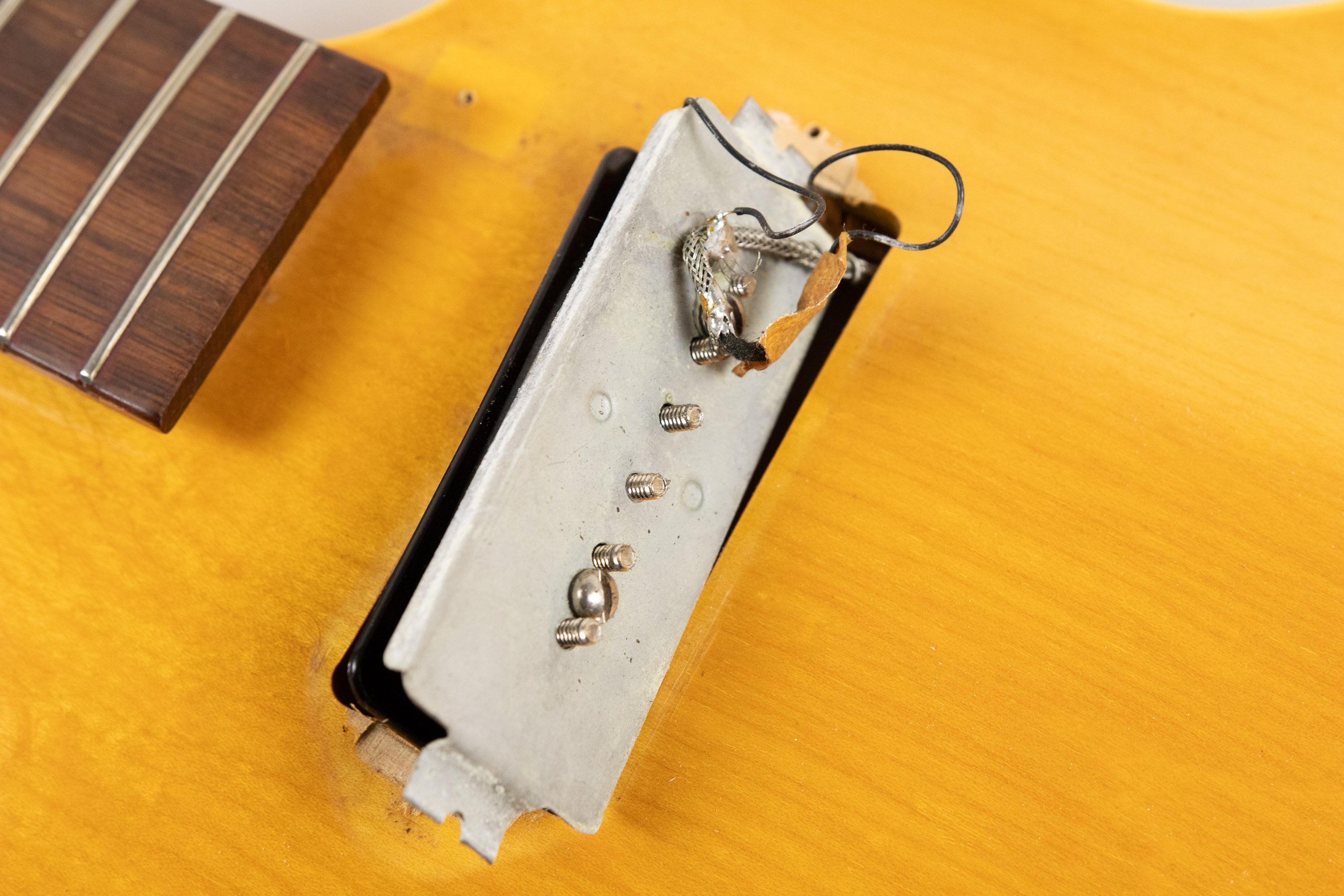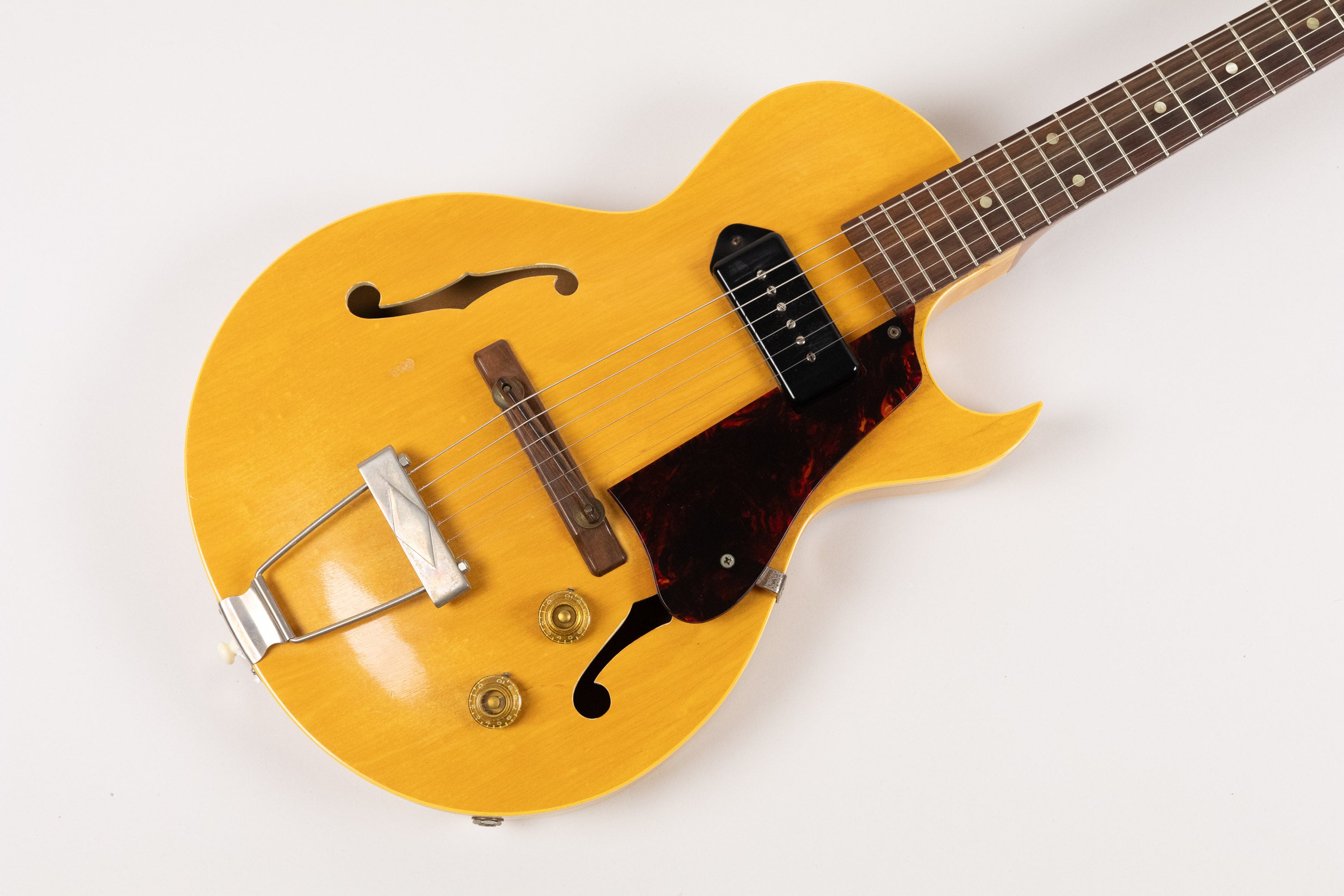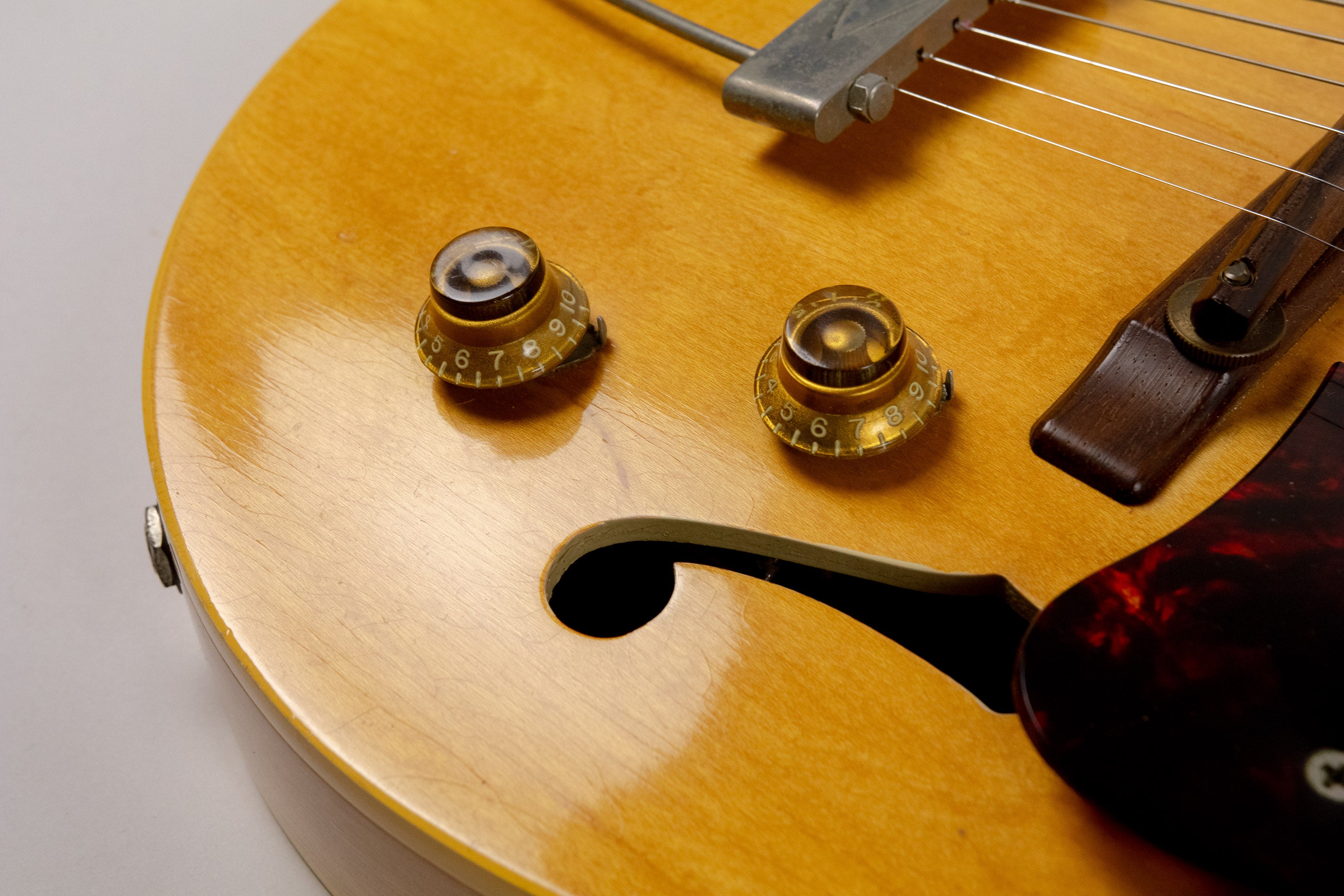 Besides the changed tuners, all hardware remains correct. The guitar retains its rosewood bridge with compensating saddle, the correct nickel trapeze tailpiece with raised diamond motif, and the distinctive tortoiseshell celluloid pickguard with original bracket. The amber bonnet knobs are also correct.