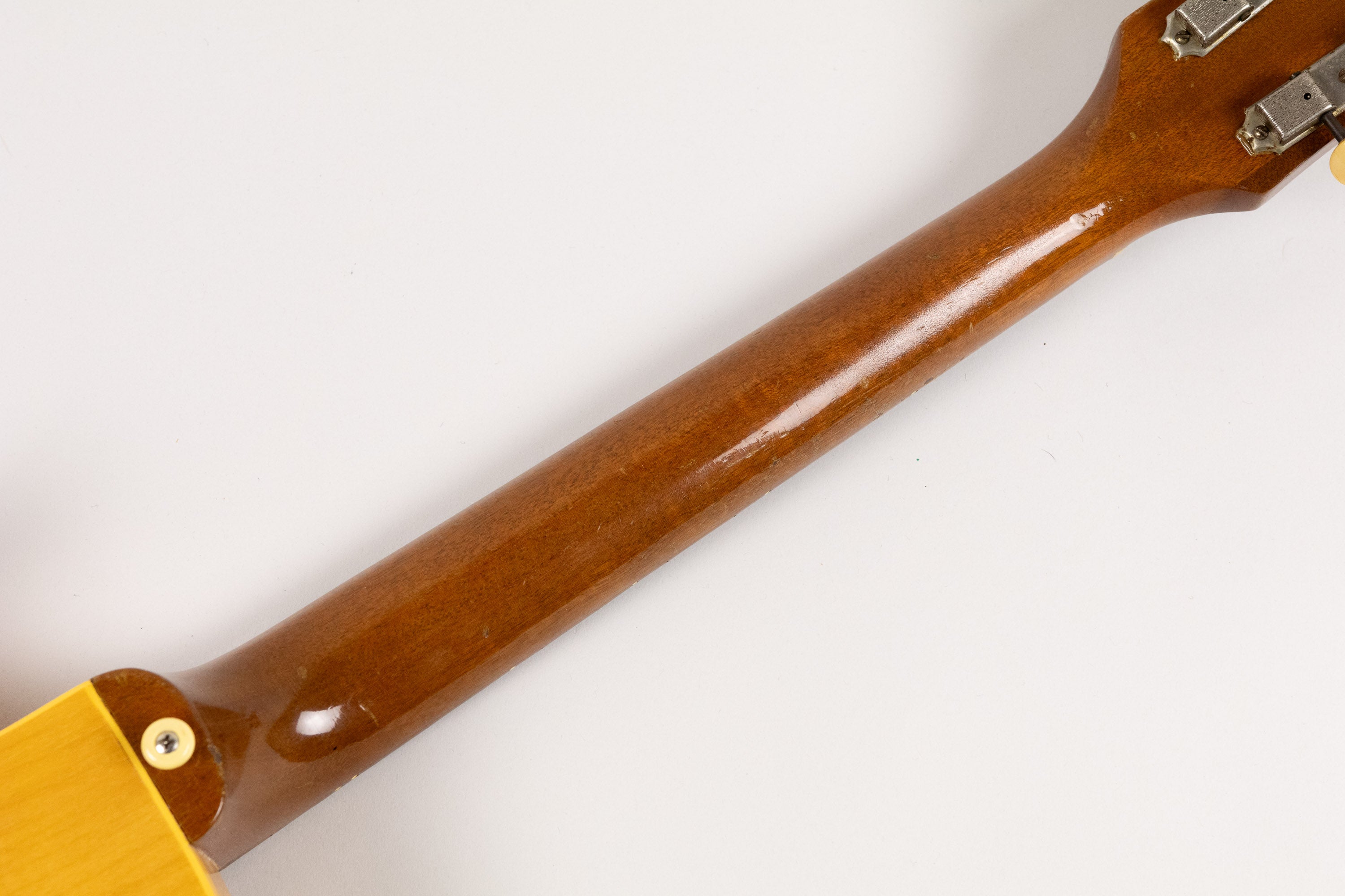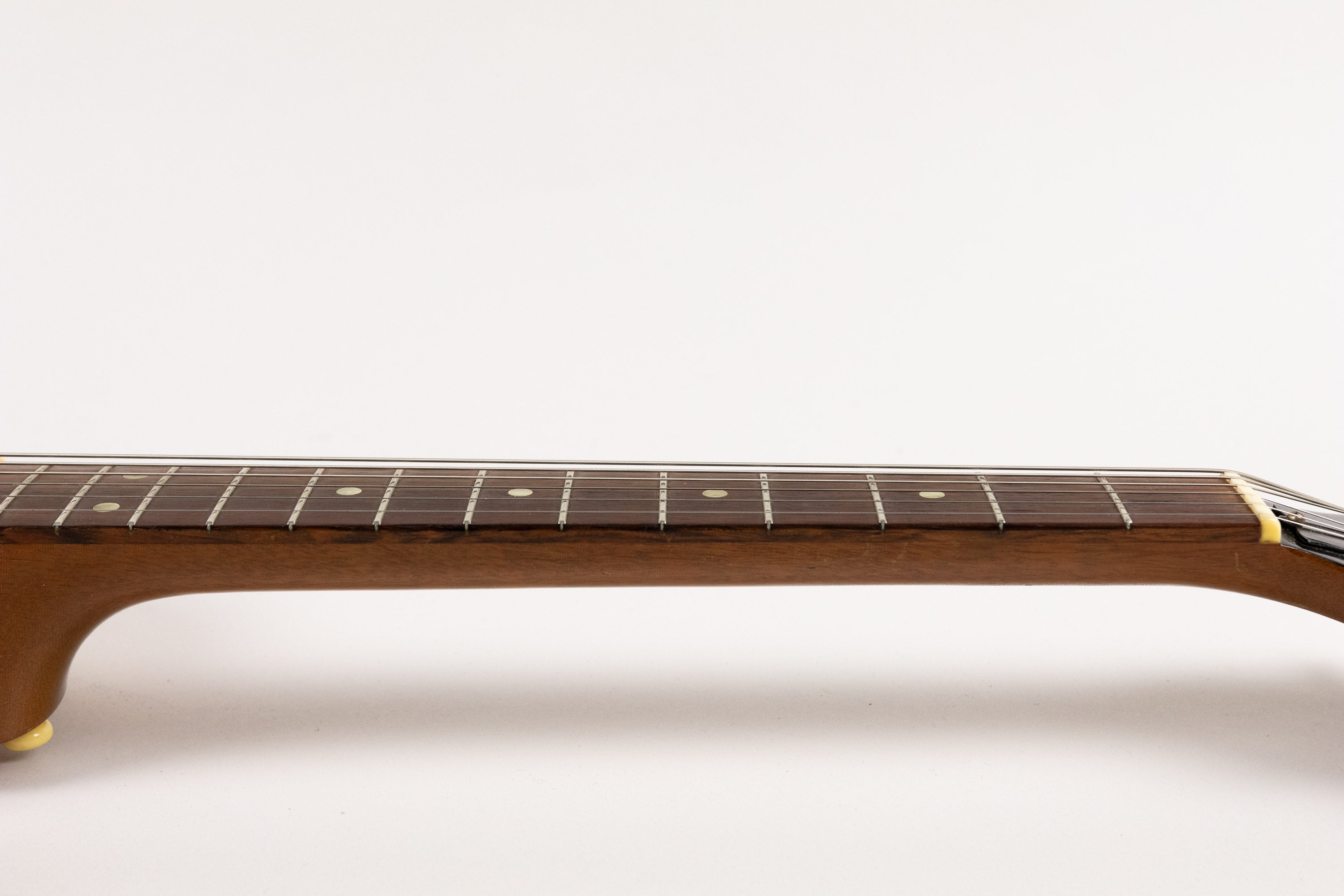 The one-piece mahogany neck is paired with an unbound rosewood fingerboard carrying pearl dot inlays. With its short 22¾" scale length and neck-to-body join at the 14th fret, the guitar has a lively and very comfortable feel. The neck finish remains in great shape and the instrument plays well with its original nut and original frets.