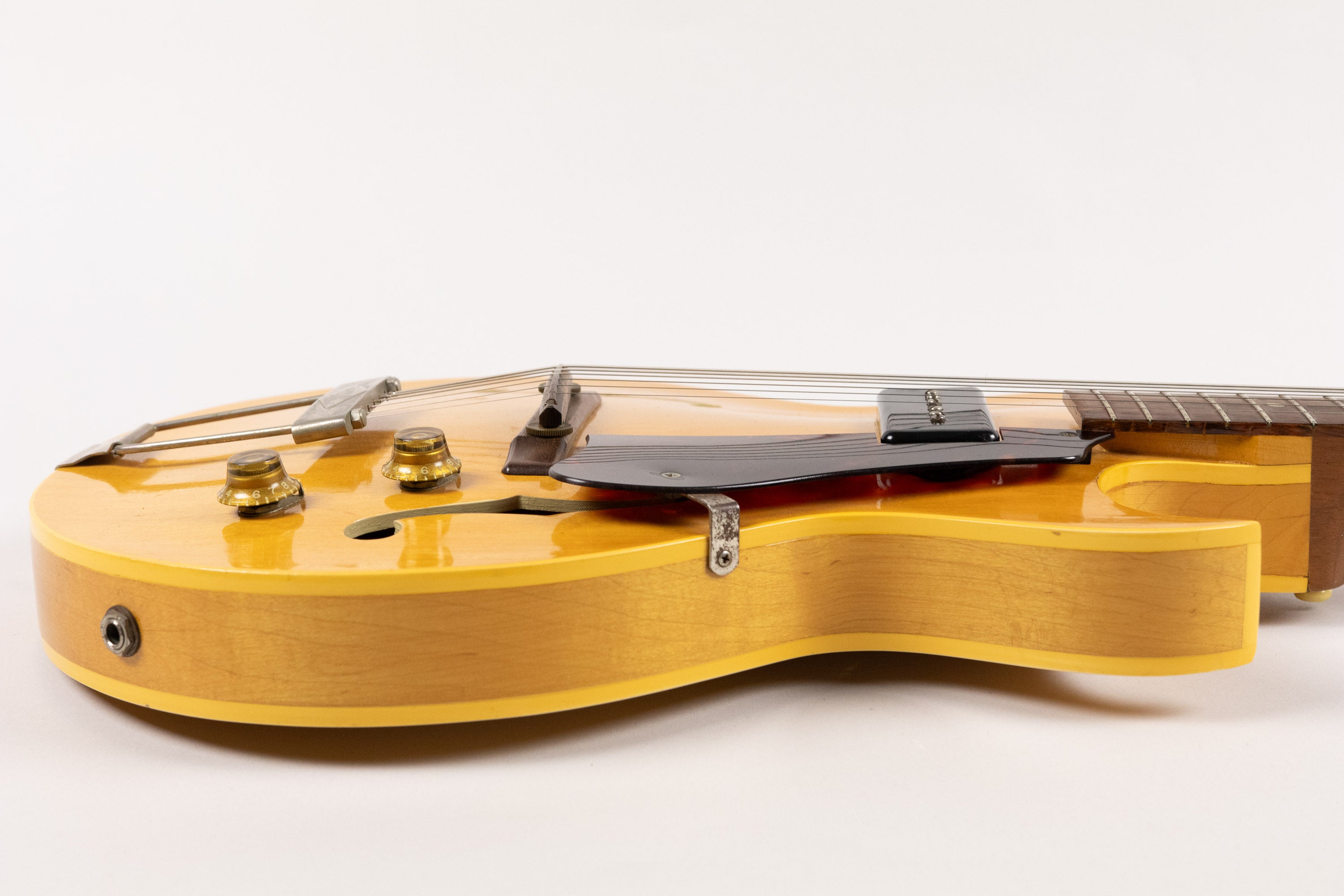 Electronics are centred around the original P-90 pickup in the neck position, controlled by volume and tone knobs mounted on the lower bout. This pickup delivers exactly the kind of clear, woody and articulate voice that small hollow Gibsons are known for, being warm and open at lower gain but with plenty of bite when pushed.