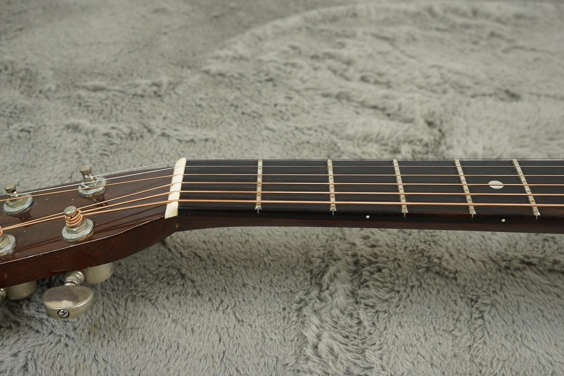 The neck has a very playable soft 'V' profile, the lacquer having worn from decades of use resulting in a very tactile, smooth feel in the hand. It's a very comfortable guitar to play, with plenty of height to the non-original frets. The action is spot on with good playability up the neck, whether you're chord/rhythm playing, lead playing or fingerpicking. The neck doesn't appear to have been reset and the saddle has only a small amount of height remaining. The bridge is a short saddle Rosewood replacement which has been bolted and dowelled with pearl dots.
