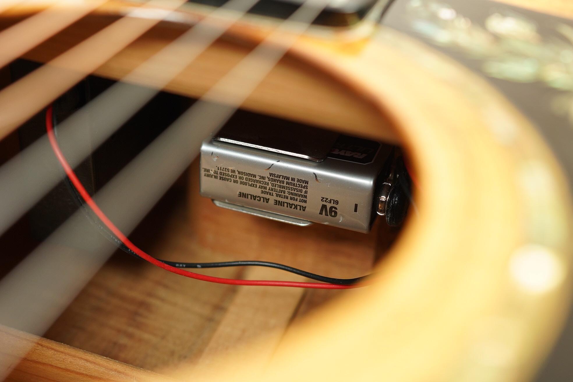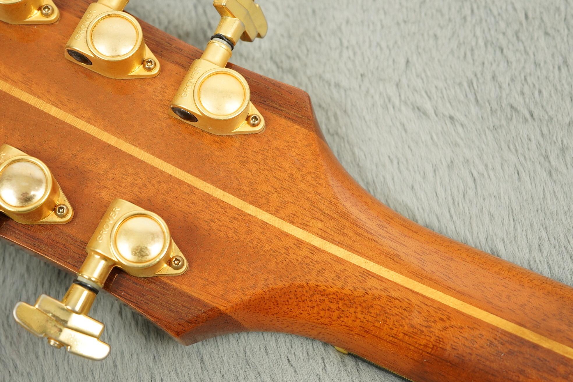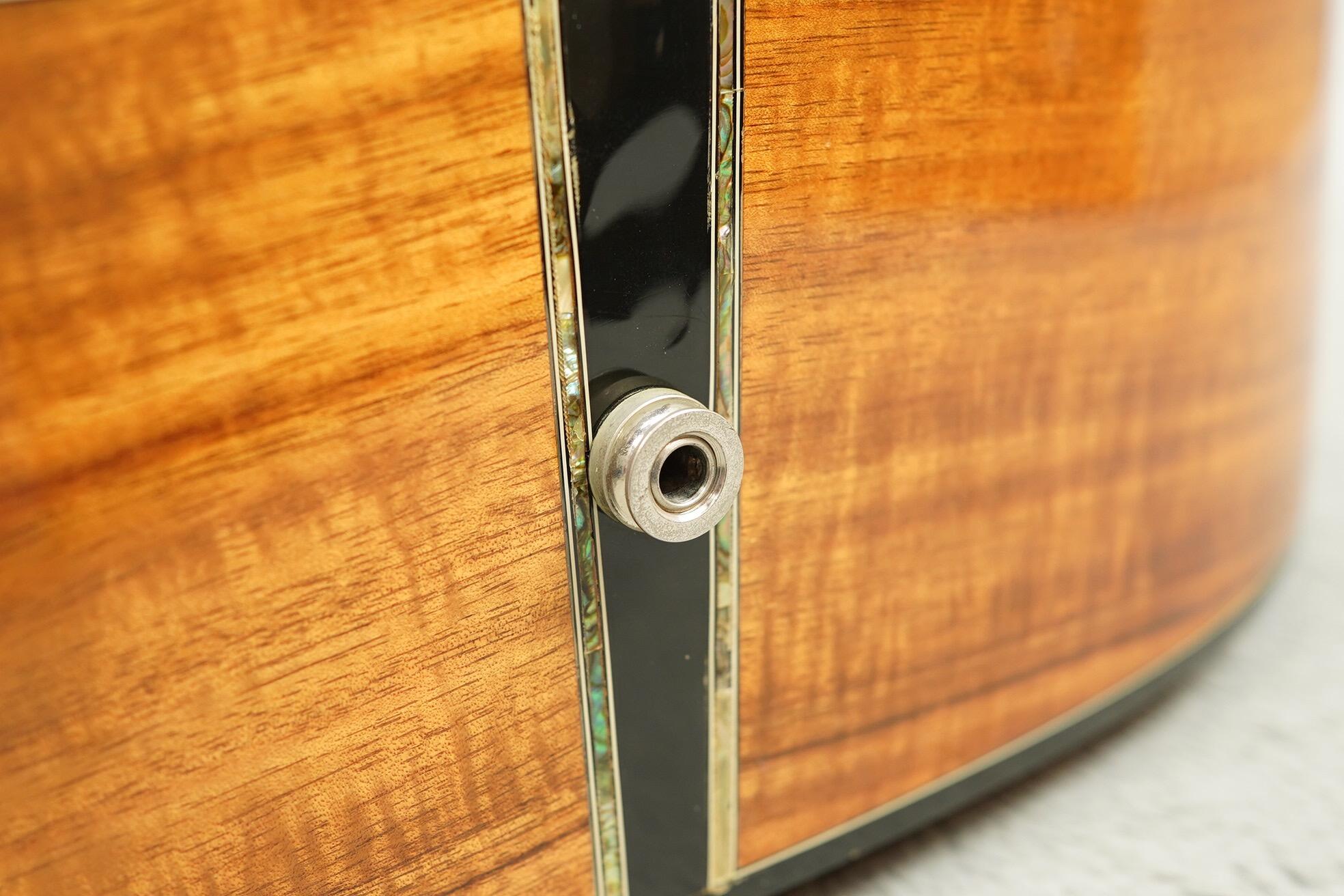Westerly made, it features a stunning, highly figured, flamed Koa top, Koa back and sides paired to a two-piece Mahogany neck with centre strip. The fingerboard and bridge are high grade Ebony. The appointments are befitting a high-end Limited Edition instrument with the eyes instantly drawn to the ornate pearl inlayed pickguard with elegant Peacock motif. The pearl theme continues with the multi-ply sound hole rosette, body binding and headstock mirroring position Markers and inner binding. The Headstock is inlayed in pearl with the Guild G-Shield logo and the truss rod cover is a suitably ornate gold plated piece. Tuners are gold plated Grover Rotomatics with Stairstep Imperial buttons. The guitar is still fitted with the original active pickup with setting markings still evident.