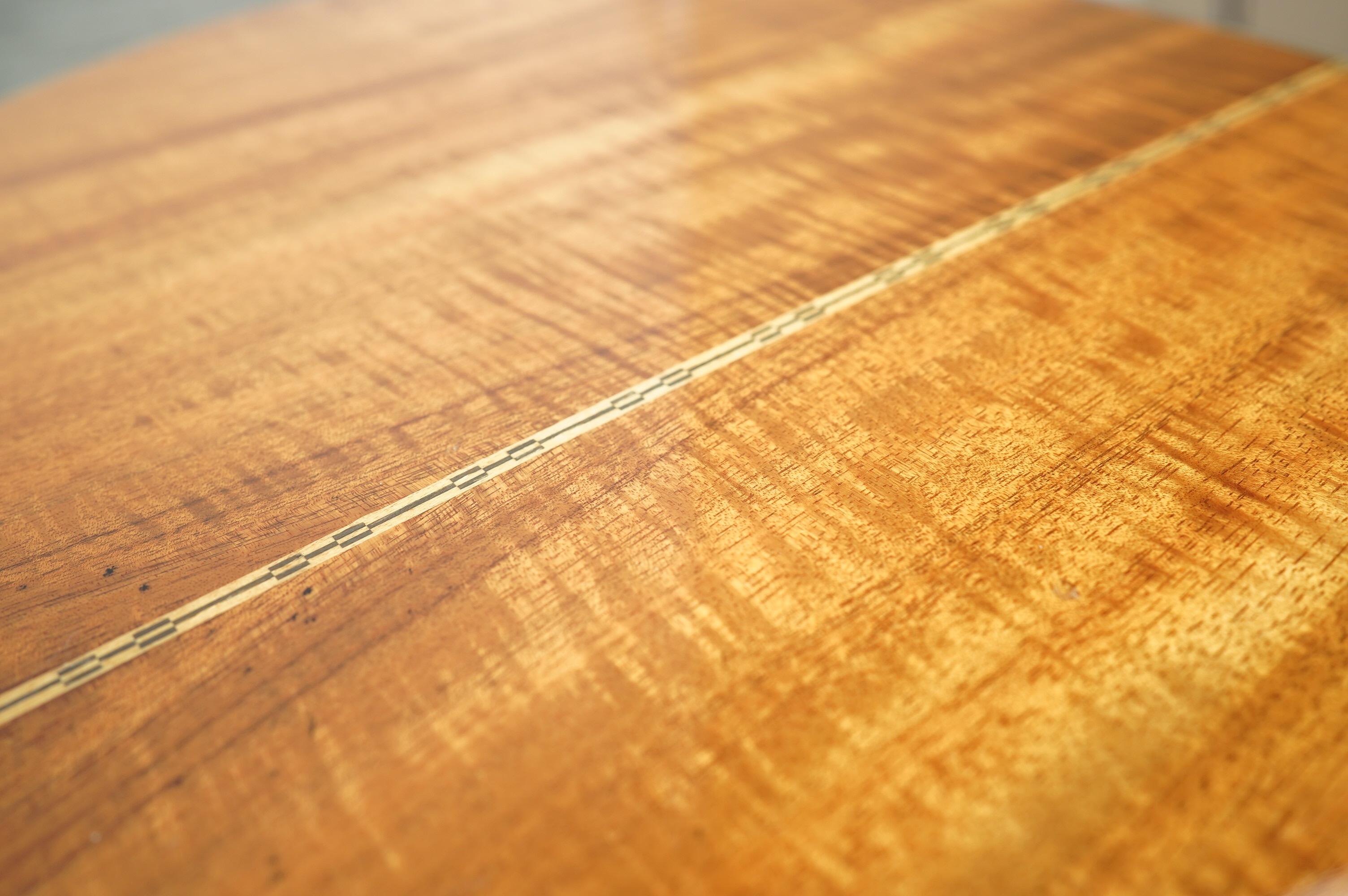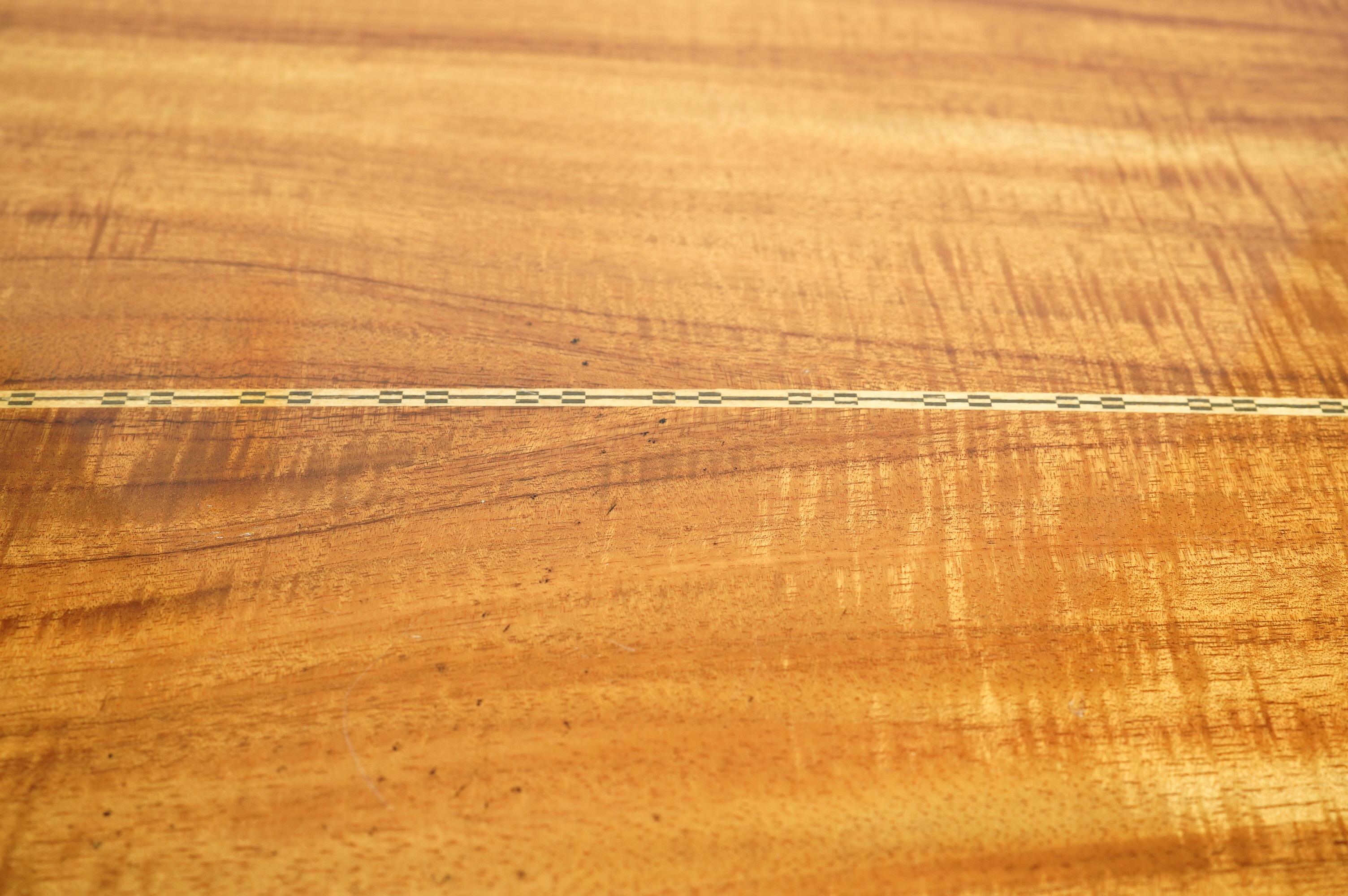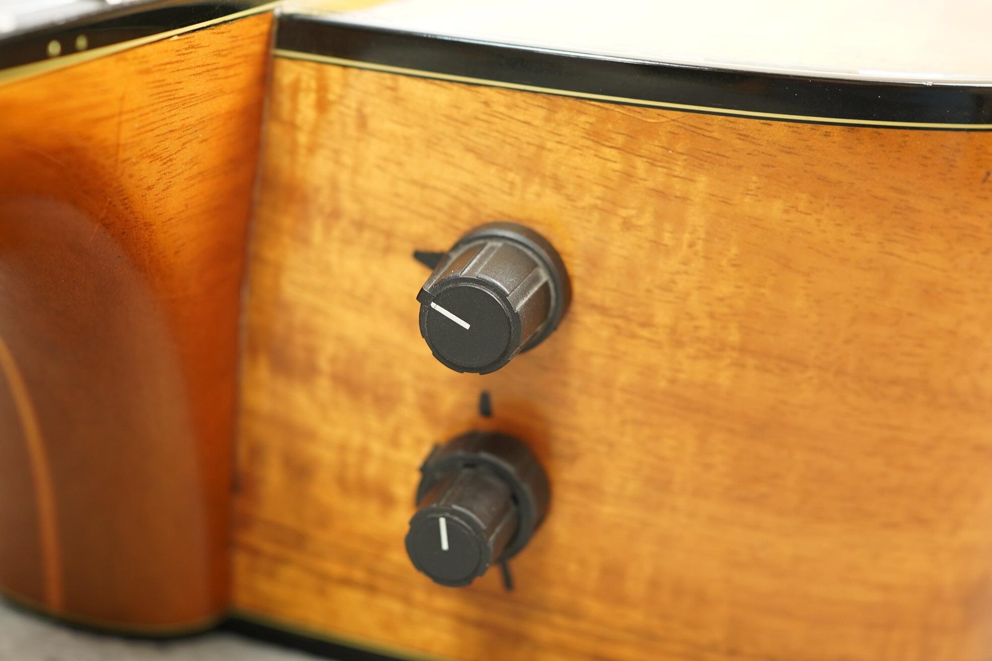Westerly made, it features a stunning, highly figured, flamed Koa top, Koa back and sides paired to a two-piece Mahogany neck with centre strip. The fingerboard and bridge are high grade Ebony. The appointments are befitting a high-end Limited Edition instrument with the eyes instantly drawn to the ornate pearl inlayed pickguard with elegant Peacock motif. The pearl theme continues with the multi-ply sound hole rosette, body binding and headstock mirroring position Markers and inner binding. The Headstock is inlayed in pearl with the Guild G-Shield logo and the truss rod cover is a suitably ornate gold plated piece. Tuners are gold plated Grover Rotomatics with Stairstep Imperial buttons. The guitar is still fitted with the original active pickup with setting markings still evident.