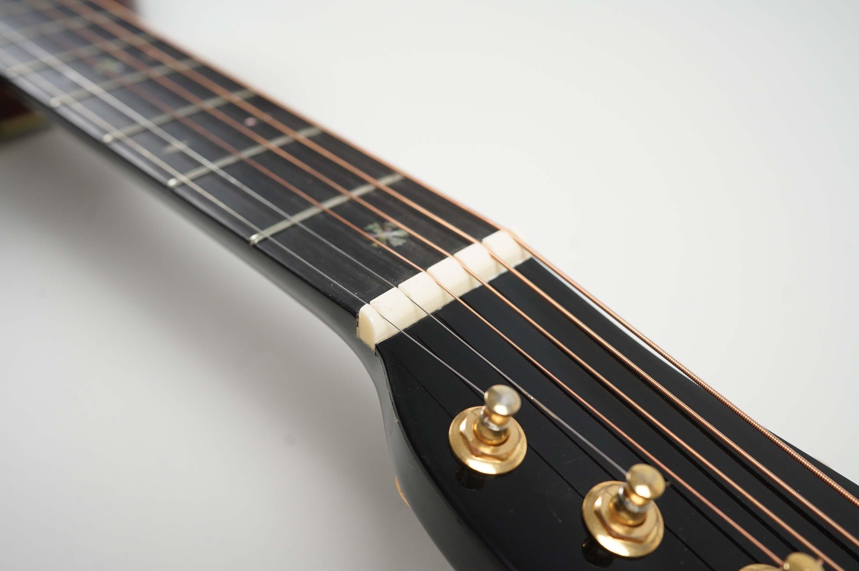 The 00-40 format is a 12-fret, grand concert-sized guitar, here built with a solid spruce top and East Indian rosewood back and sides. Scalloped X-bracing keeps the build light and responsive, while the ebony fingerboard and bridge add both durability and tonal focus. The guitar is richly bound, with snowflake inlays, ivoroid trim and a decorative backstrip, all consistent with Martin’s higher-end styles. The slotted “Stauffer-style” headstock carries six tuners in line on a single plate, a striking and unusual touch that sets this model apart visually as well as historically.