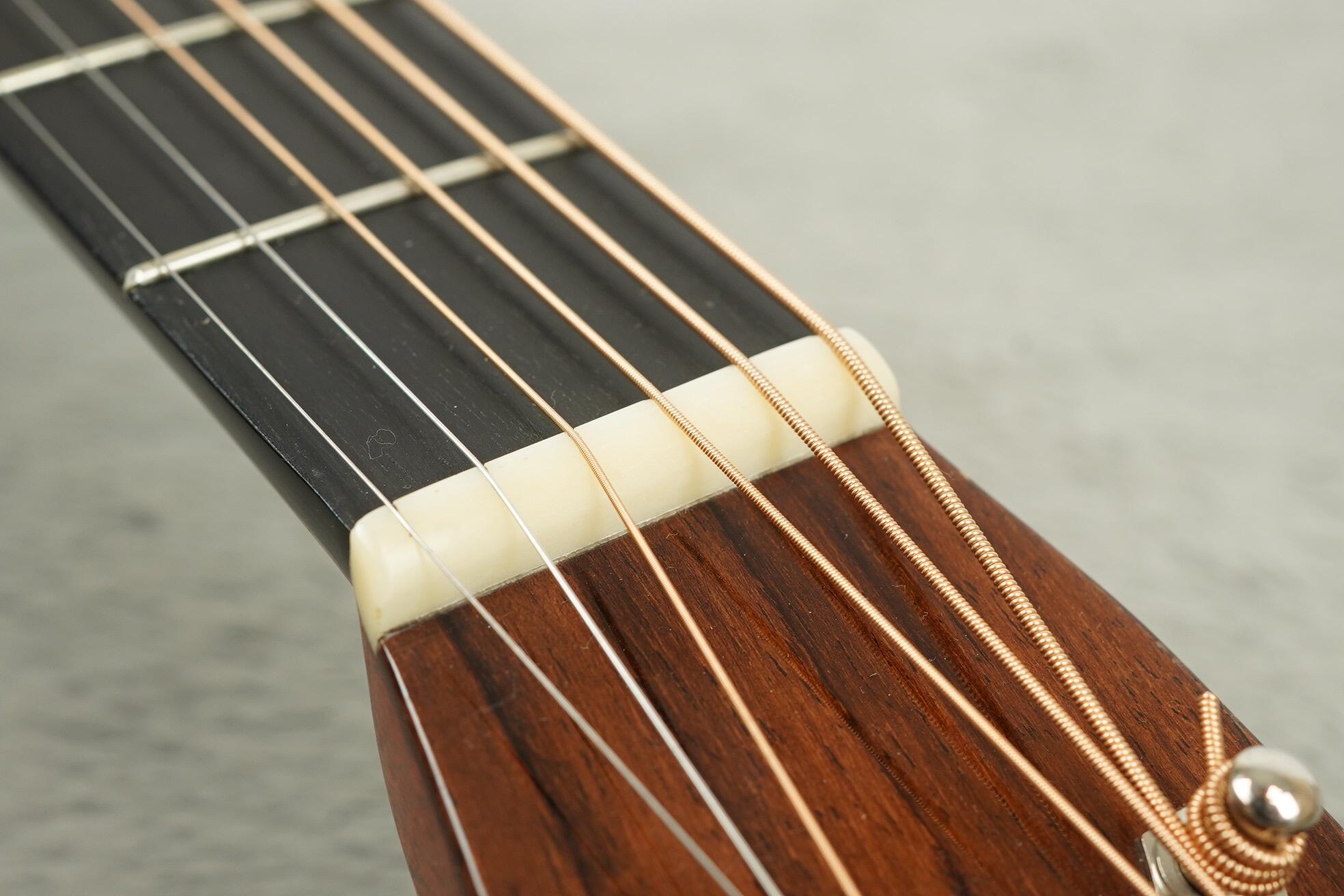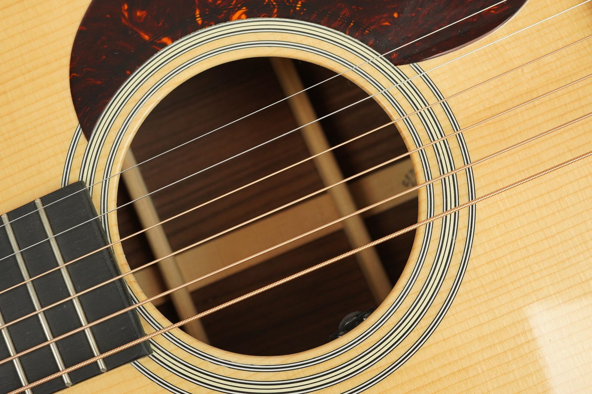 Construction is true to the pre-war recipe, with Adirondack spruce and rosewood back/sides, joined using hide glue and cloth strip reinforcement. The forward-shifted, scalloped X-bracing is cut from Adirondack spruce, giving the guitar remarkable projection and tonal depth. An adjustable truss rod has been subtly introduced, offering modern convenience and tweakability.