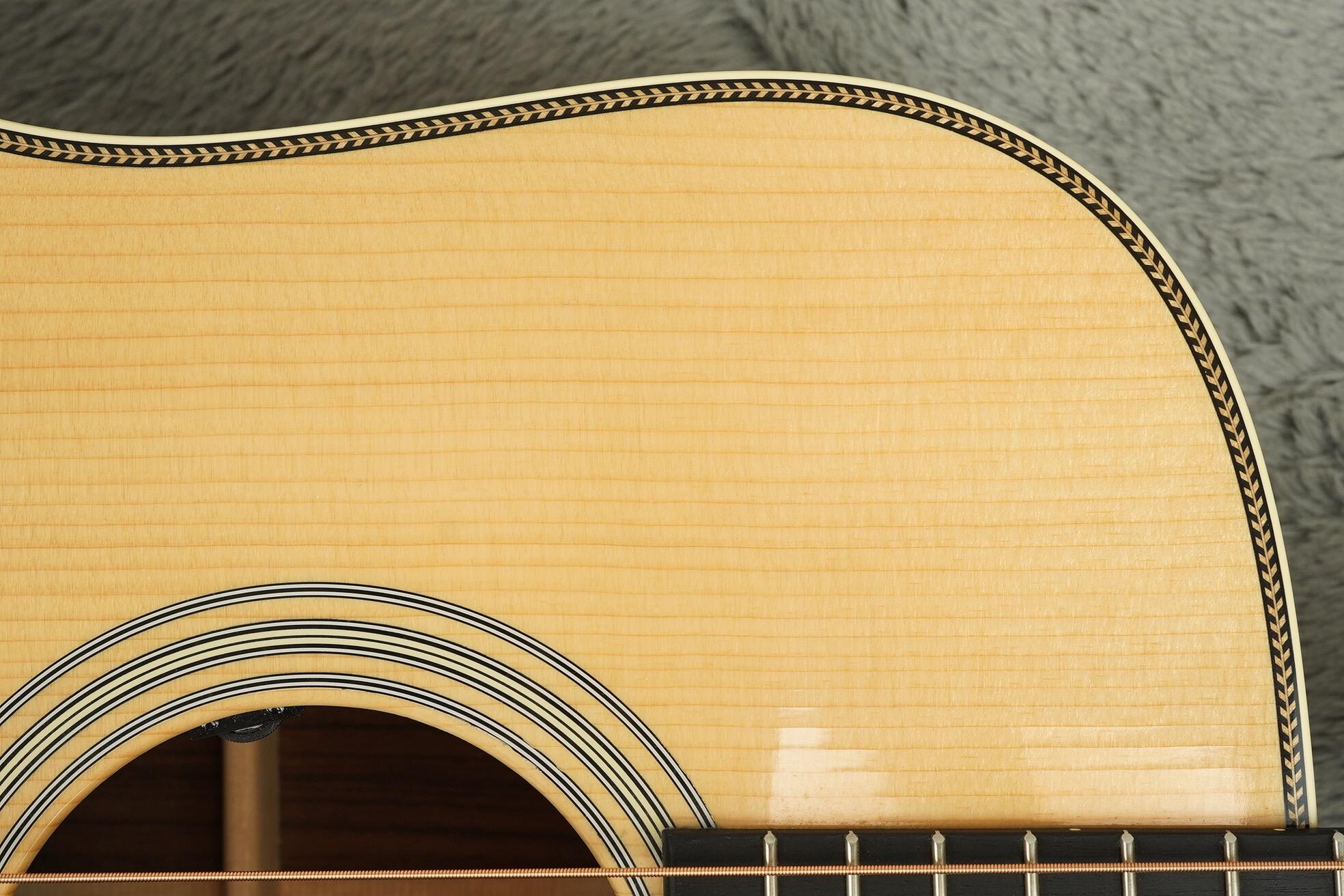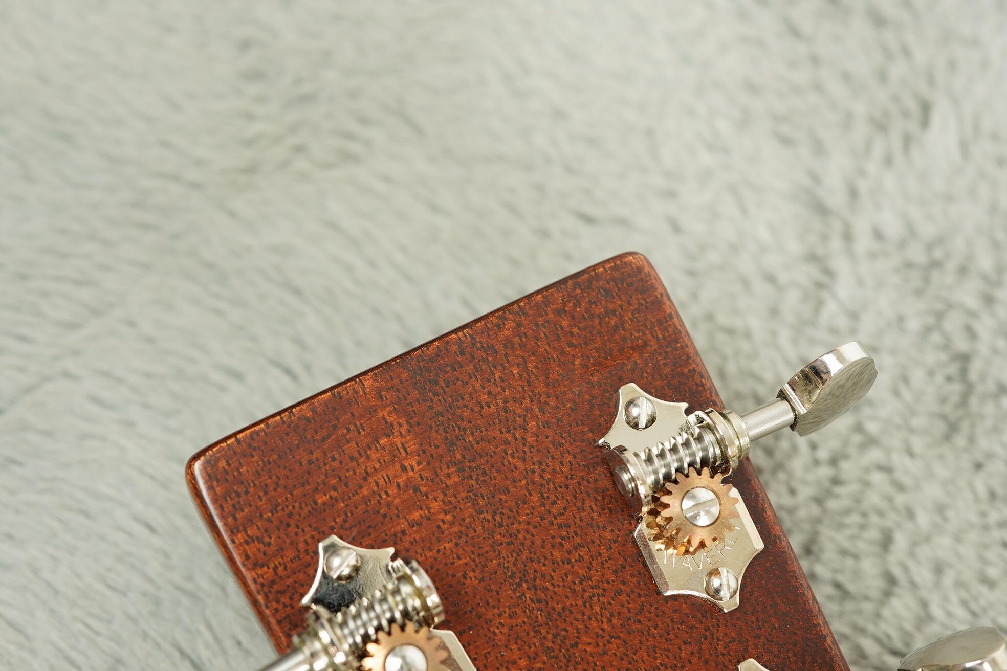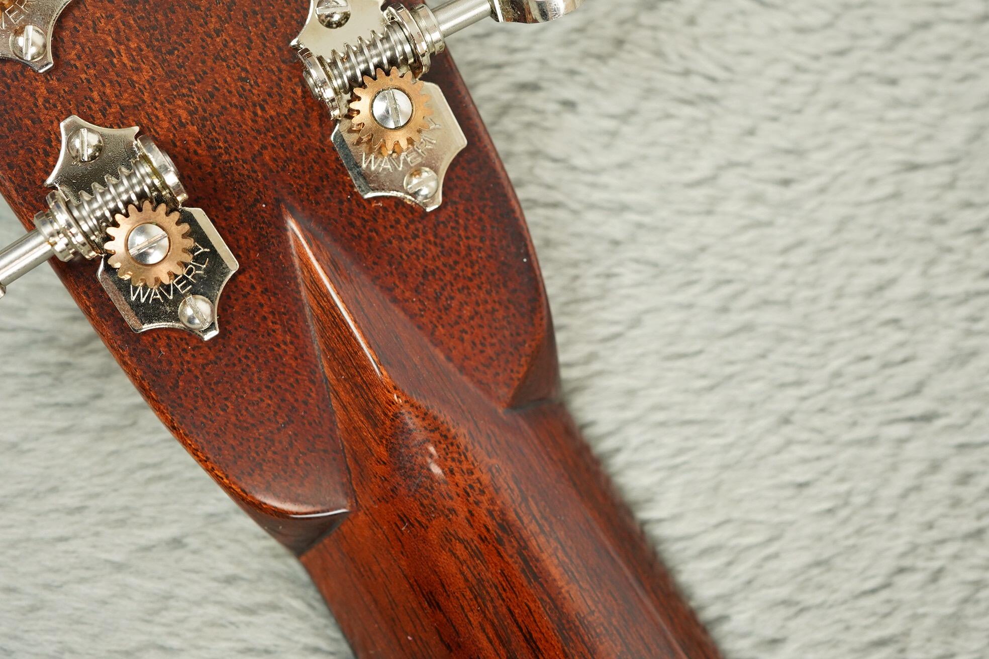 Spec-wise, it’s everything you’d hope for: a D-14 fret body with Adirondack spruce top, bold herringbone purfling, zig-zag back strip, and antique white binding. The long saddle 1930s-style belly bridge and ebony fingerboard bring authentic detail, matched with diamond & square long abalone inlays. The neck is genuine mahogany, carved to the chunky 1937 profile with a standard taper, 1 3/4" nut, and 2 1/4" width at the 12th fret. Waverly nickel open-back tuners with butterbean knobs, bone nut and saddle, and a tortoise-pattern guard complete the look.