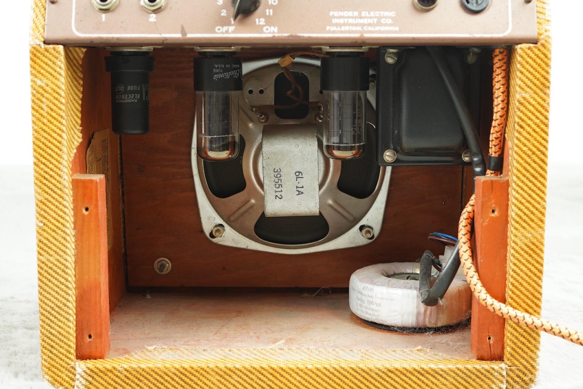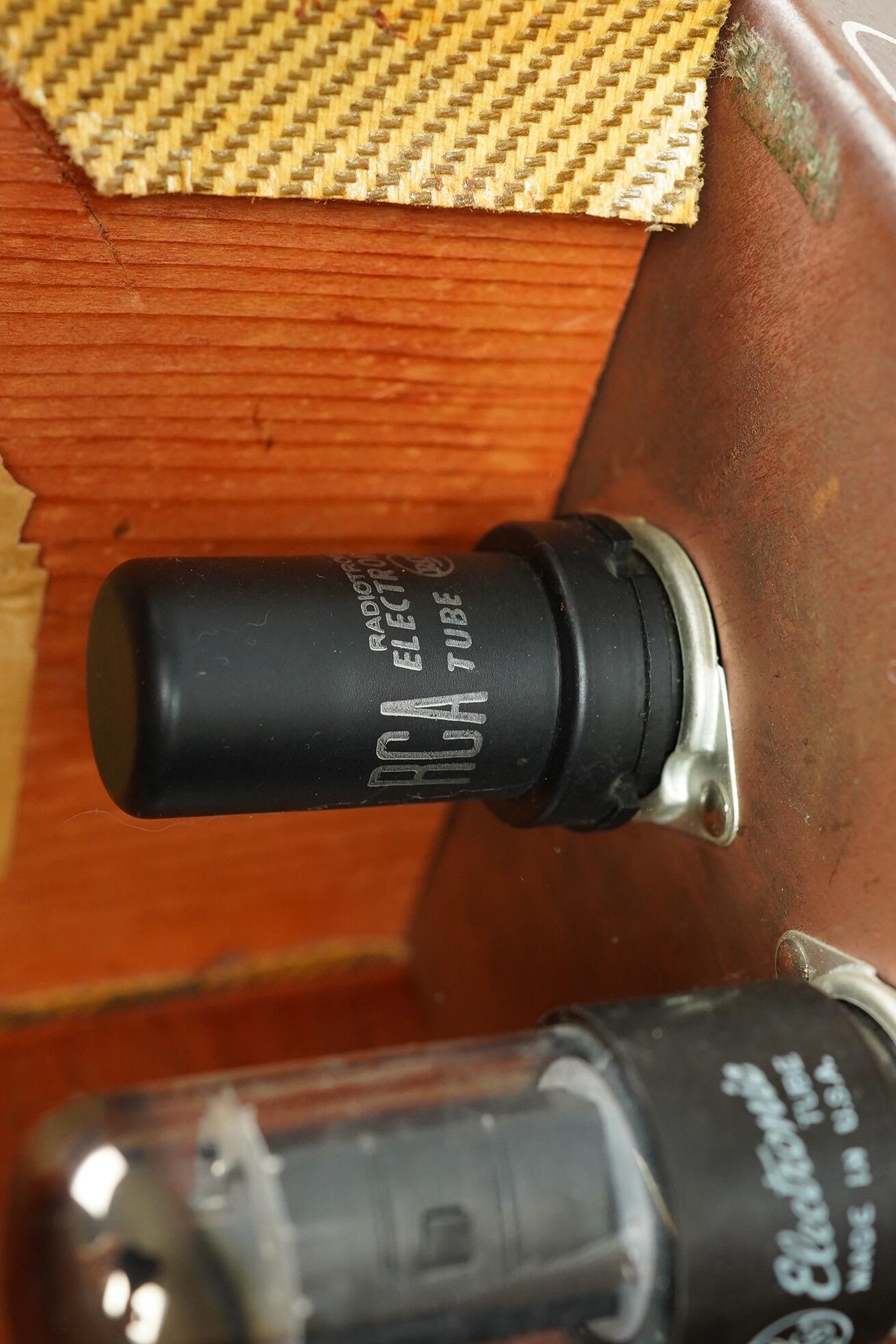The amp is still fitted with its correct speaker. Internally we believe it to be original, but the chassis didn't want to be removed without taking the tolex with it so we haven't been able to look inside. The correct output transformer is still present.