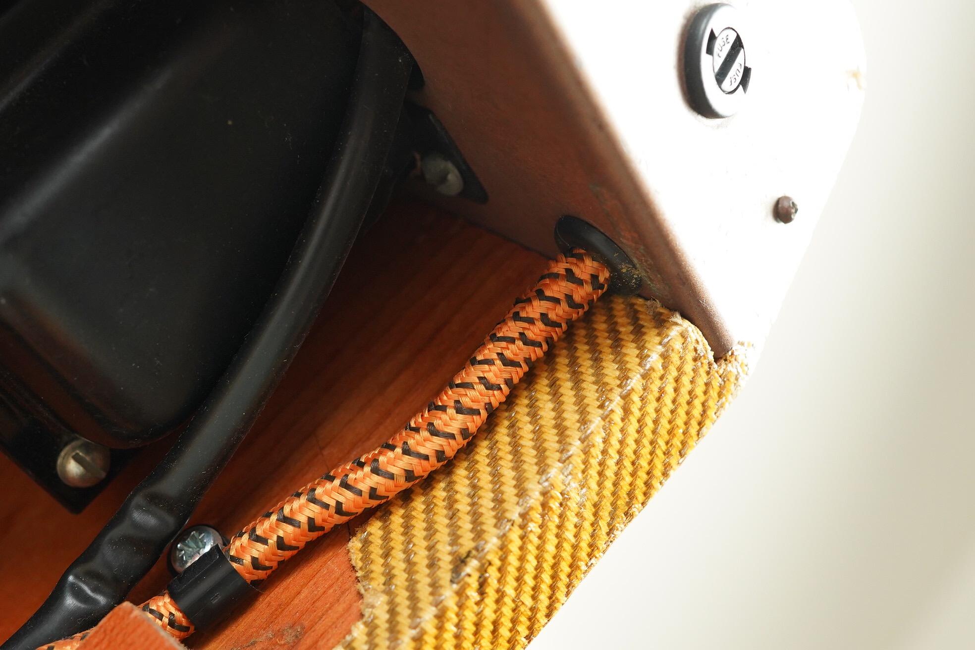 This is a well used example, that's been played and kept in working order. It has an extra step down transformer bolted into the cabinet, allowing for plug and play use in the UK. The tweed has also been re-lacquered, so its a little on the shiny side but still looks very cool. The control panel is in good condition showing only slight signs of bubbling with the silk screened text still clear.