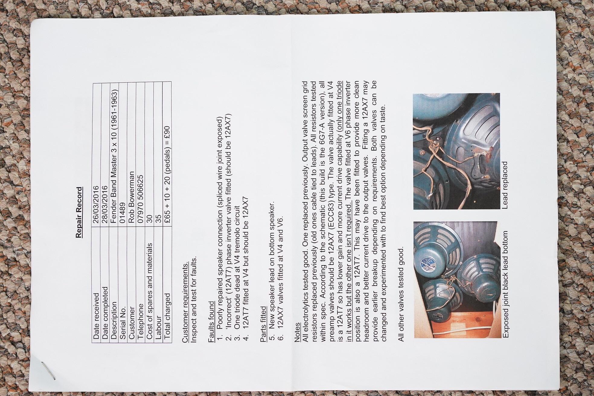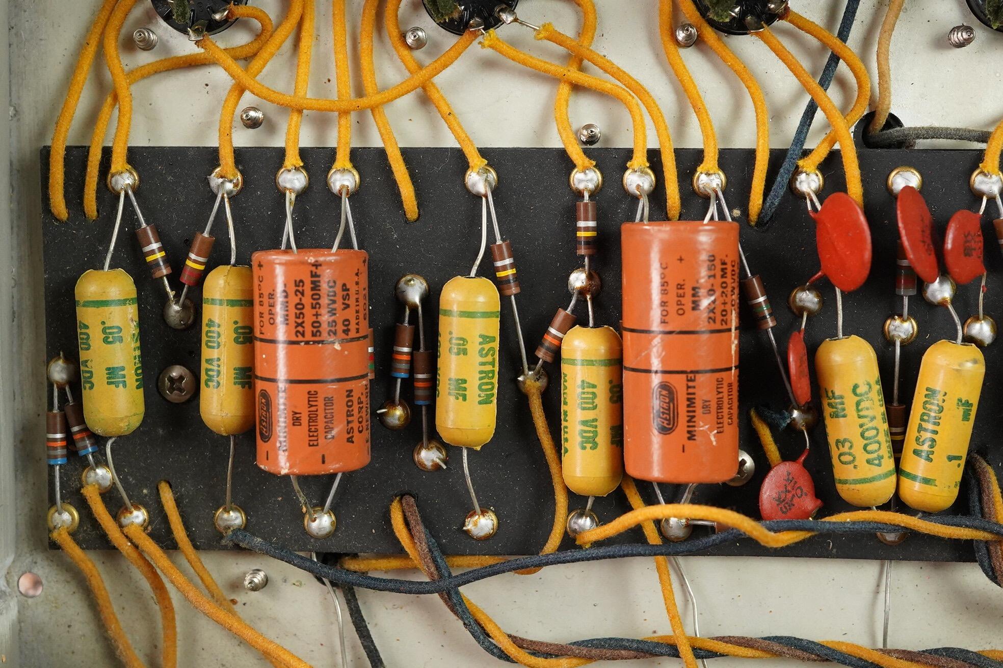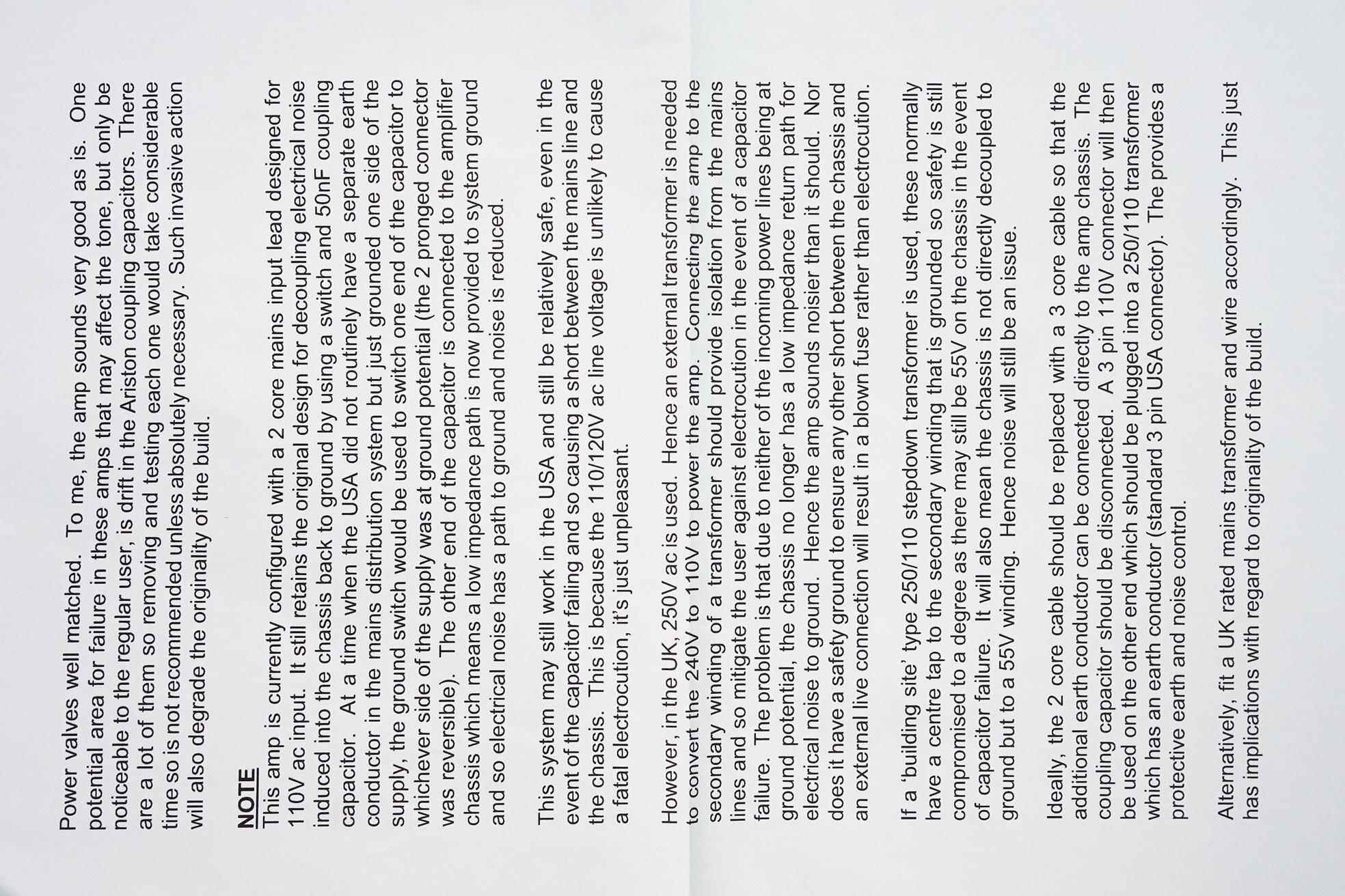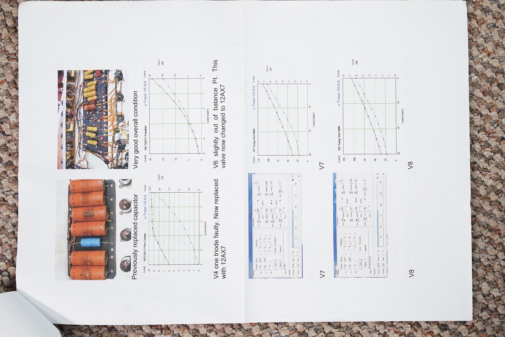 The amp has been inspected in 2016 with an extensive report written on its status and some minor repairs carried out. As you can see from this, it was recommended that a three prong plug be fitted. This hasn’t been done unfortunately but we would recommend this work be carried out. Elsewhere it seems that one filter cap has been changed but nothing else has been changed or modified.