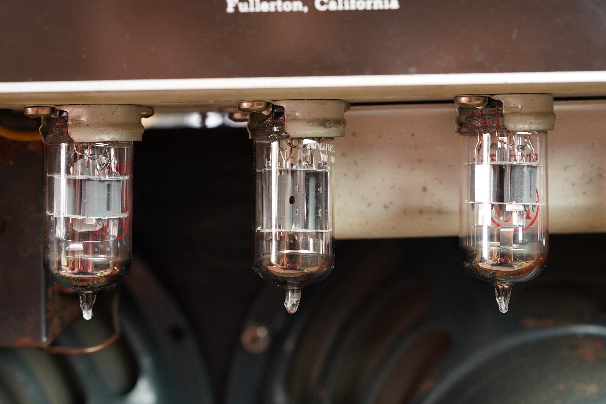 One of Fender’s more exotic amps, the Bandmaster was first introduced in 1953. By 1959, the 5E7 circuit was found in the Bandmaster, Super and Pro with slight changes and different speaker configurations. Many consider the Bandmaster a more manageable Bassman. The change to a new layout for 1960 signaled some internal design changes, increasing the output of the amp. Arguably rarer than the tweed examples, the brown panel amp included the revered tremolo circuit.