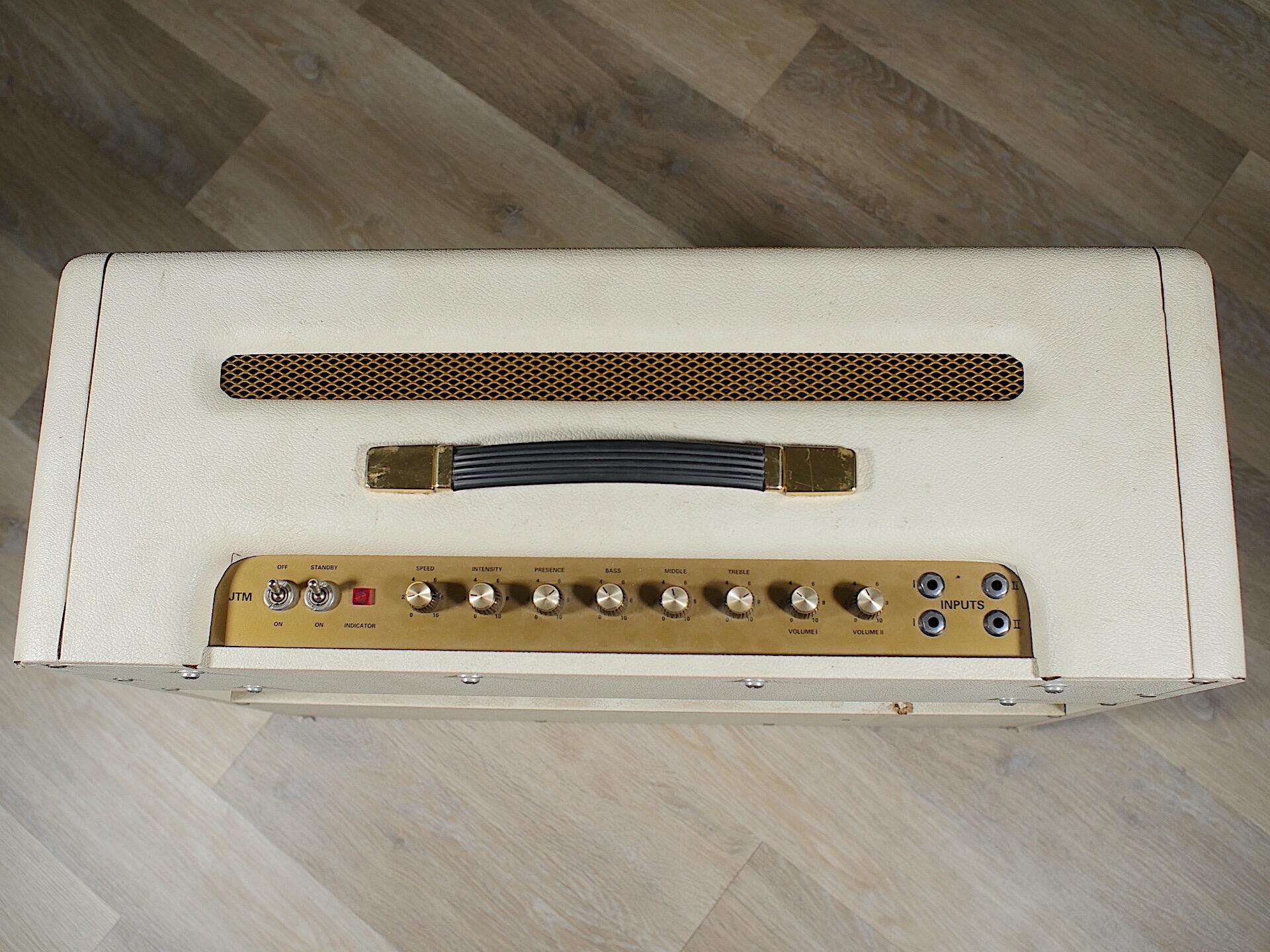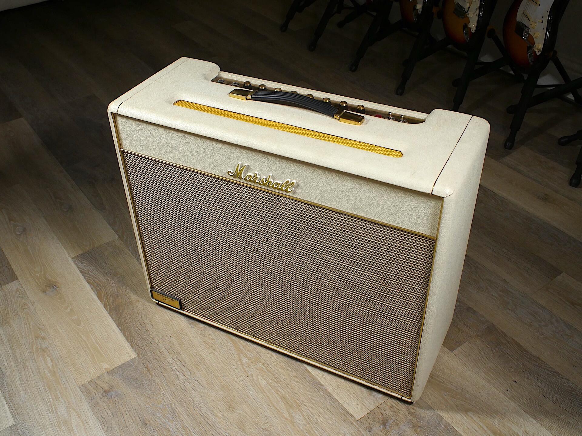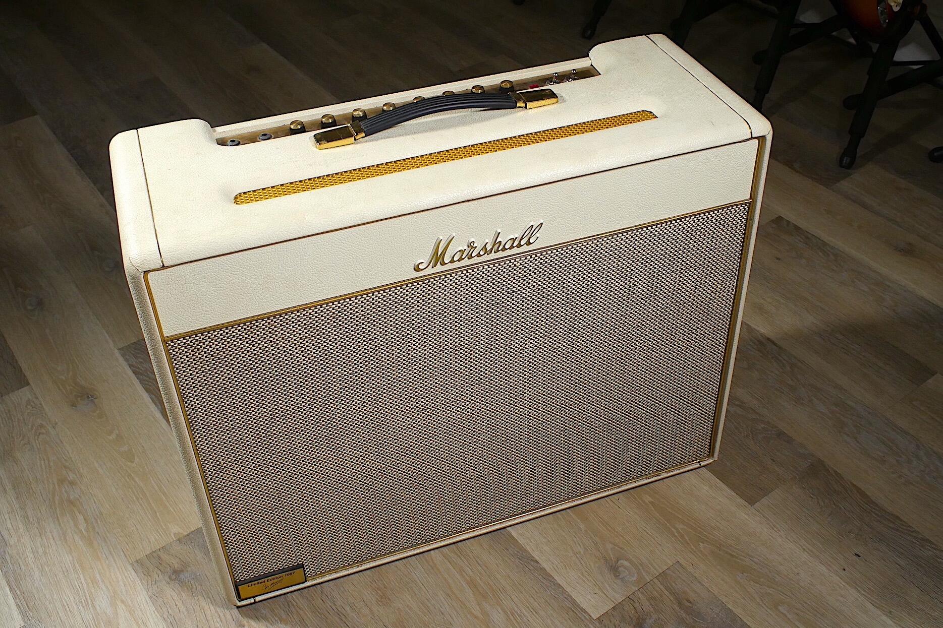 For the 35th Anniversary of the amp, 250 were produced in white Tolex, one of which you see before you. This particular example has had two previous owners. Originally supplied by Marshall to the Bryan Adams Band for a tour in 1997 where all the backline needed to be white, it was returned to Marshall to be bought by Dennis Greaves of Nine Below Zero who is its current owner. He used the amp sparingly as he didn’t want to damage the amp too much although it was used on a Jools Holland session.
