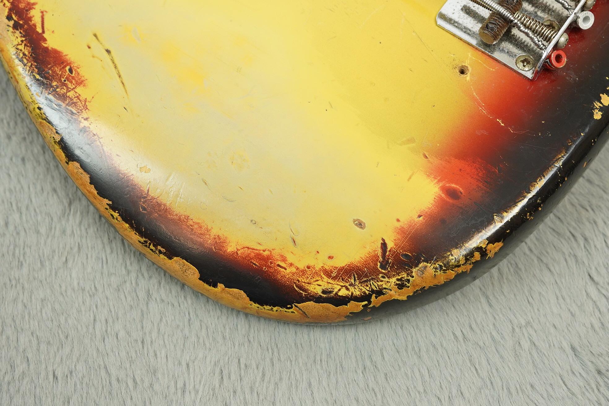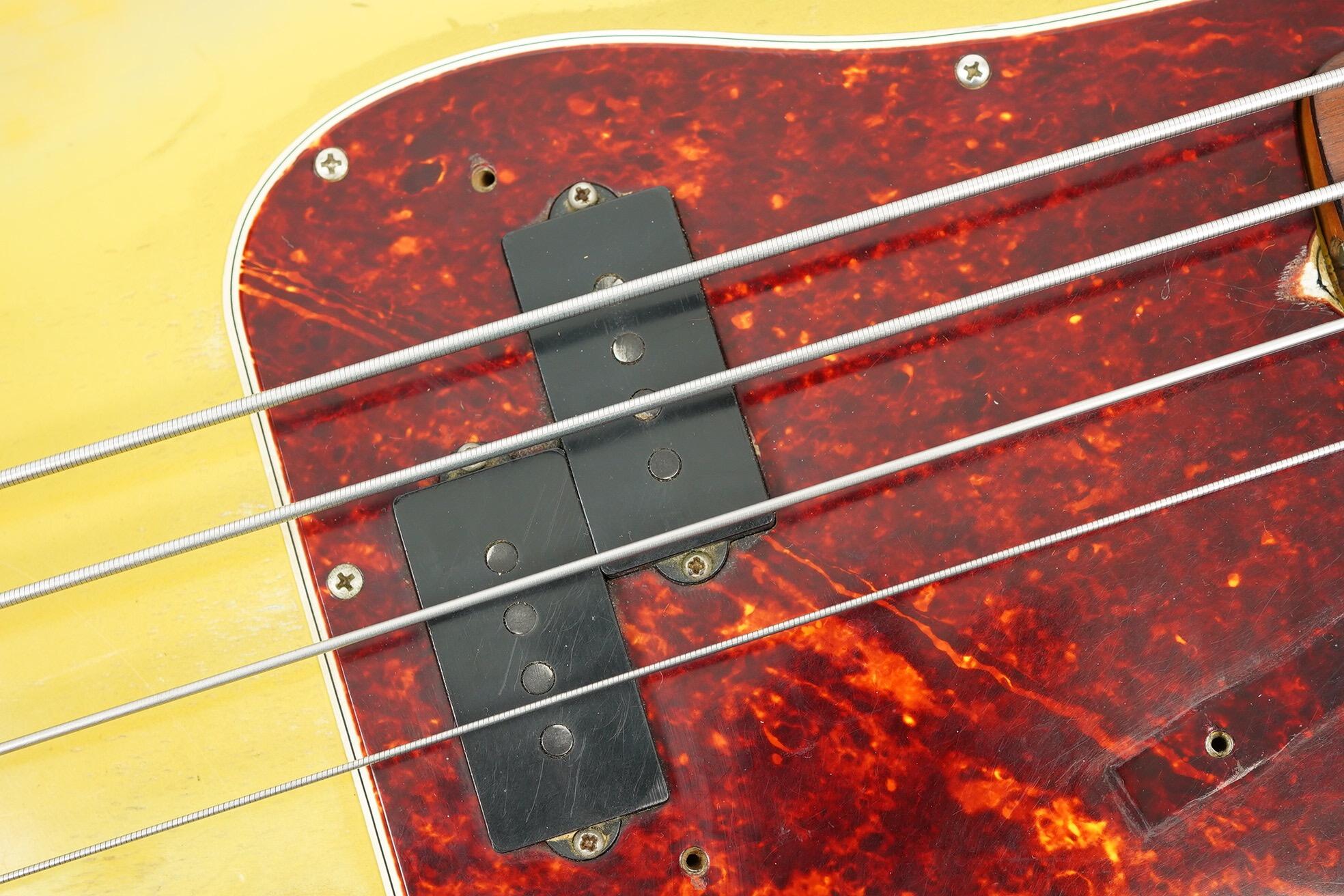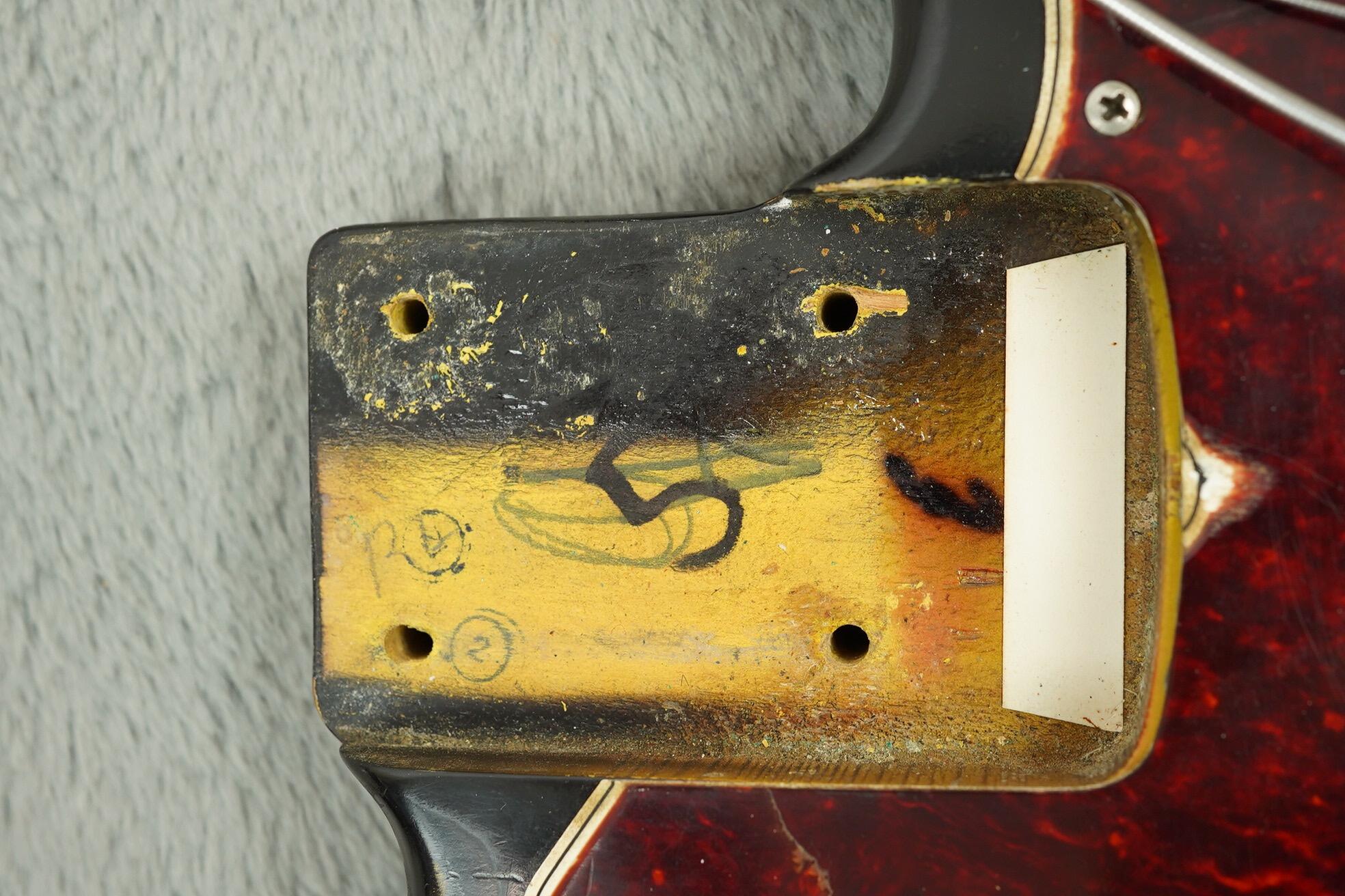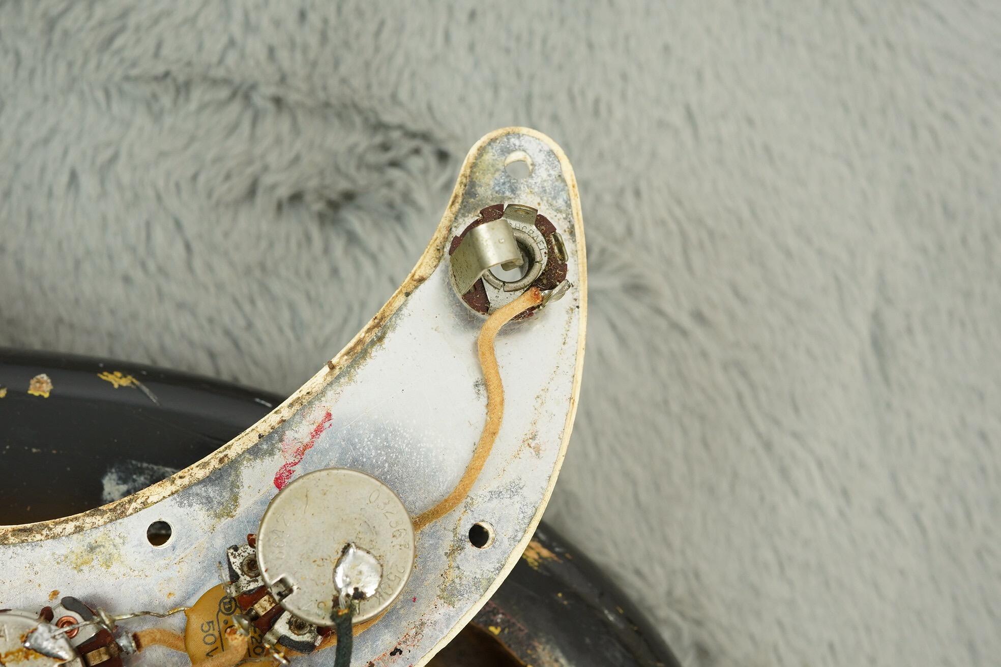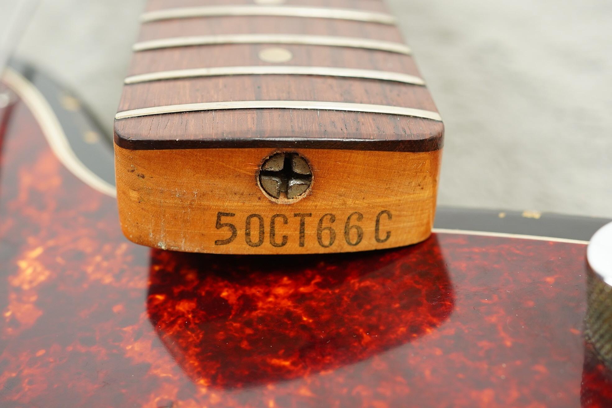 The Nitro finish neck has been played to a silky smooth finish—one of those necks you immediately feel at home on. It plays great with the original frets retaining plenty of life. Neck is date stamped OCT 66 with the CTS pot codes lining up nicely to the 42nd week of '66. It features the transition Fender logo, pearl dot inlays and awesome looking worn 'target burst' finish. The pickguard is original and intact as is the rest of the hardware down to the strap buttons and shielding plate.