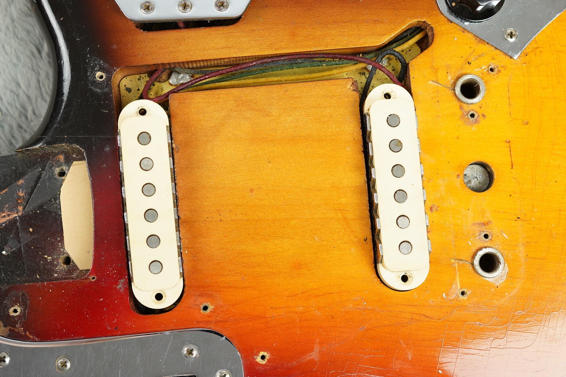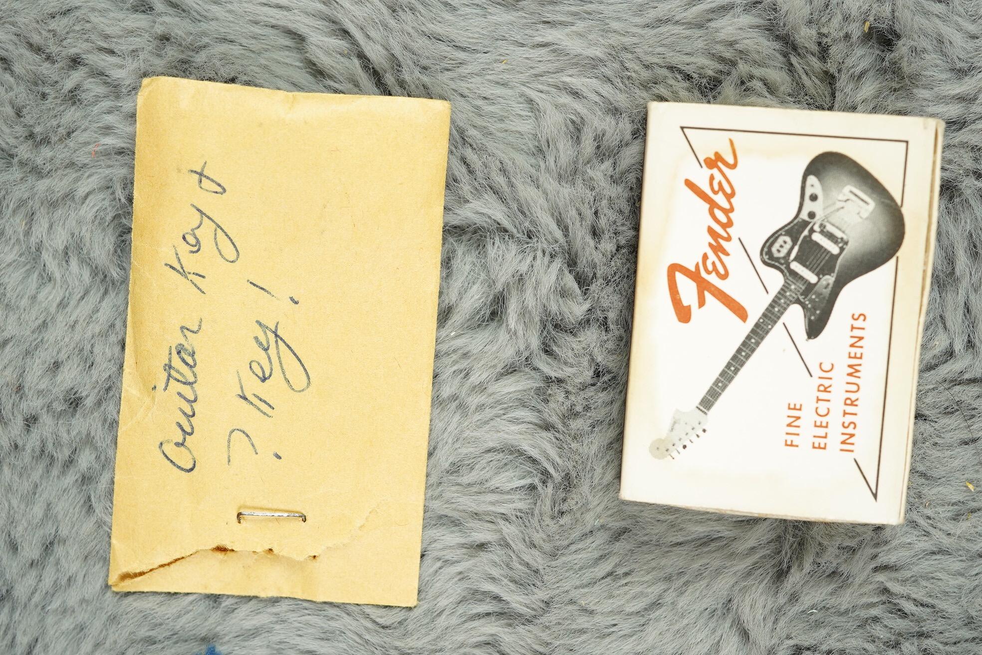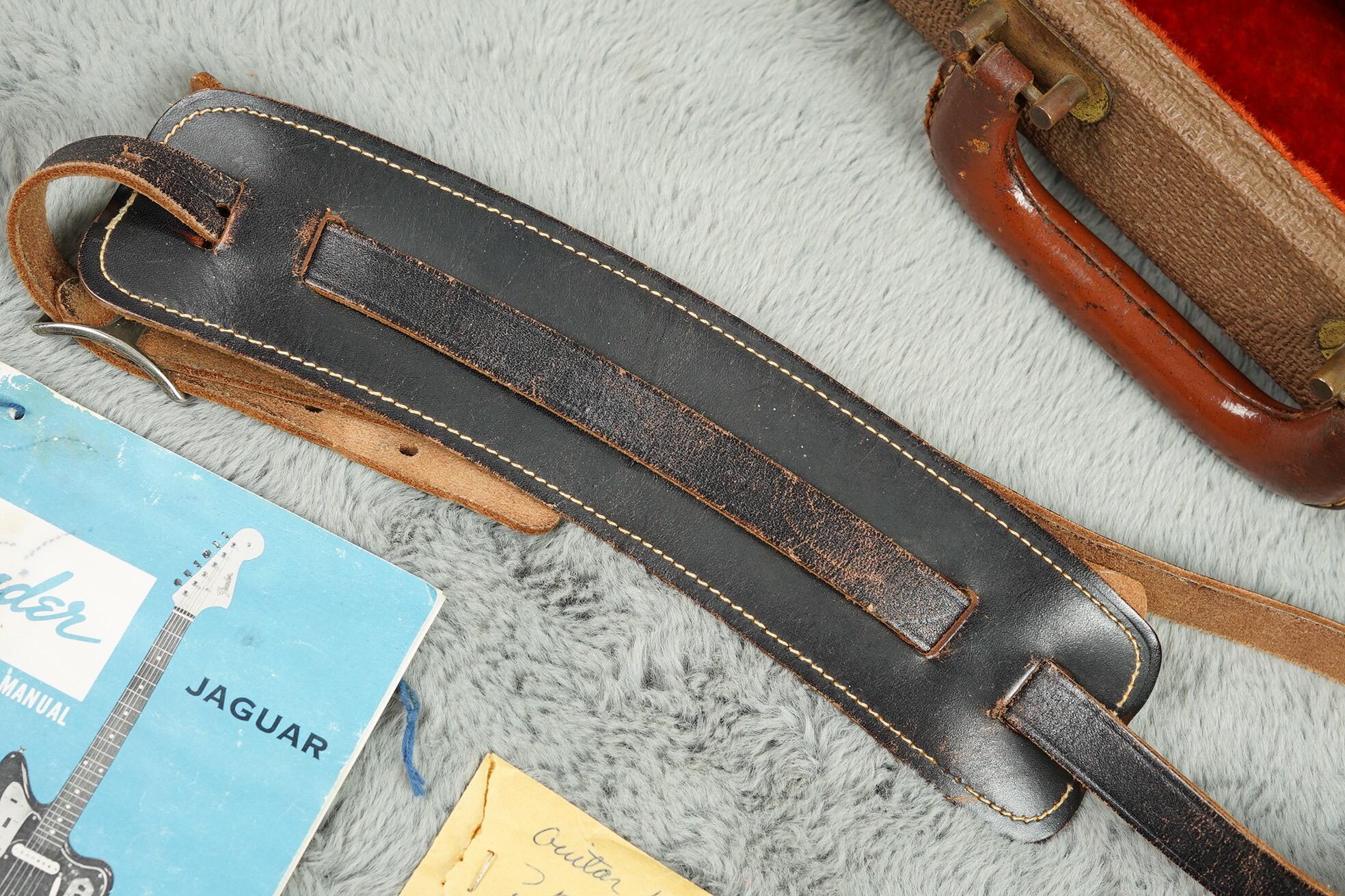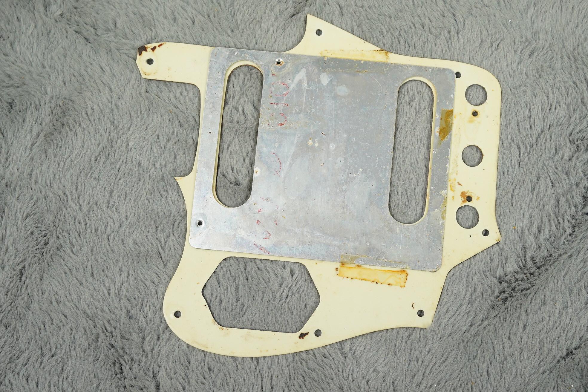 The original tortoiseshell pickguard hasn't shrunk very much and is in fantastic condition. Noteworthy is the fewer number of screws holding the pickguard, a feature of very early Jaguars as is the slot head pickup adjusting screws.