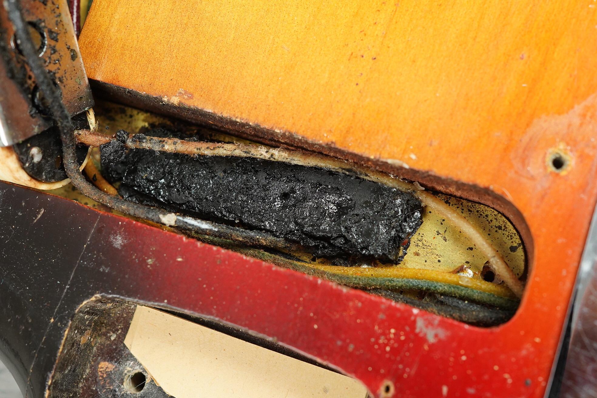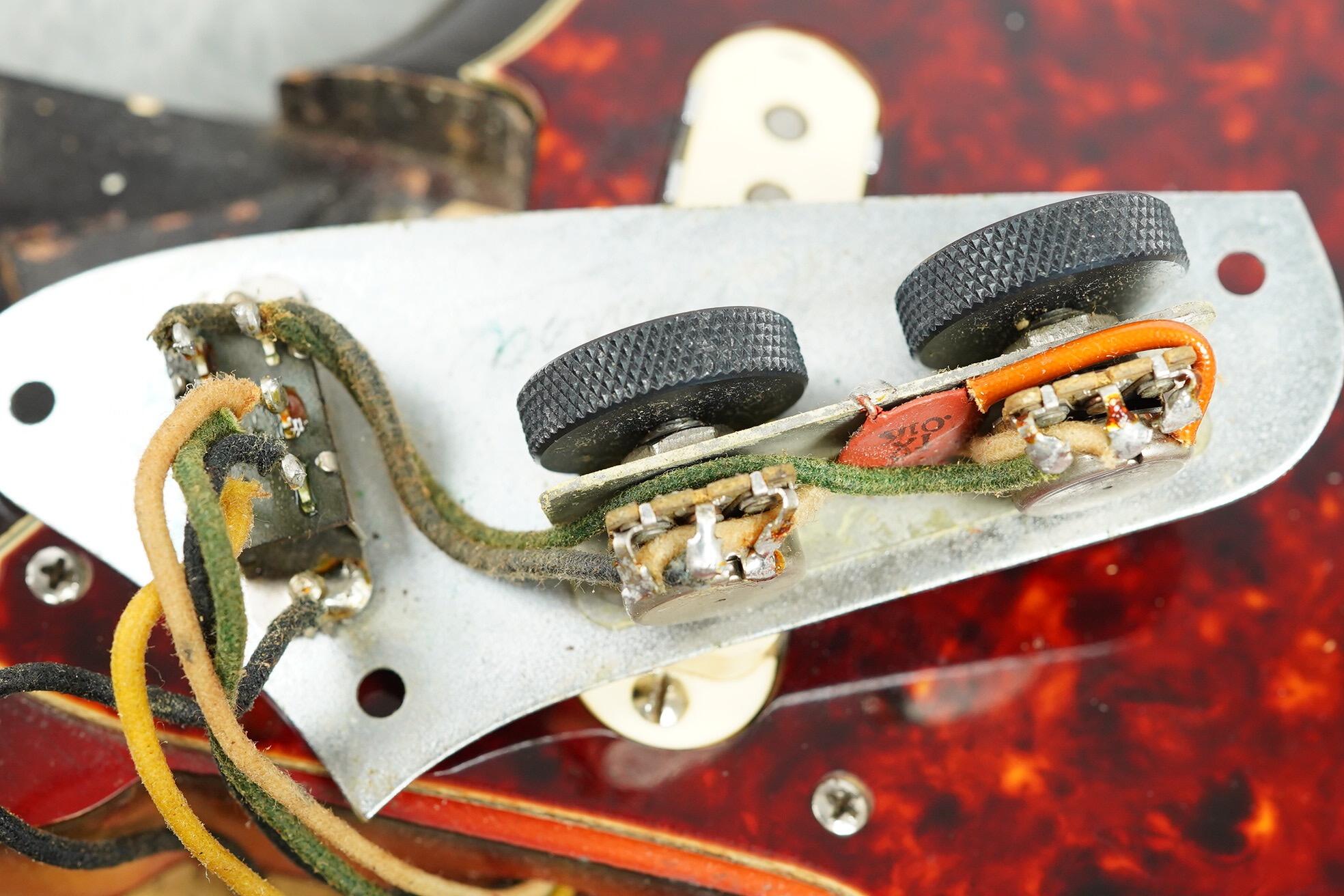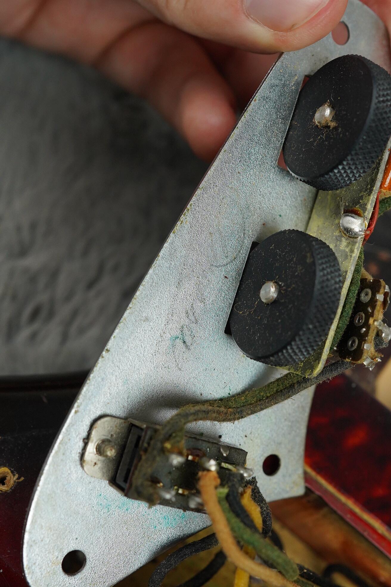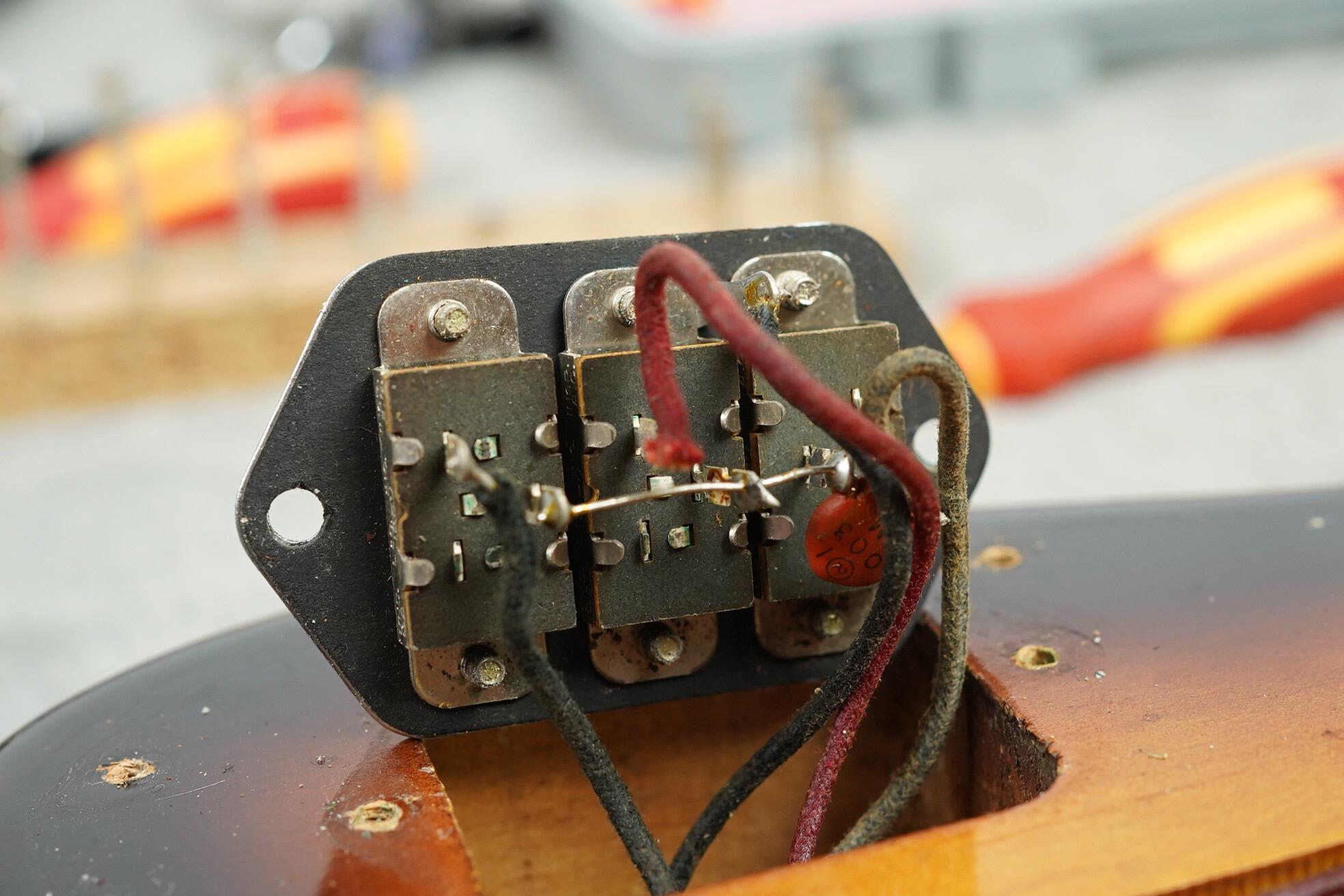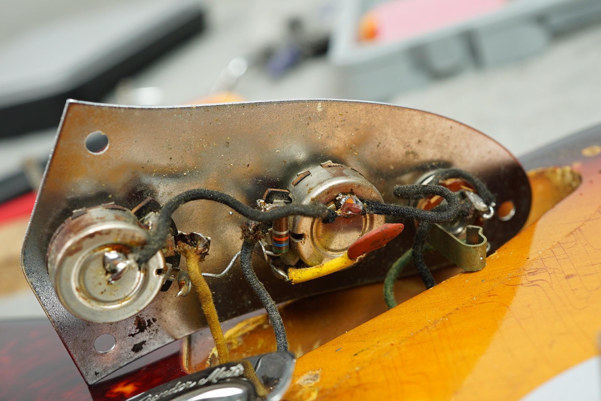Electronically everything is correct. There is one solder joint that had to be remade as the wire to the volume pot had broken when we opened the control cavity. The black ground wire over the pots also looks like it has been reheated and possibly extended. The pots read week 32 of 1962. Other solder joints haven’t been disturbed.