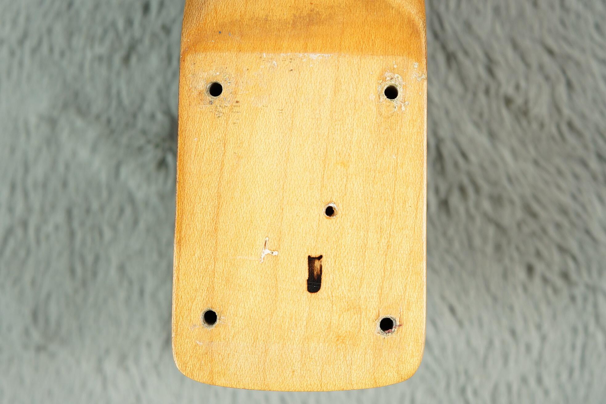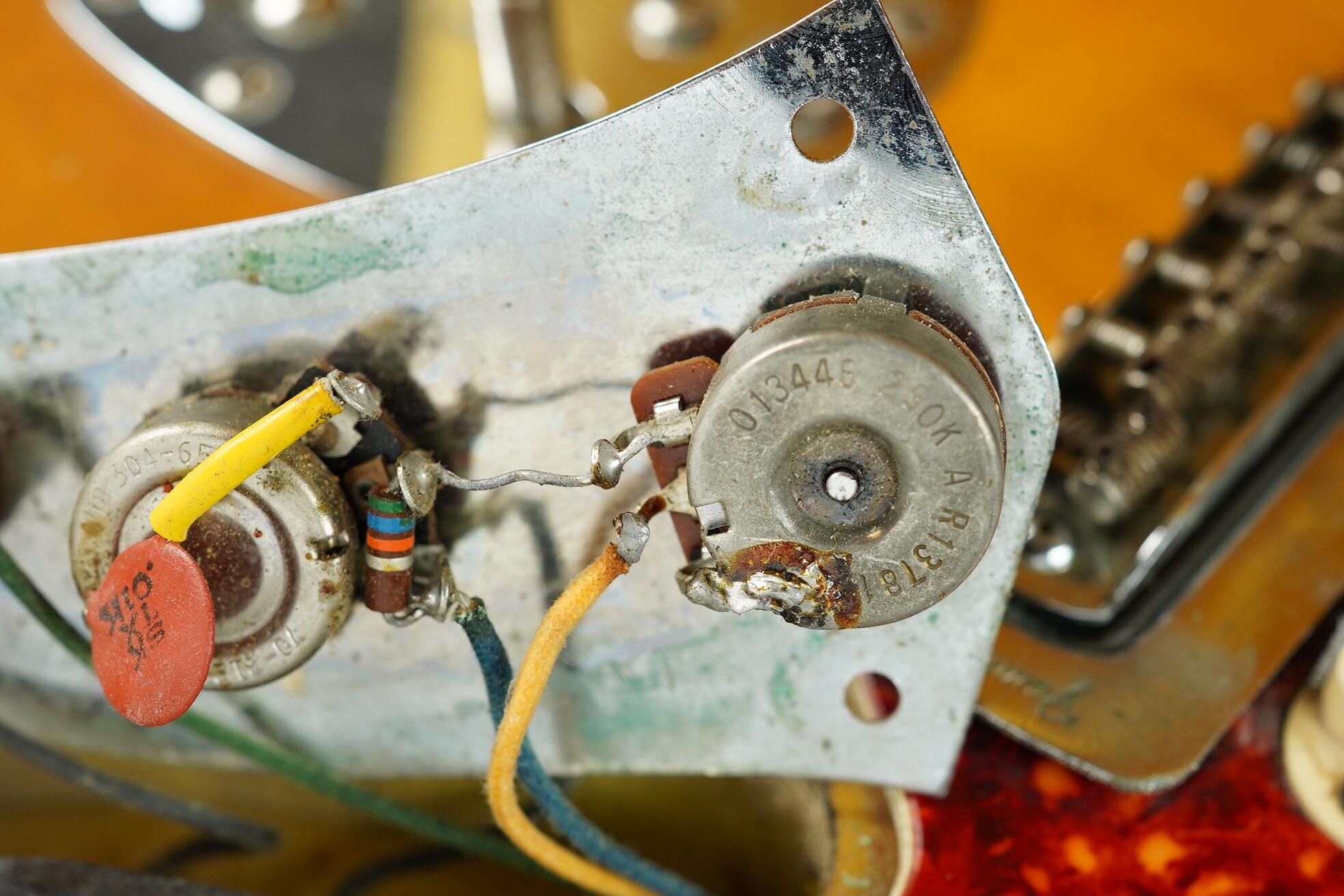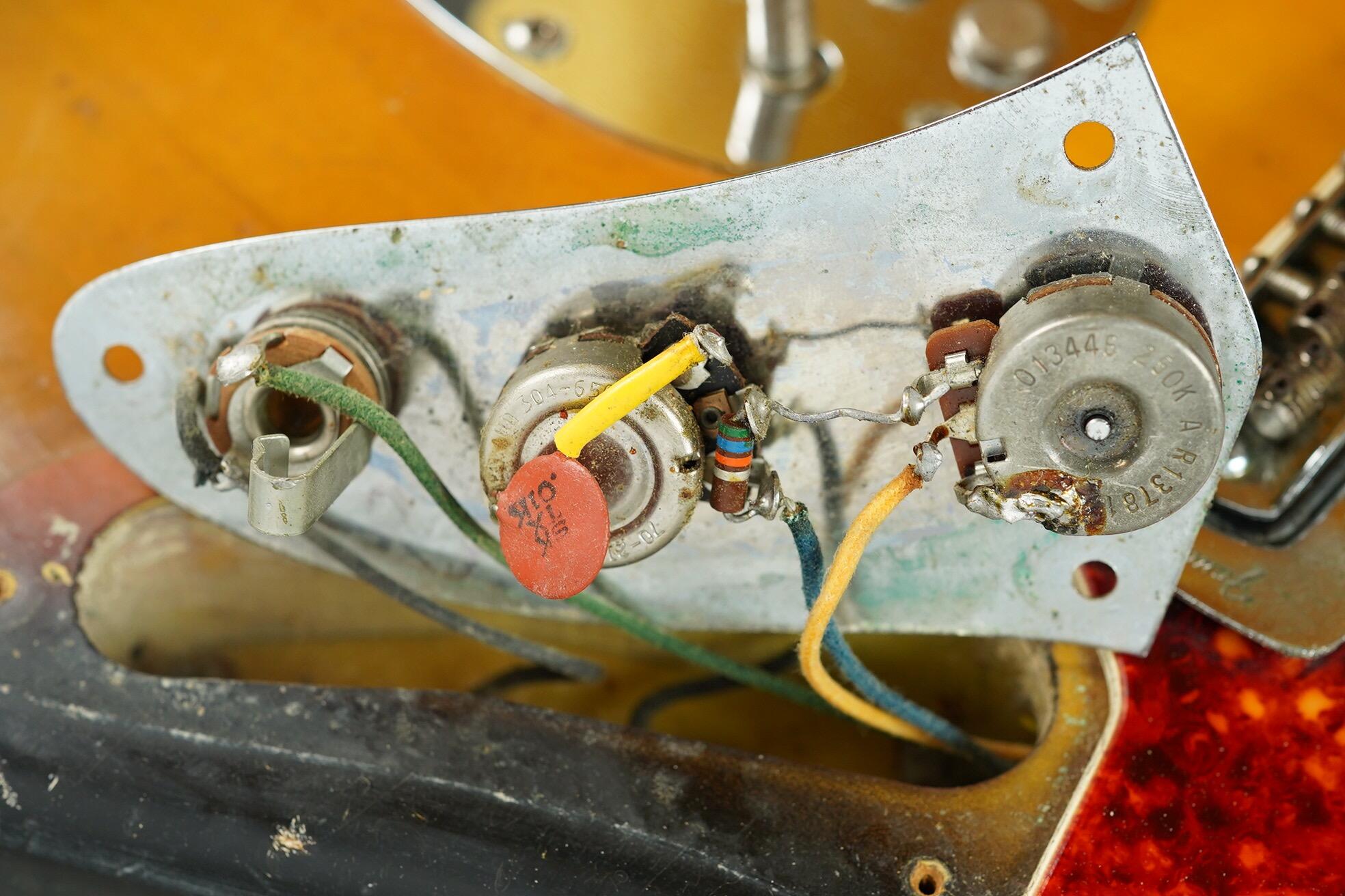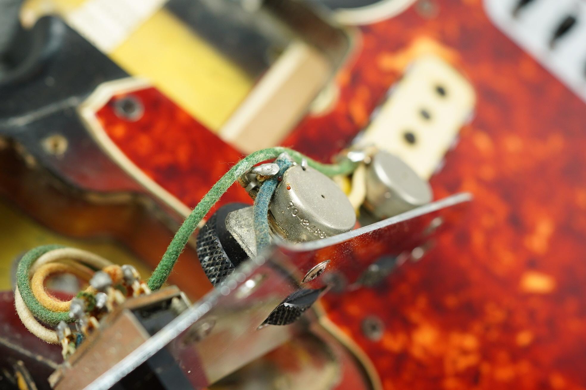 Hardware wise, it's missing the trem arm but retains the bridge cover. The mute is present without the foam, and all other chrome hardware is correct. The pickups are the correct staggered pole, single coils with cream covers and the knobs and switches are correct too. Under the hood we have one changed CTS volume pot from 1981 and an original Stackpole tone pot from '65. The coloured cloth wiring all looks good and the switches and circuitry functions as intended. As expected there are lots of sounds to play with, from thin twang to warm, mellow tones and the out of phase option is always fun for spikey rhythm playing or single notes that really cut through.