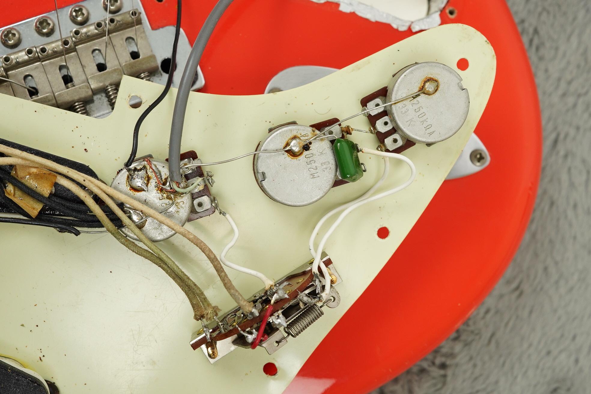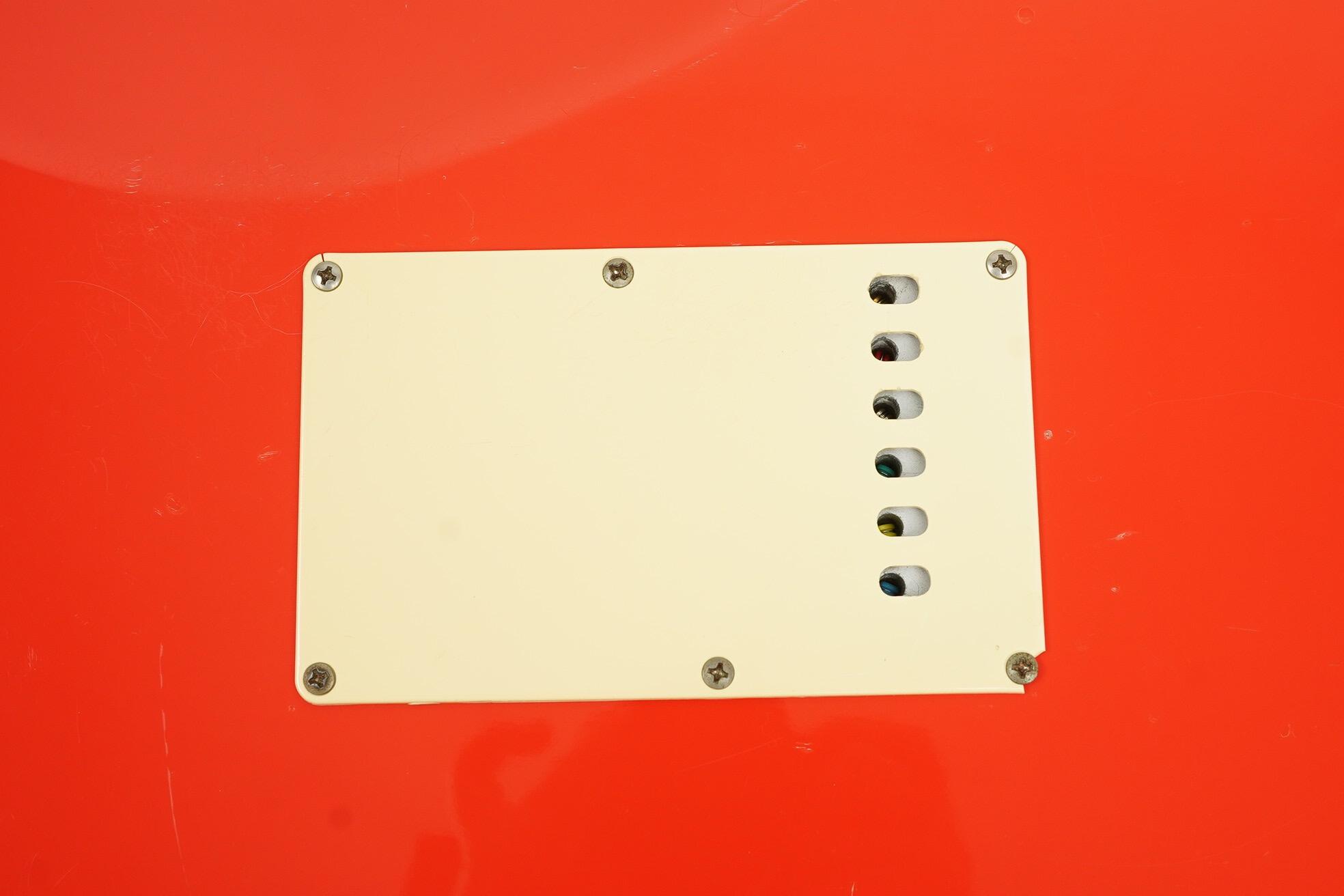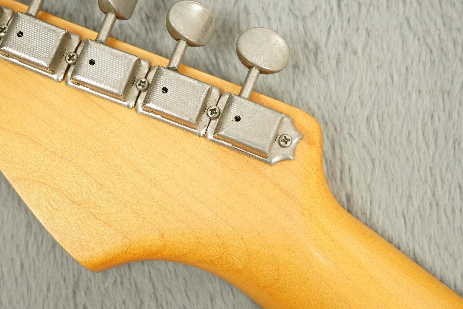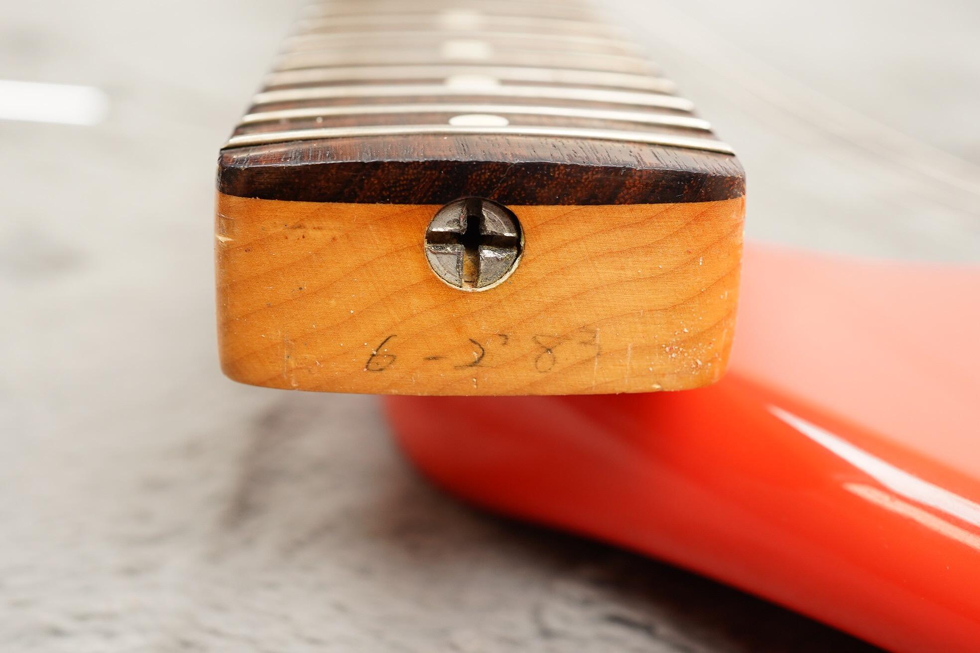 This one’s neck is pencil dated 6-5-83 and features a slab rosewood fingerboard with wide-spaced dot inlays at the 12th fret. The heastock bears a non-original spaghetti Fender decal with two Pat No's. It’s fitted with an 11-hole excellent quality mint green guard made by Fat Boy Foley (no longer made) and it has retained it's original set of staggered pole, USA-made pickups with green ink pen dots and markings as seen in this period. Included is the original term arm and a Hiscox case.