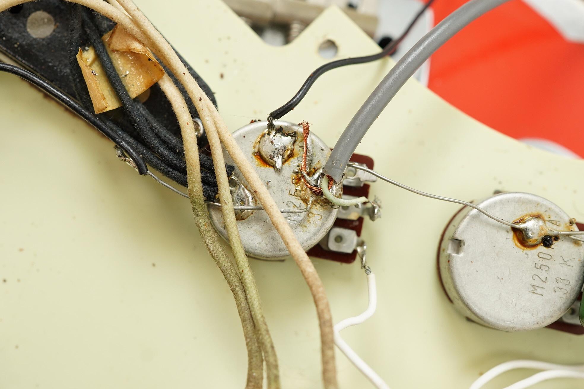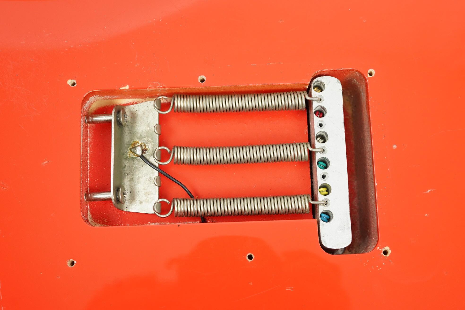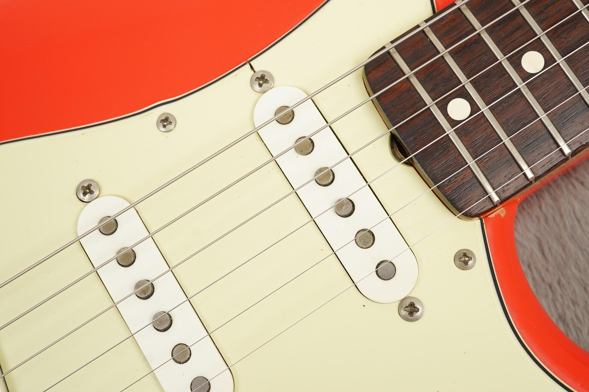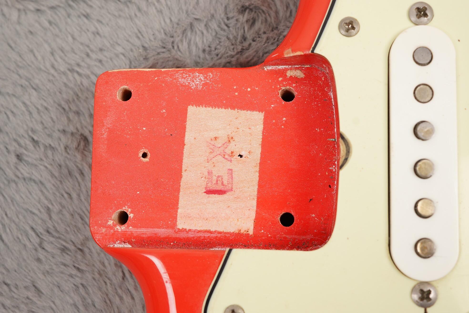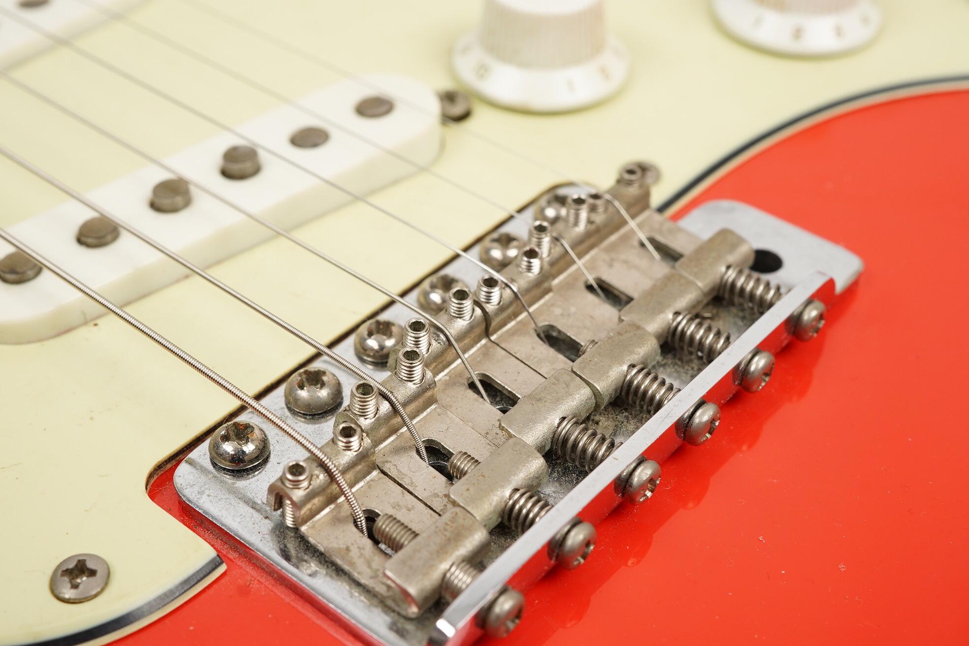 This one’s neck is pencil dated 6-5-83 and features a slab rosewood fingerboard with wide-spaced dot inlays at the 12th fret. The heastock bears a non-original spaghetti Fender decal with two Pat No's. It’s fitted with an 11-hole excellent quality mint green guard made by Fat Boy Foley (no longer made) and it has retained it's original set of staggered pole, USA-made pickups with green ink pen dots and markings as seen in this period. Included is the original term arm and a Hiscox case.
