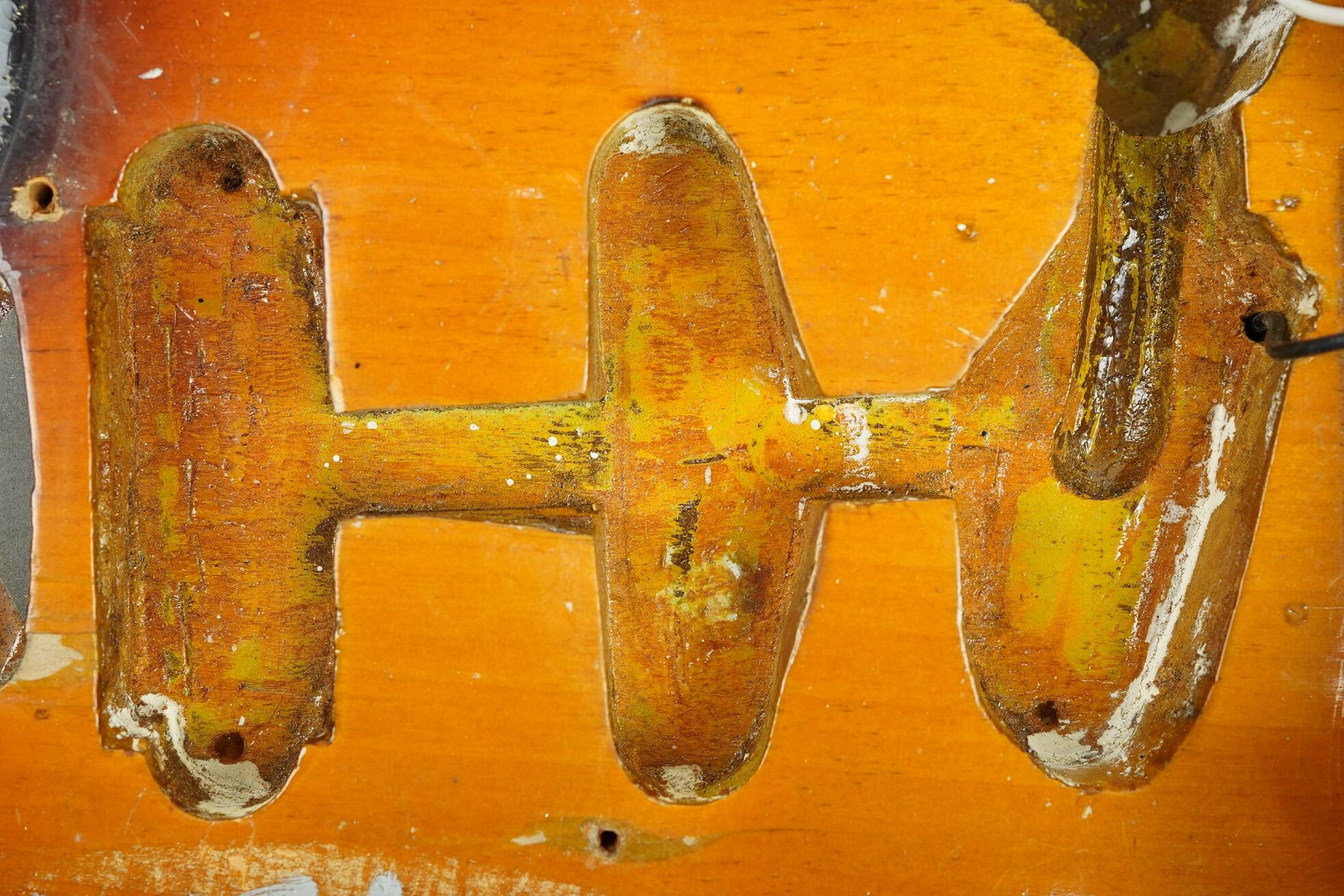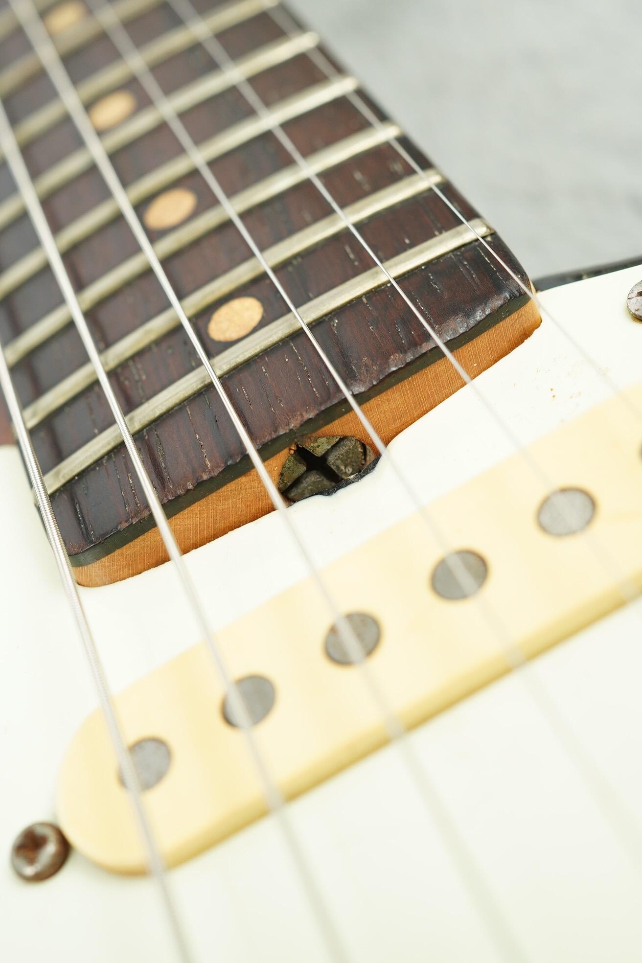 The guitar has certainly seen some life. The body has been refinished and has both Kevin Armstrong and David Bowie’s signatures in silver pen across the top. Under the pickguard there has been a route for a mini humbucker in the neck position. There is evidence of some nail holes but none of the previous finish. As you'd expect for a guitar such as this, there are a substantial amount of dings and knocks.