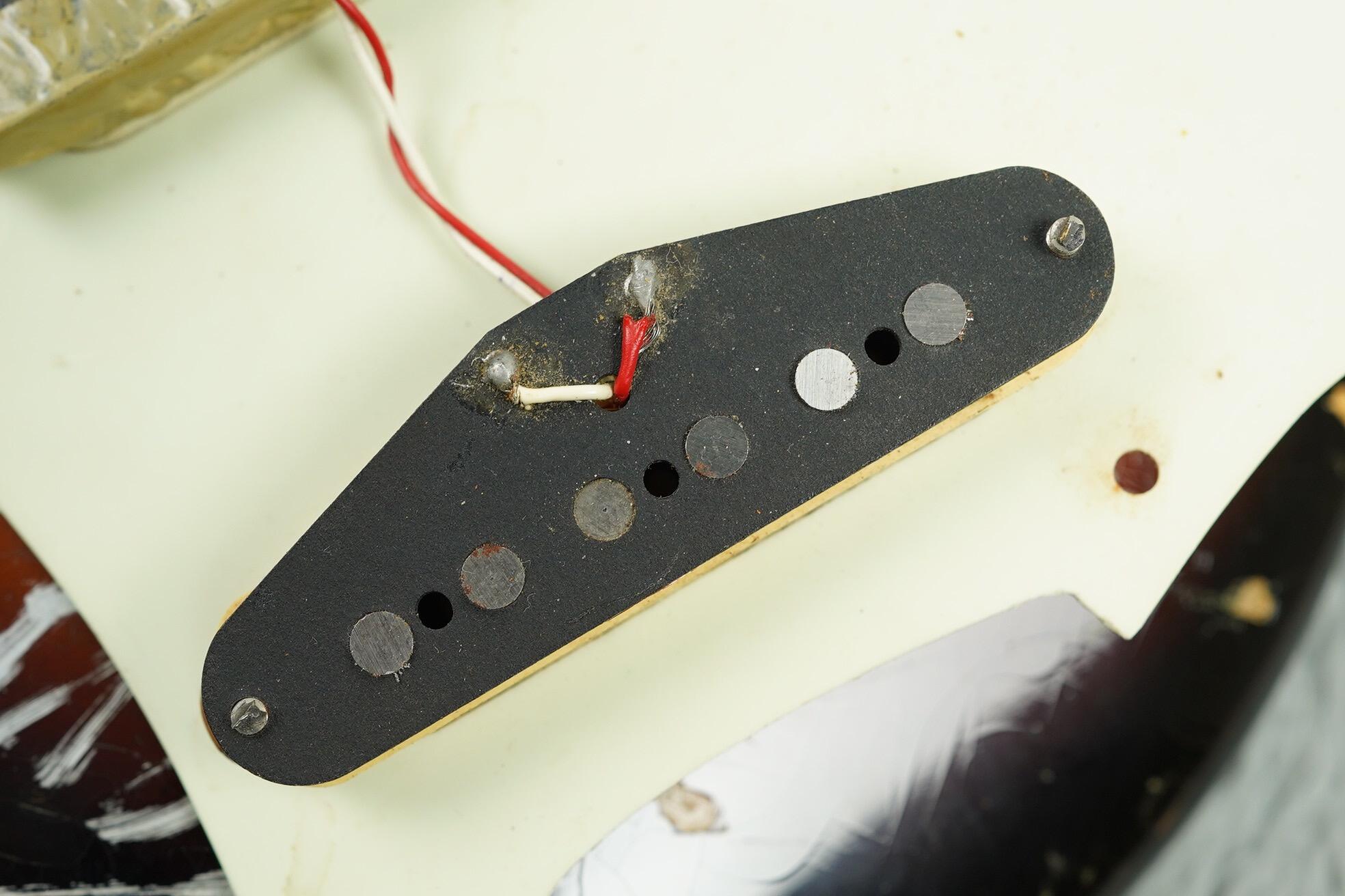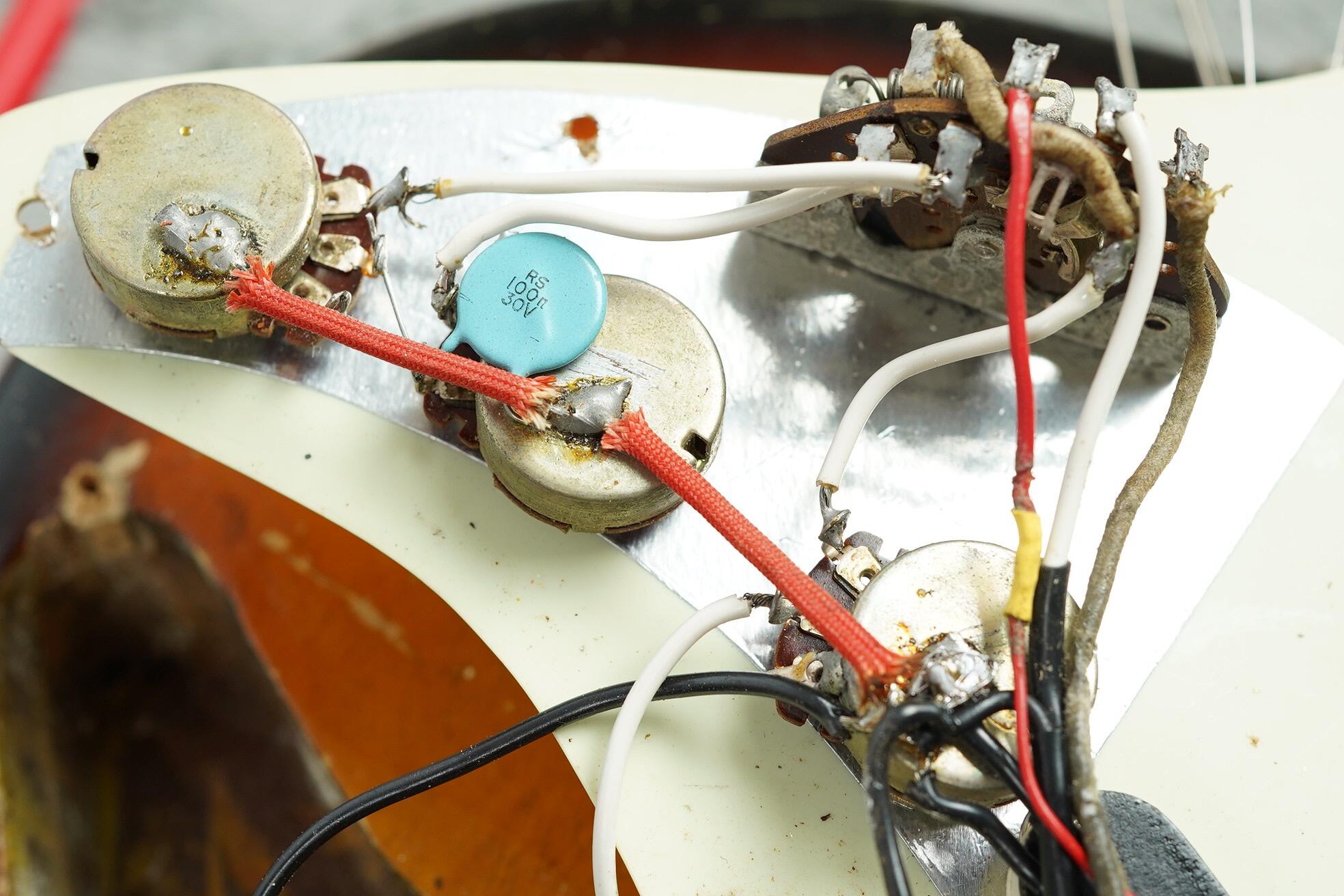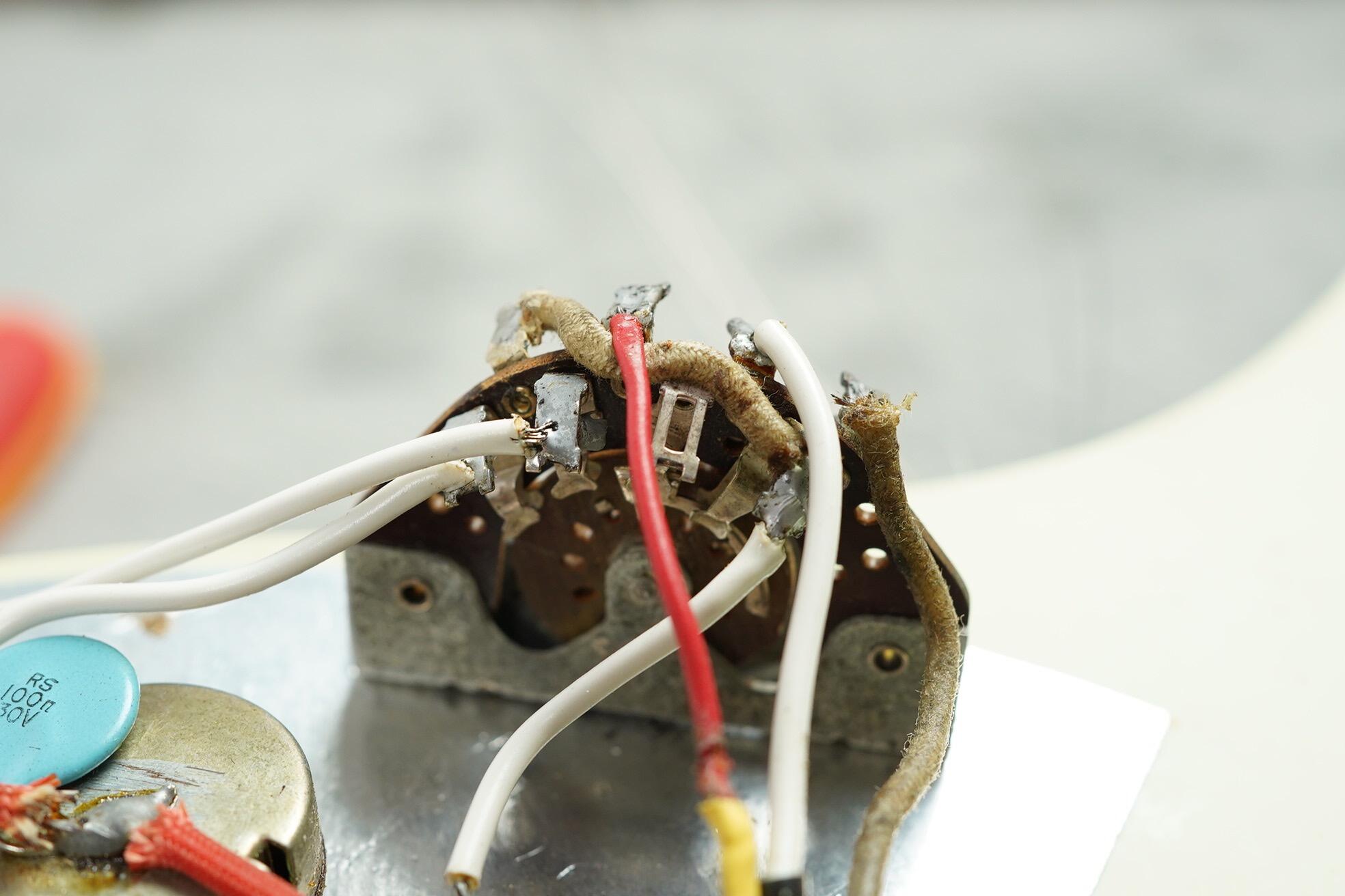 Electronically two of the pickups are correct and don’t look to have been rewound. The neck pickup is a later example and all the pots and switch have been changed.