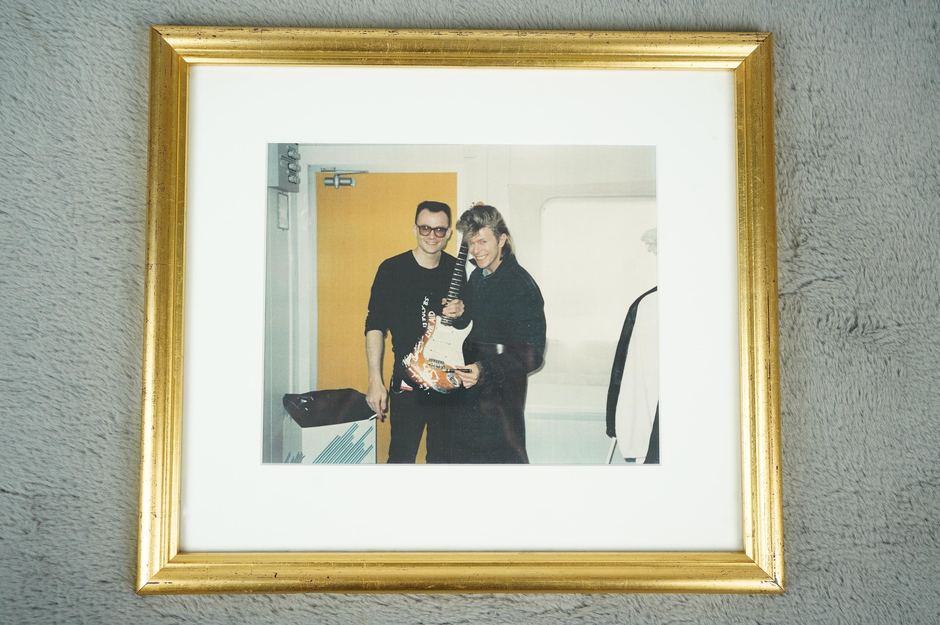 This guitar was owned by Kevin Armstrong who purchased the guitar in 1984 and used it on Iggy Pop’s Bla Blah Blah album and on David Bowie’s Absolute Beginners album along with the Dancing in the Street single with Mick Jagger. He also used the guitar for David Bowie’s performance at Live Aid in 1985. Kevin asked David to sign the guitar a few years later as he was trying to raise funds to replace a 65 strat that had been stolen in LAX. The picture you see is of them both backstage in Gothenburg on the Glass Spiders tour where Iggy Pop was supporting David Bowie.