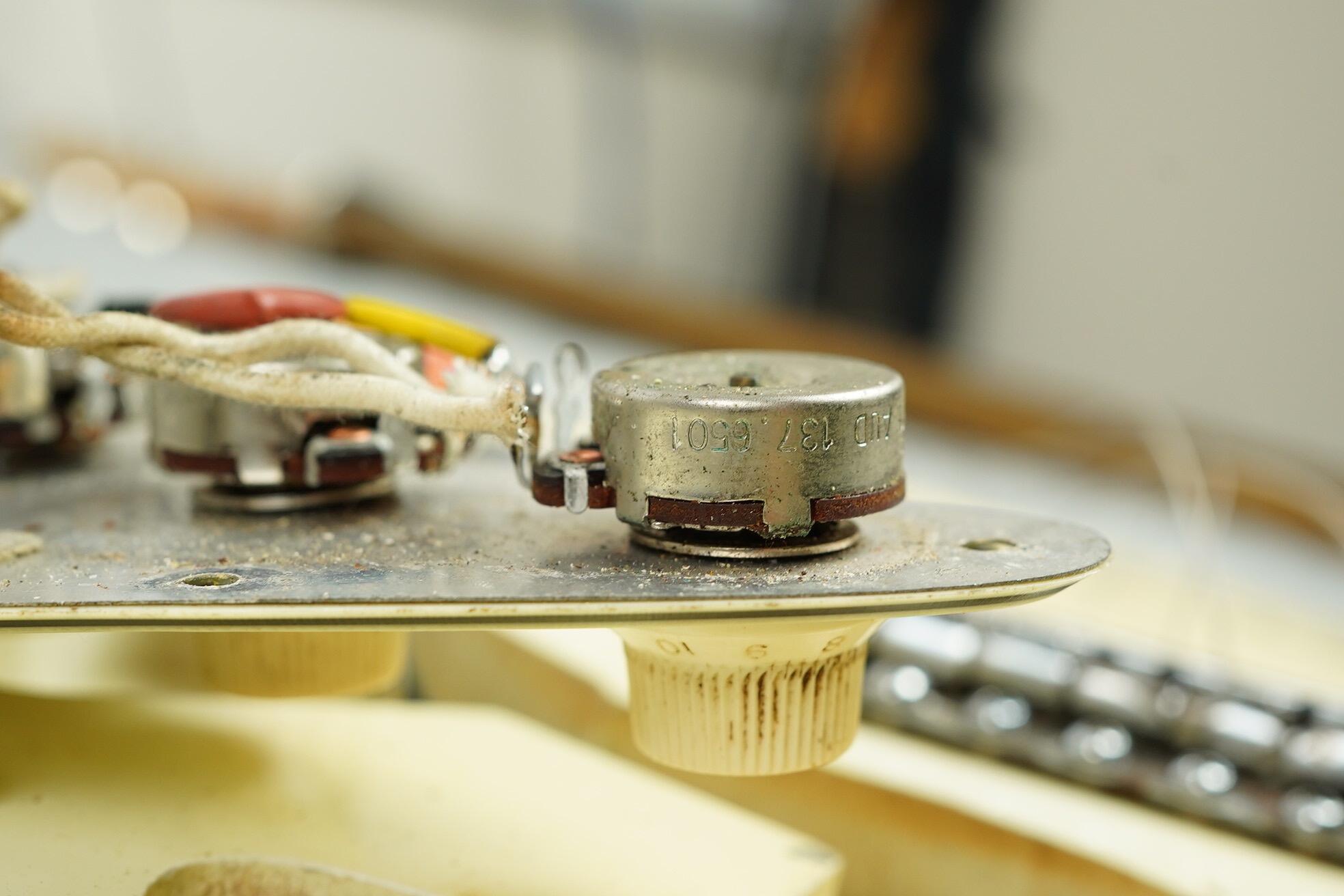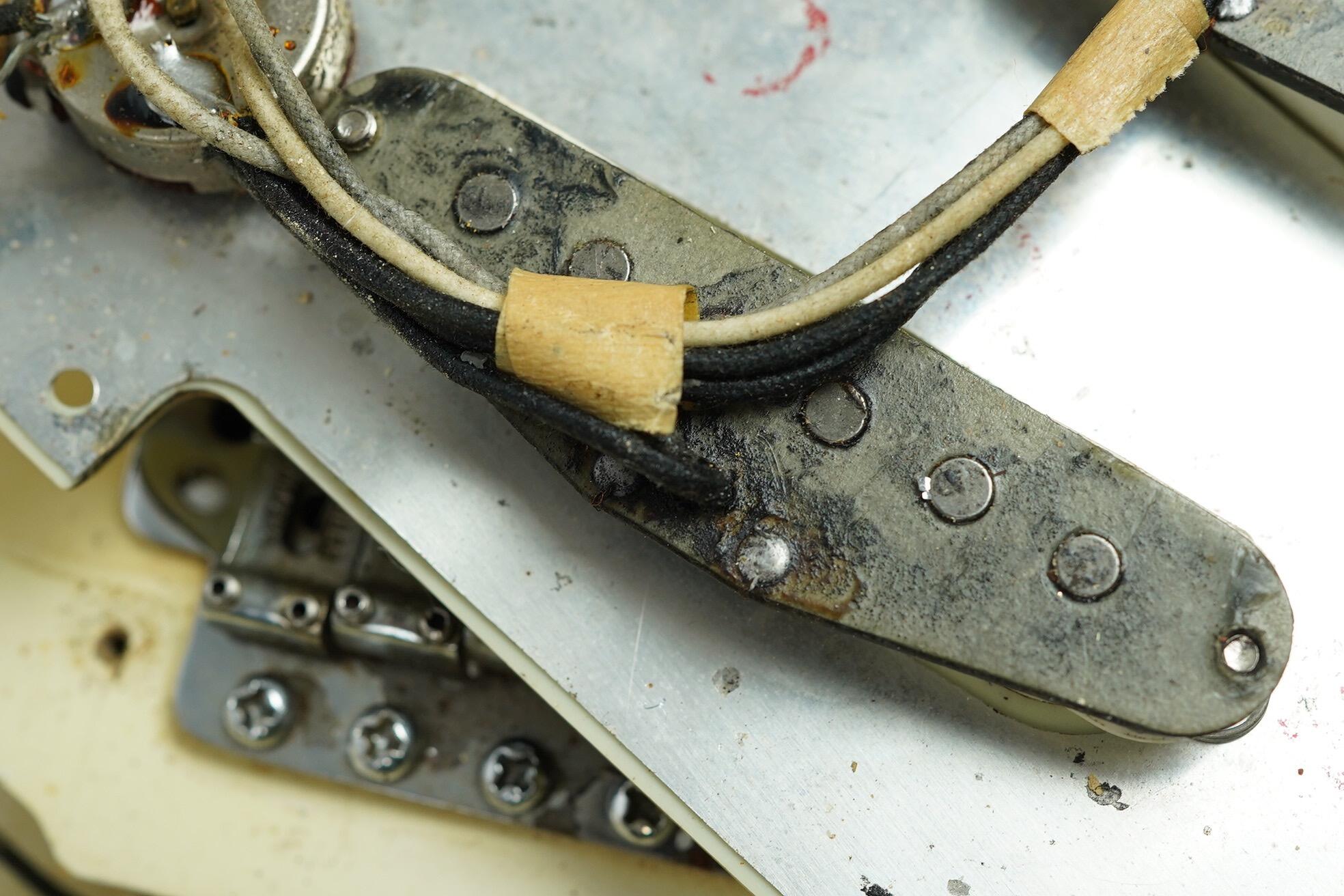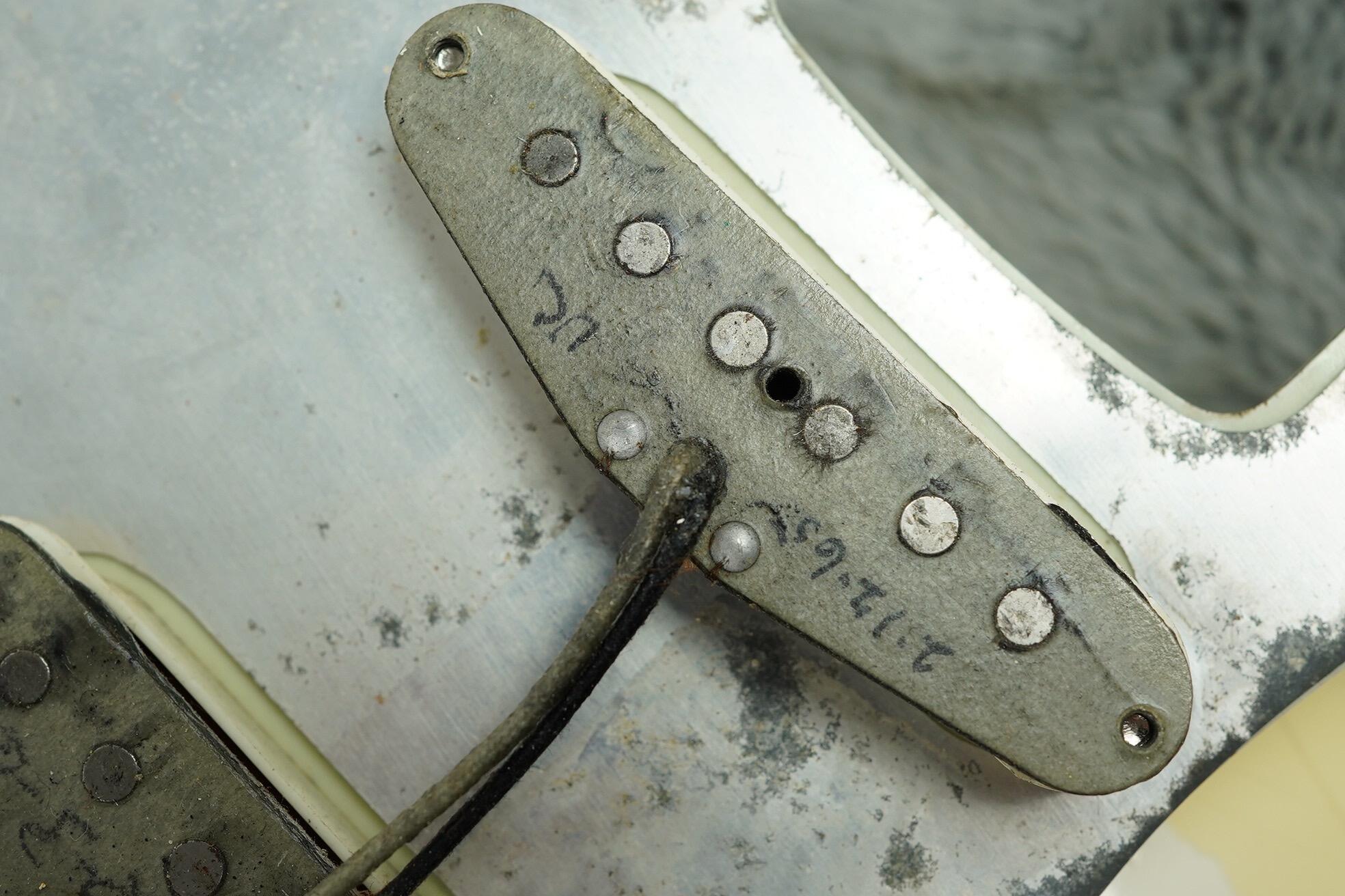 The correct grey bottom pickups (February 12th 1965) are present as are the correct pots which are dated week 1 1965. None of the solder looks to have been disturbed.