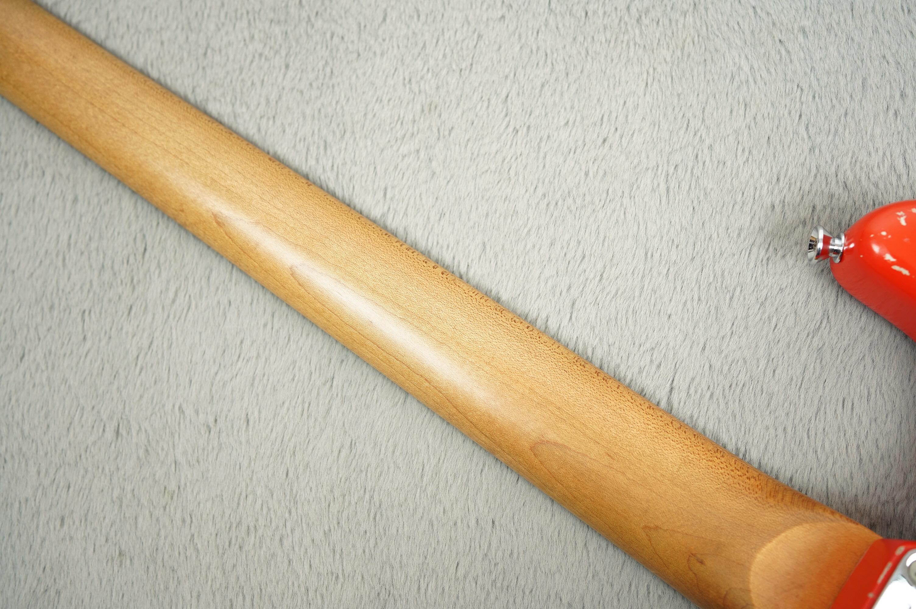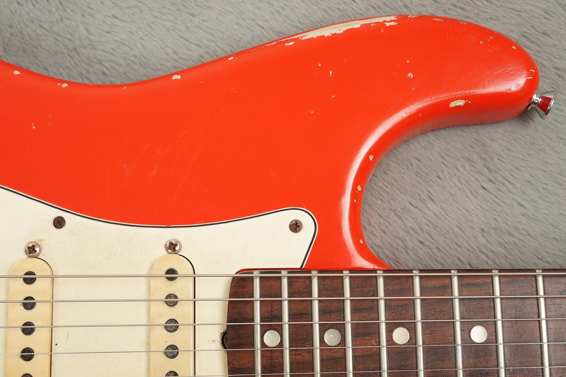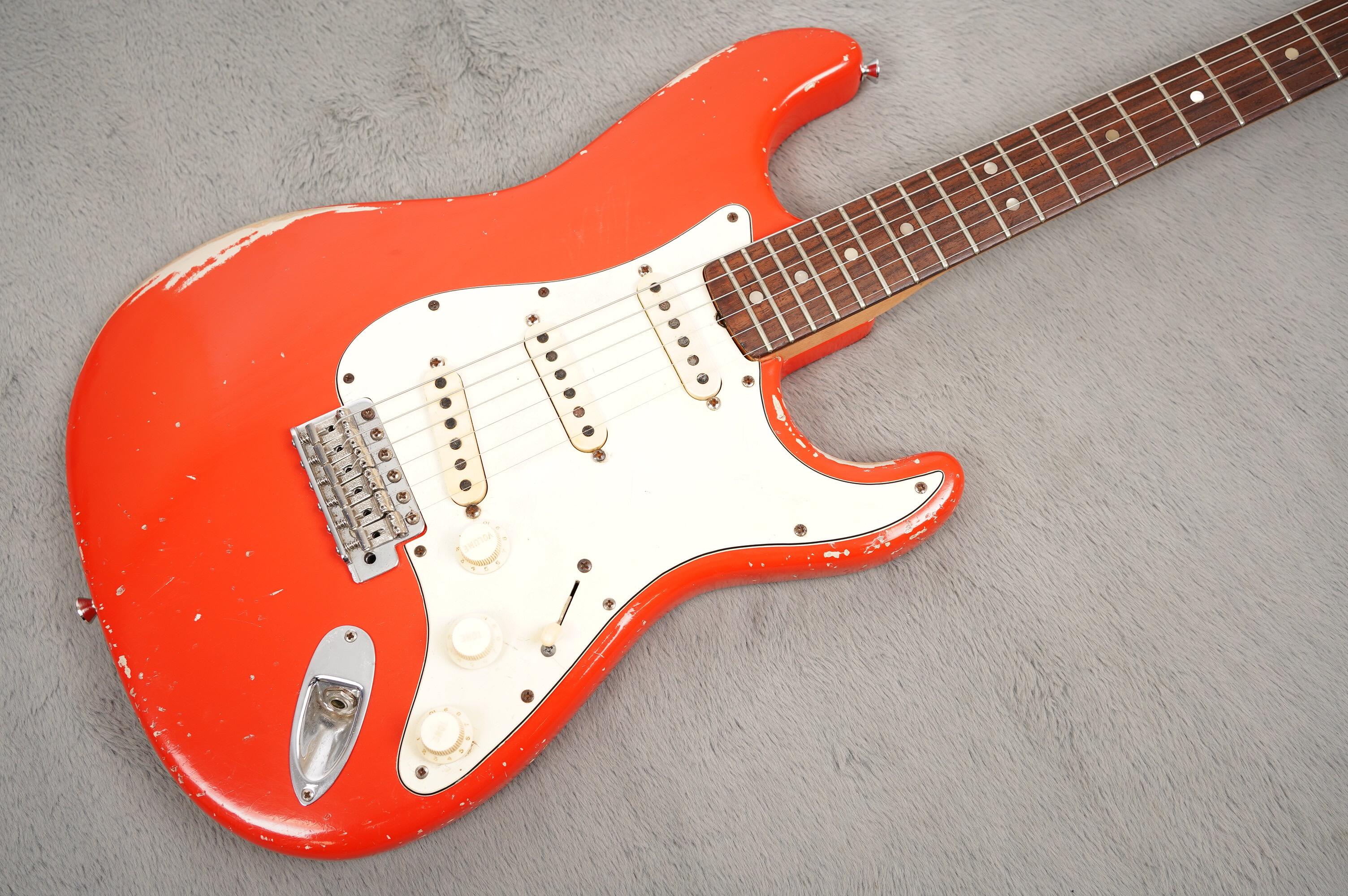 A very cool player-grade, late transition logo 1968 Fender Stratocaster, refinished in red. A great looking guitar with lots of character despite the colour not strictly being a Fender shade of red. However it’s been applied nicely over a light undercoat and overall we think it looks great, albeit not vintage correct.