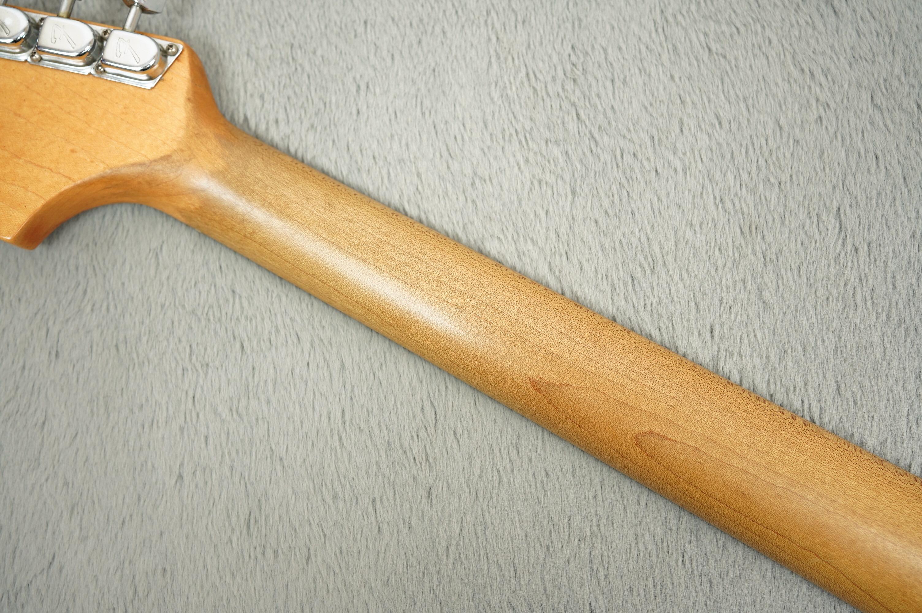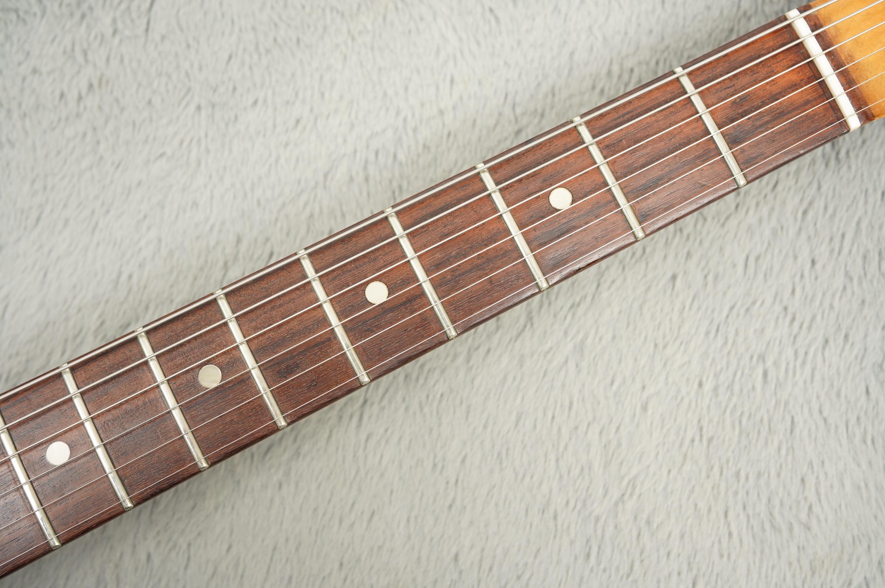 This Strat features the larger 'transition' headstock logo, original F-stamped tuners (with holes from previous tuners still visible), and a rosewood fingerboard with pearl dot inlays. The neck has been stripped and now has that smooth, played-in feel that's smooth and comfortably in the hand. It’s been refretted and has a replaced nut and it plays well across the board.