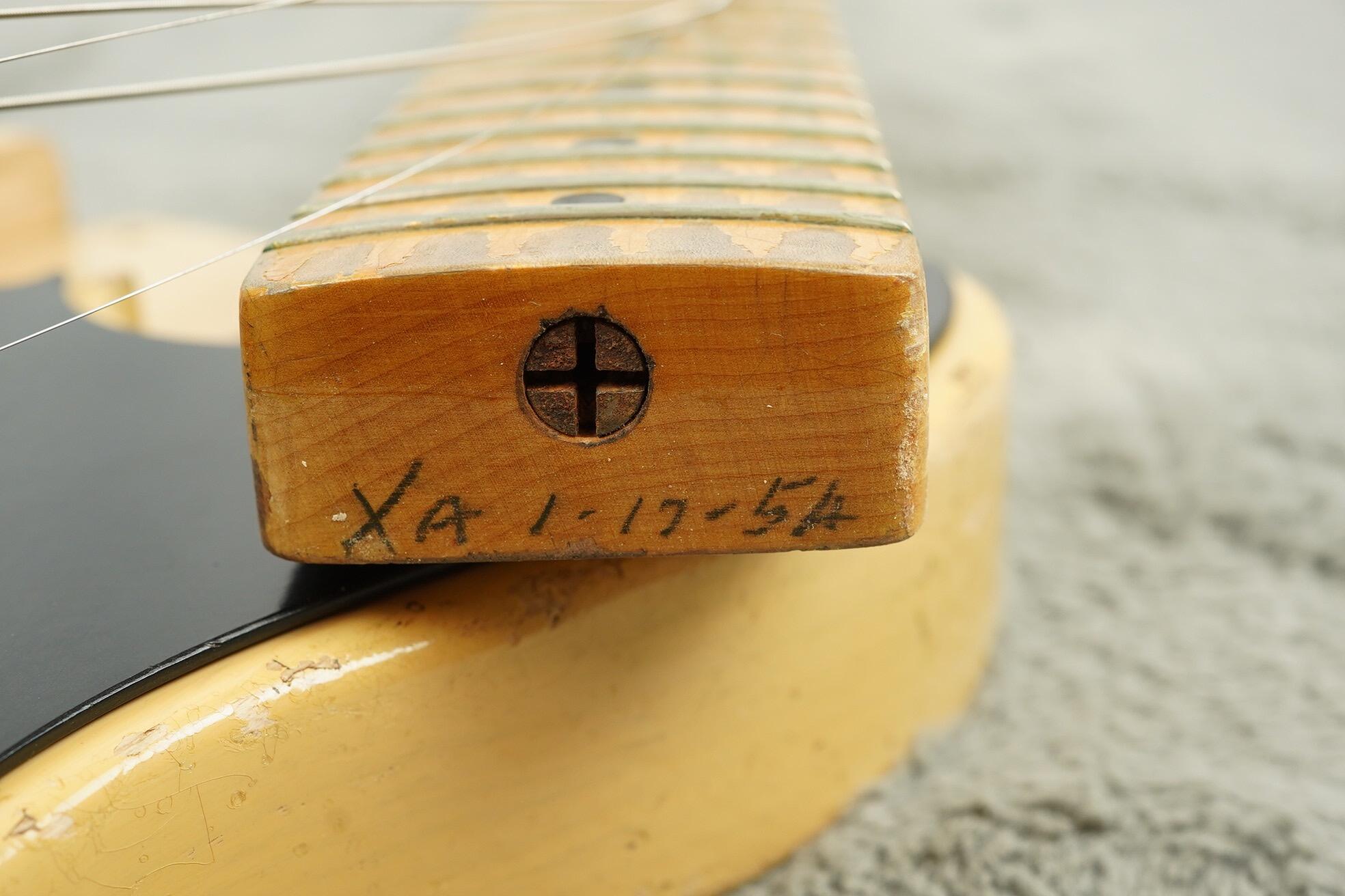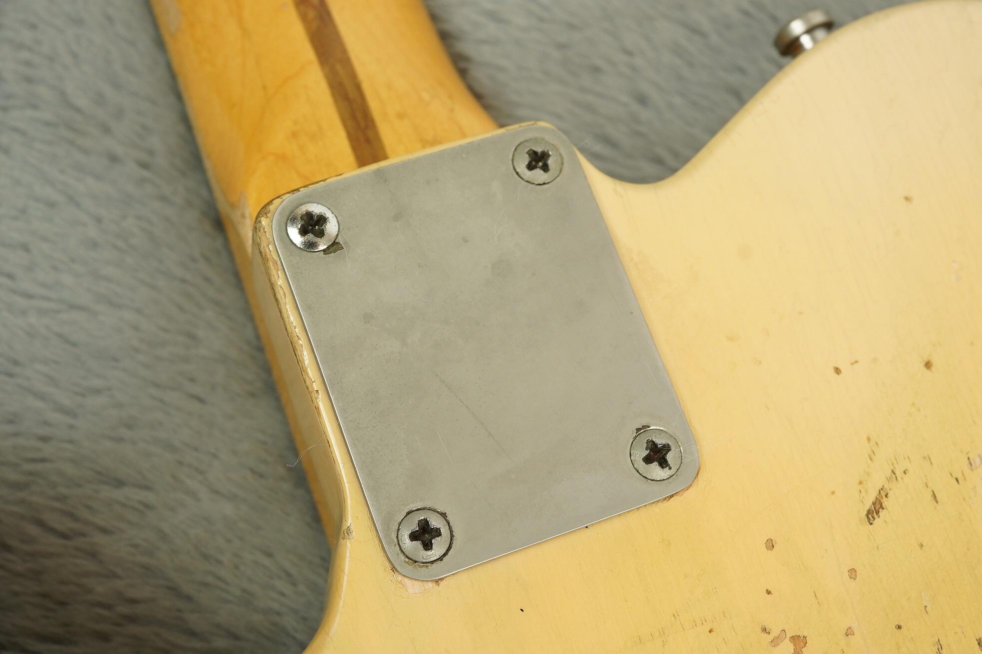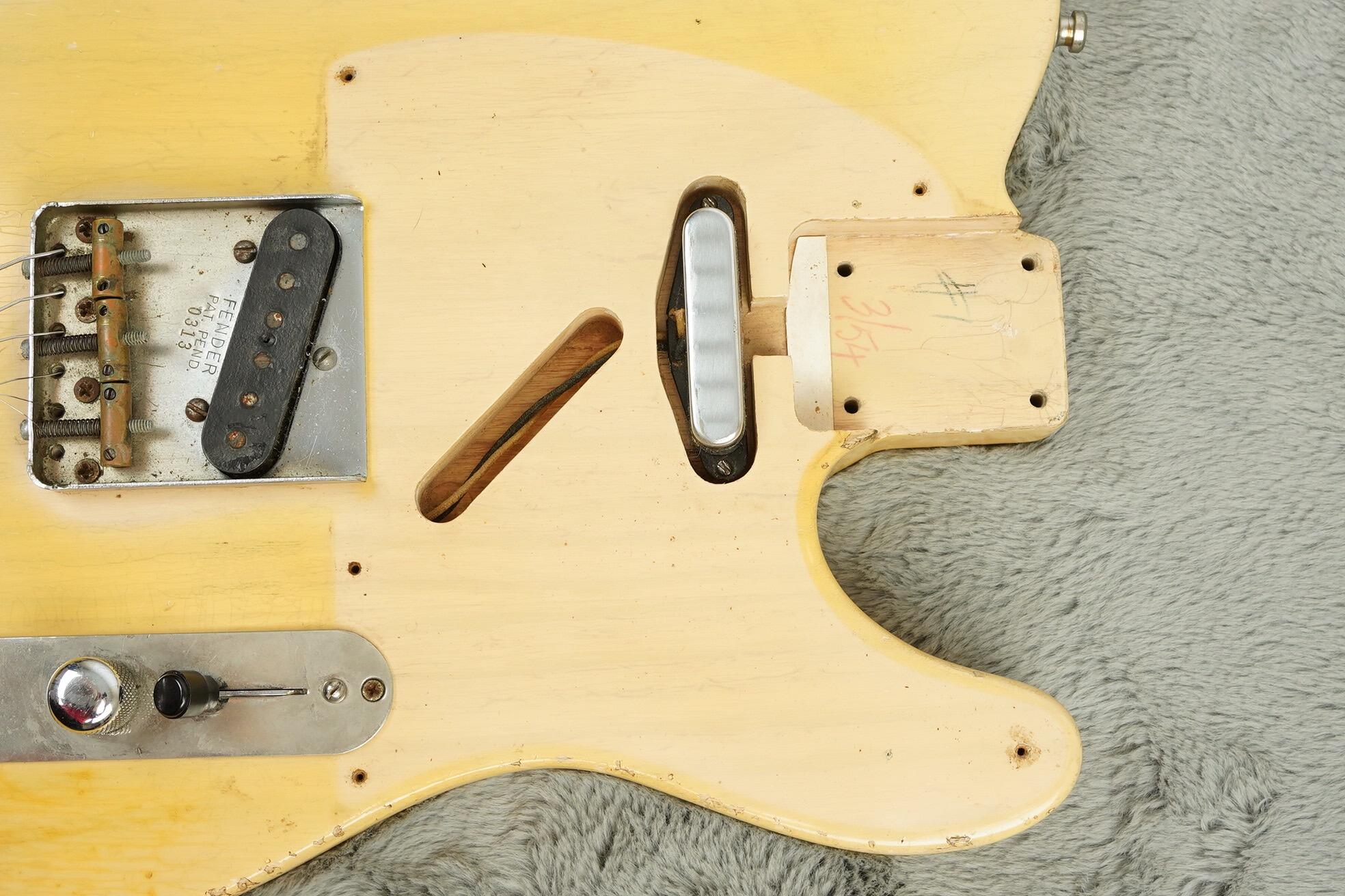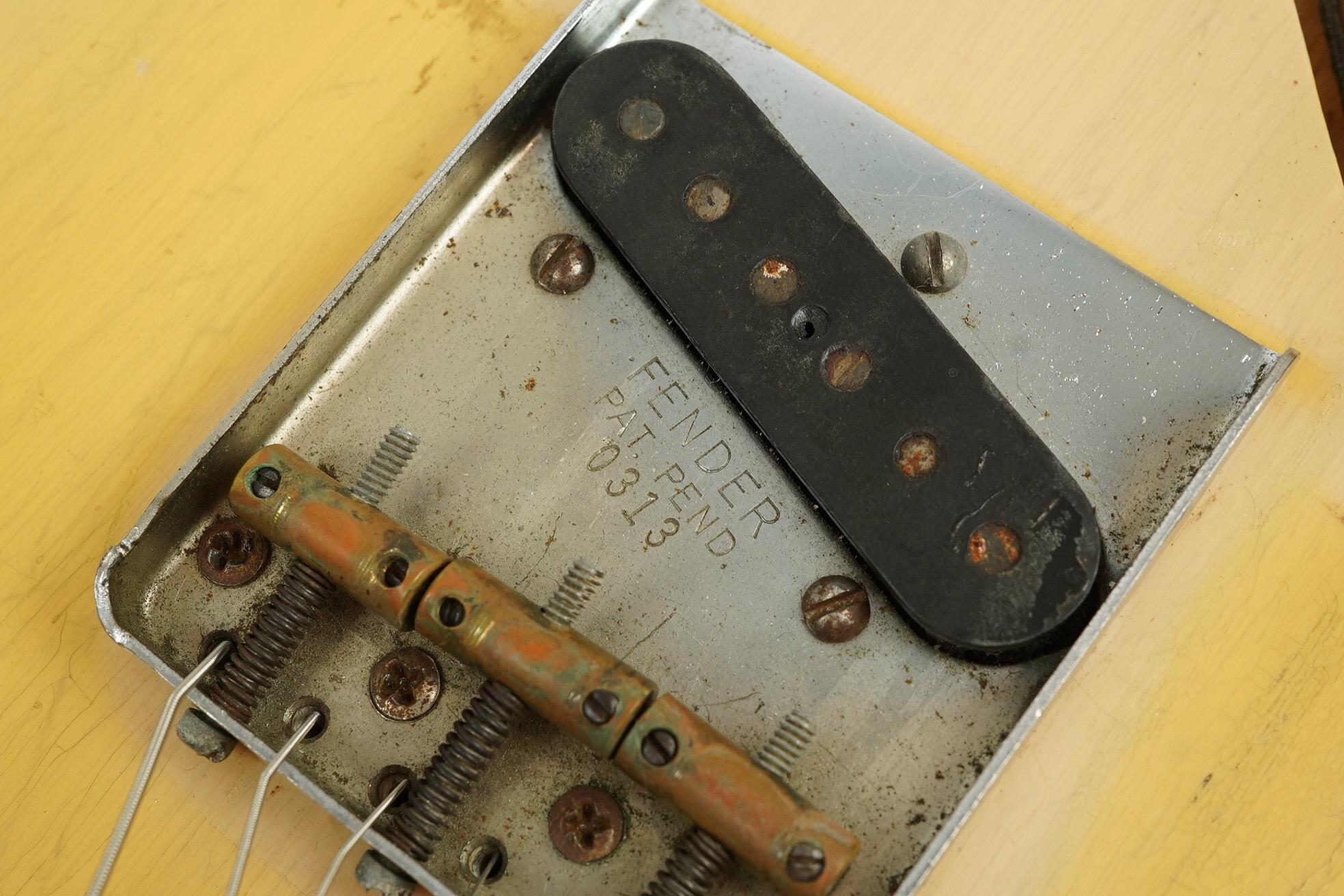 Tuners are '56-'58 Single Line Klusons, the bridge plate is correct and of Nocaster period with serial number 0313, pickups are '50s as is the switch and switch tip. The volume pot dates to '65 and the tone pot is period correct of Clarostat manufacture. All other parts are aged repro.