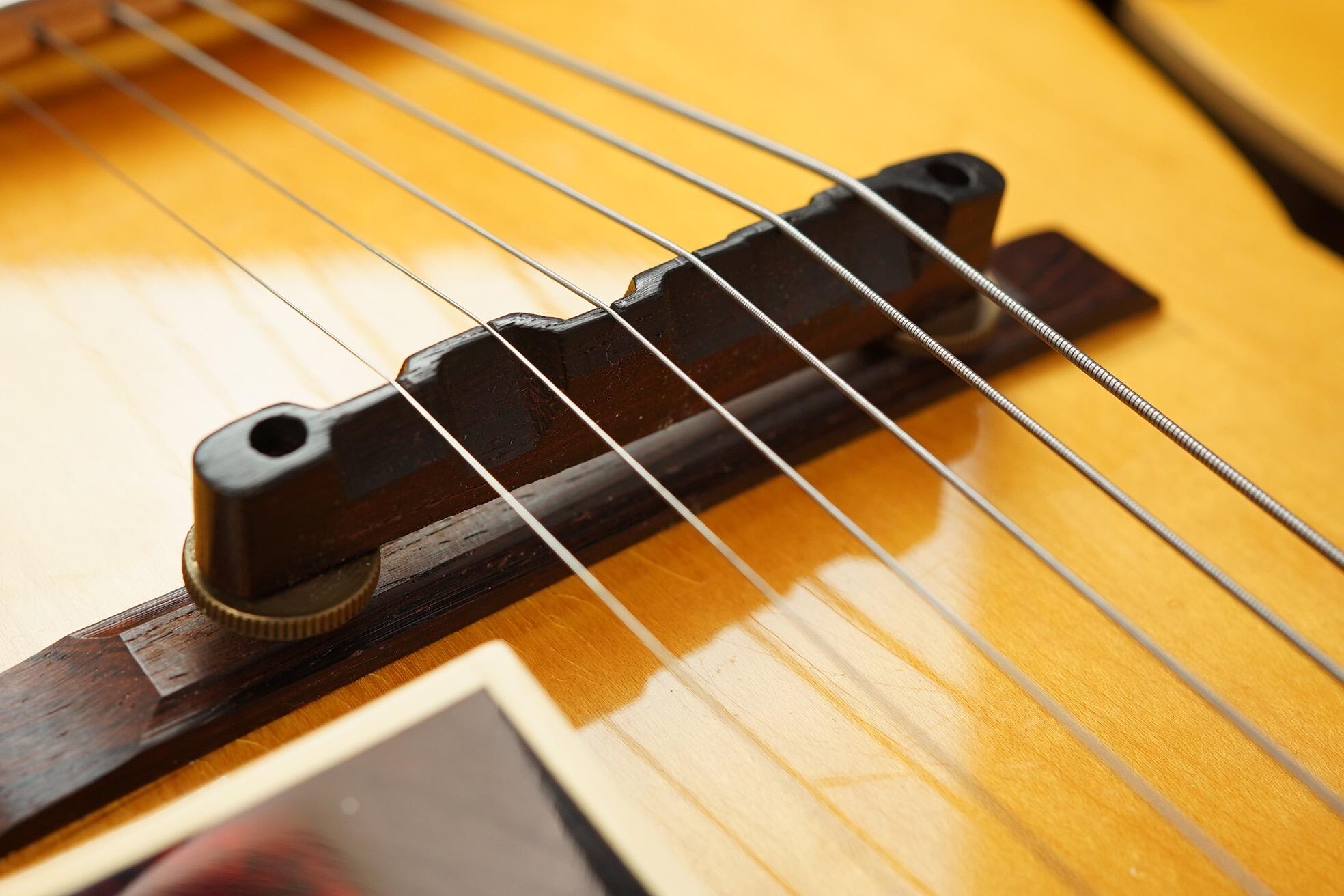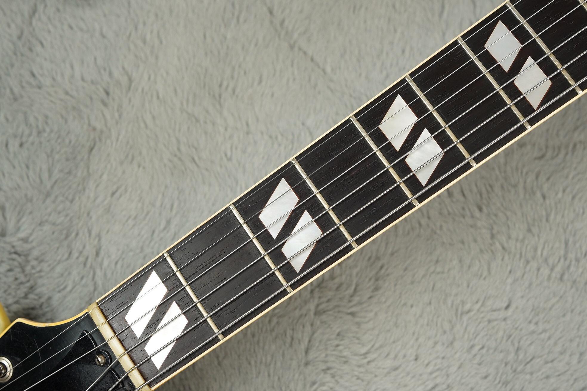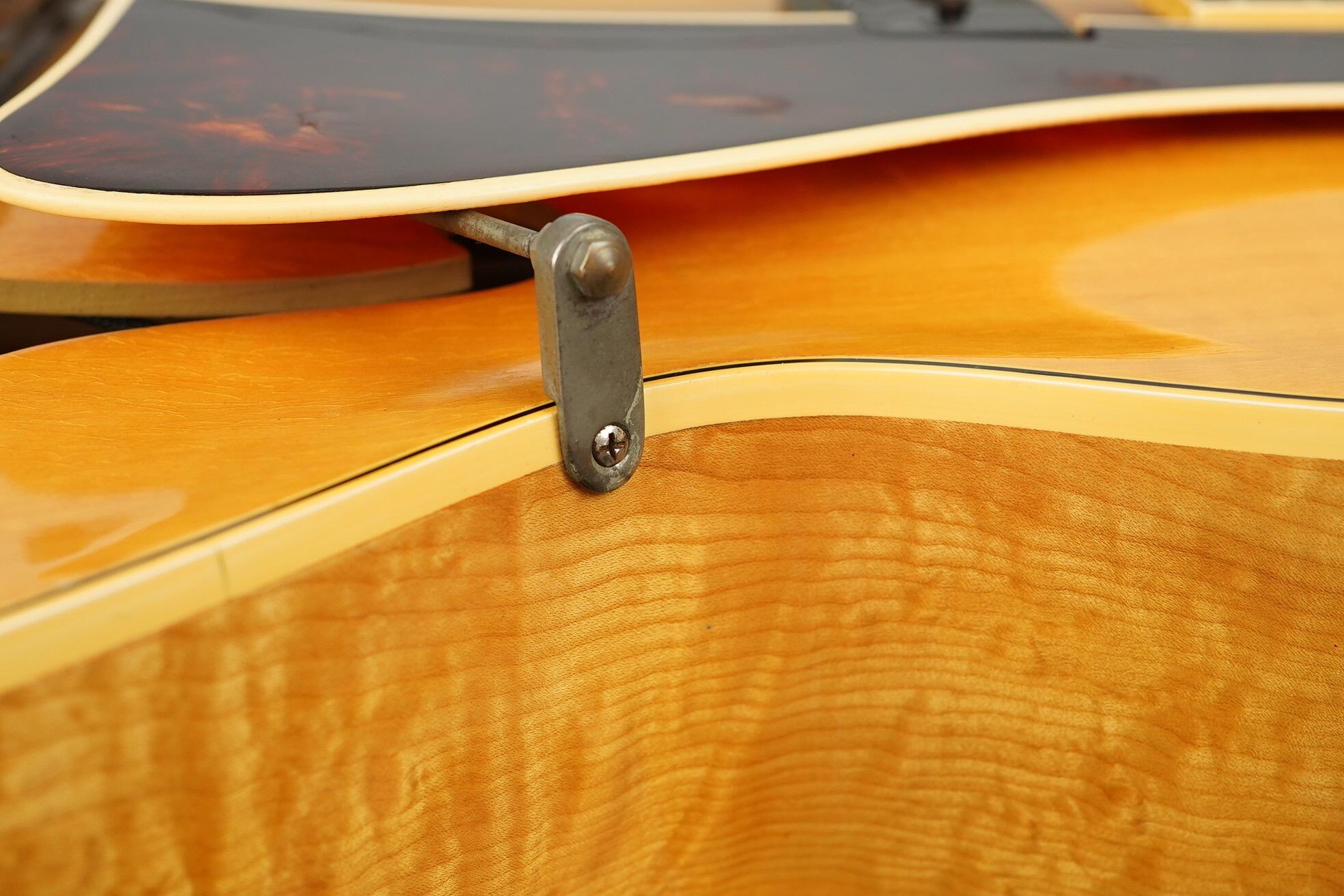 Debuting as Gibson’s premier guitar in 1940, the ES-300 went from giant diagonal pickups to the single and then double p90s before the decade was out. Post war examples are more common with this one from 1948 exhibiting the all new Gibson logo as the company moved towards the new decade. Other features include the f hole Kluson tailpiece, a unique feature to this model and only seen for a few months in 1947/48. This model would also be the last to feature open gear tuners and a bound pickguard.